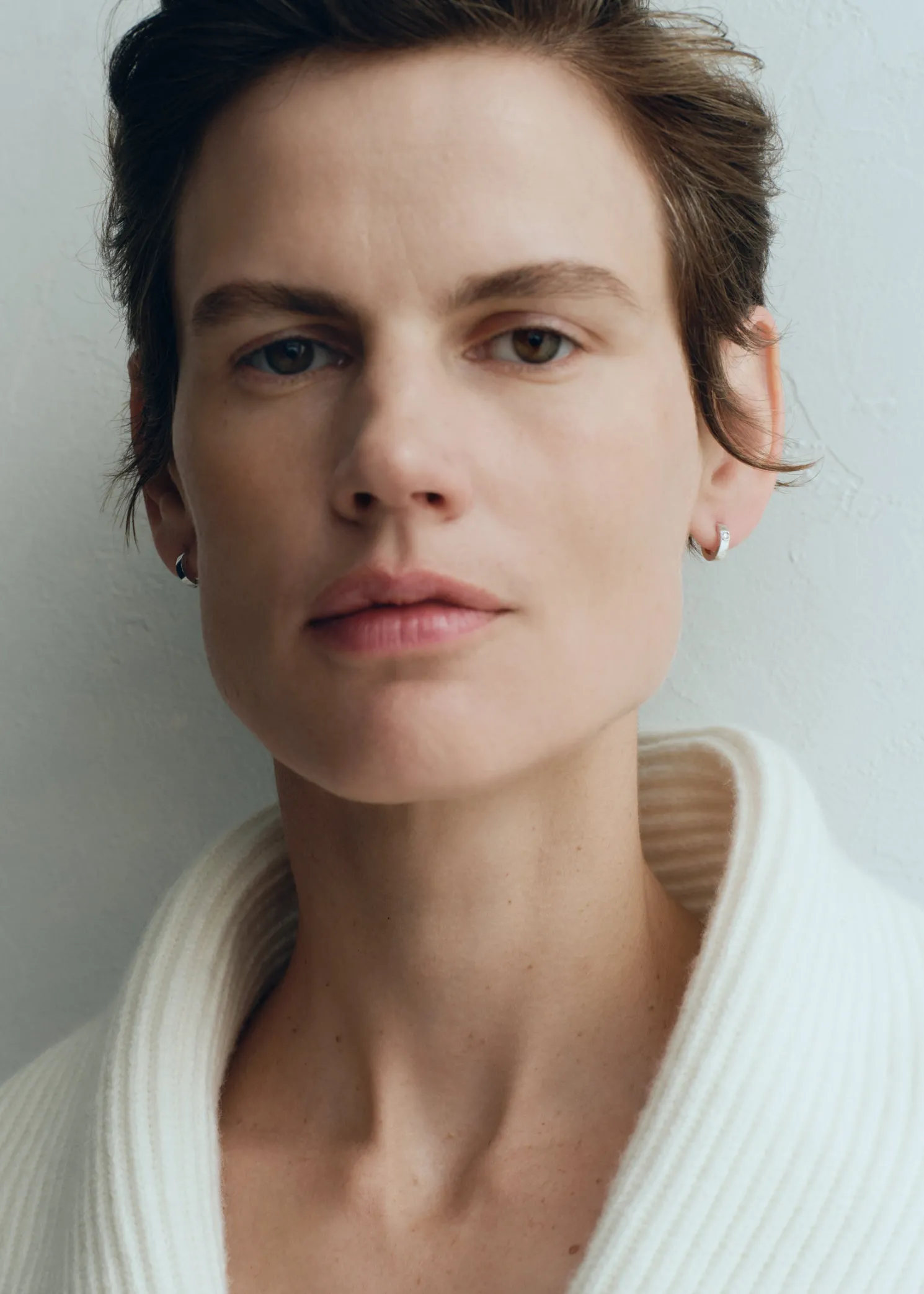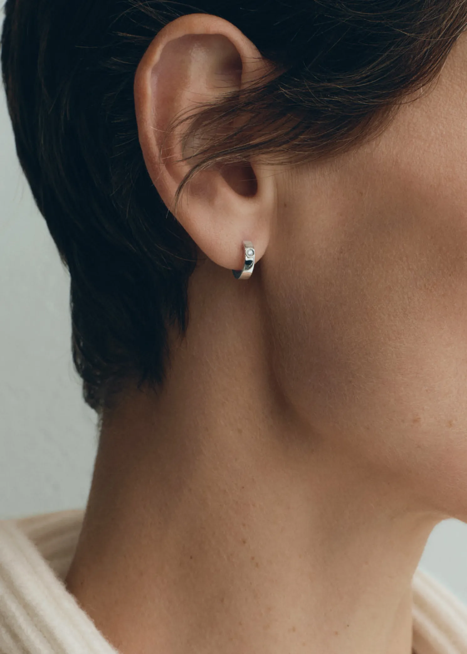 TOTEME huggy hoops accented with a single 0.014-carat diamond set into one hoop with a meticulous bezel setting. They are Italian-crafted from recycled 18kt white gold blended with hard-wearing palladium and fasten with an effortless hinged mechanism.