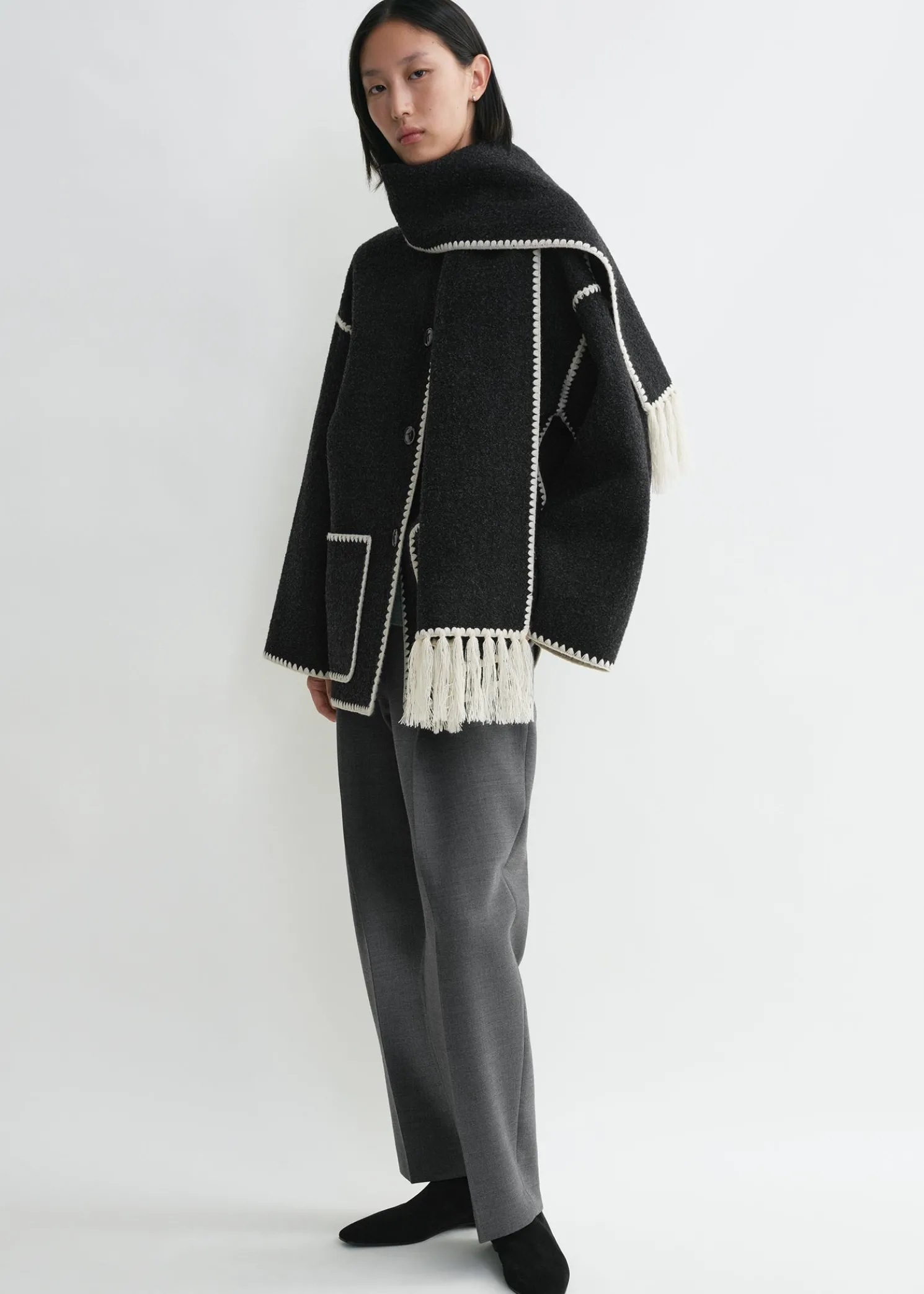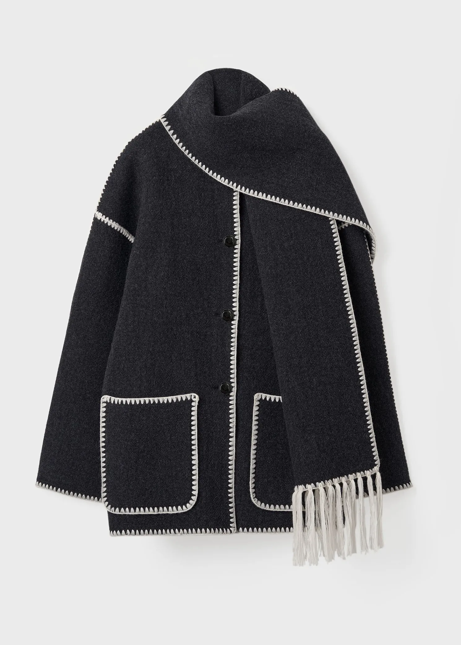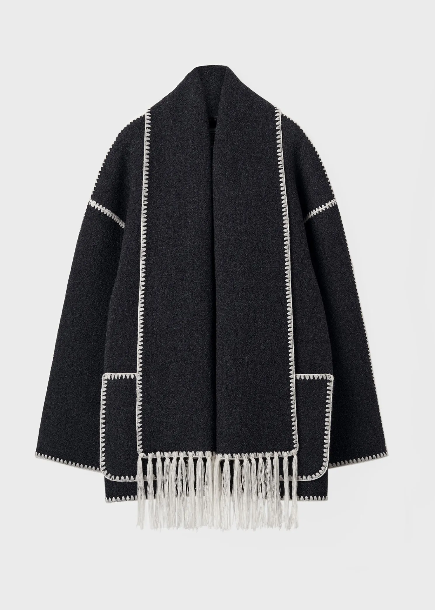 nnTOTEME coat jacket with an attached scarf embroidered along the edges for an artisanal finish. It is made from heavy and structured wool-blend felt certified by the Responsible Wool Standard and designed for an oversized fit with dropped shoulders, wide sleeves with slits, and patch pockets. Complement the hip-grazing length with straight trousers.