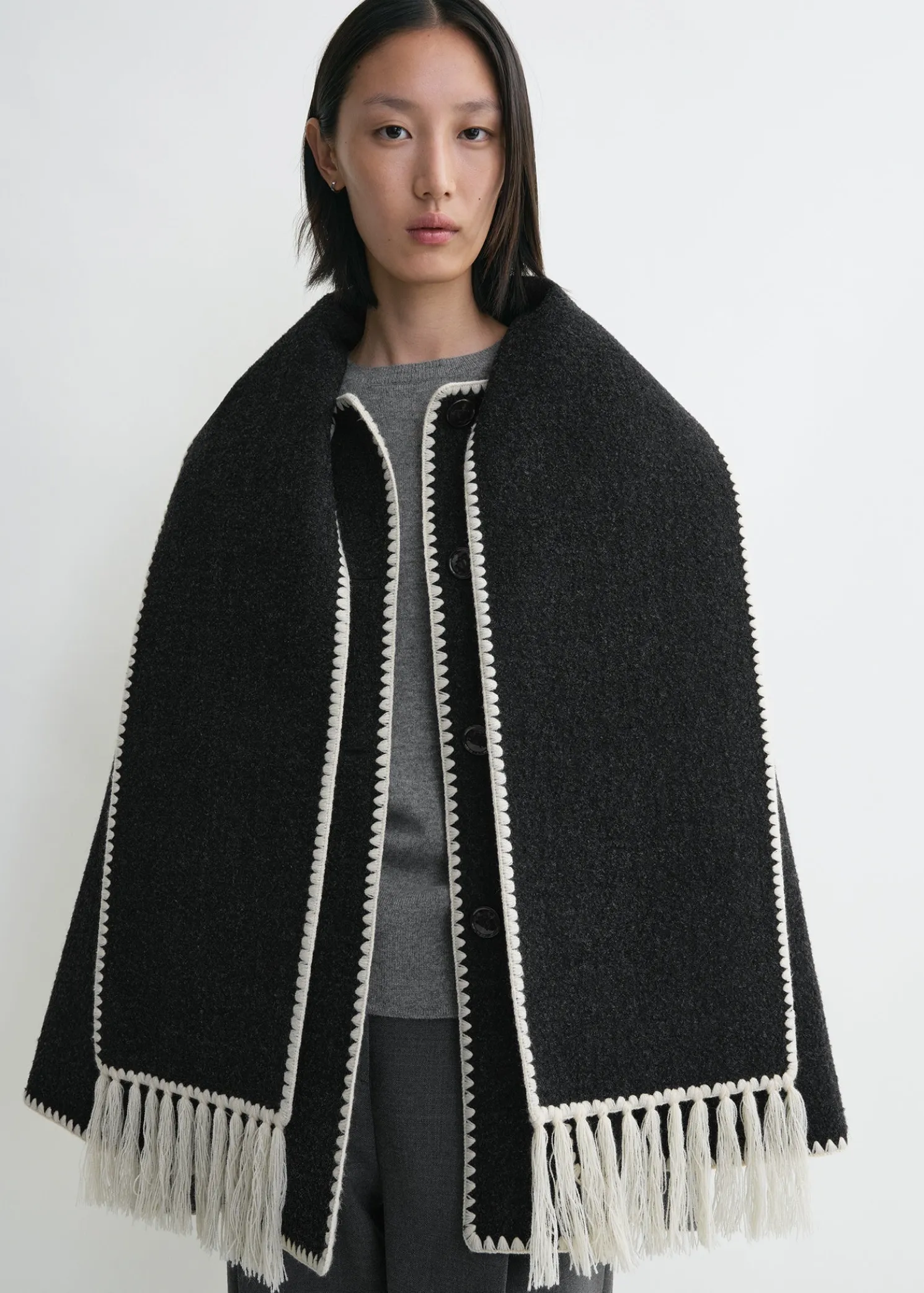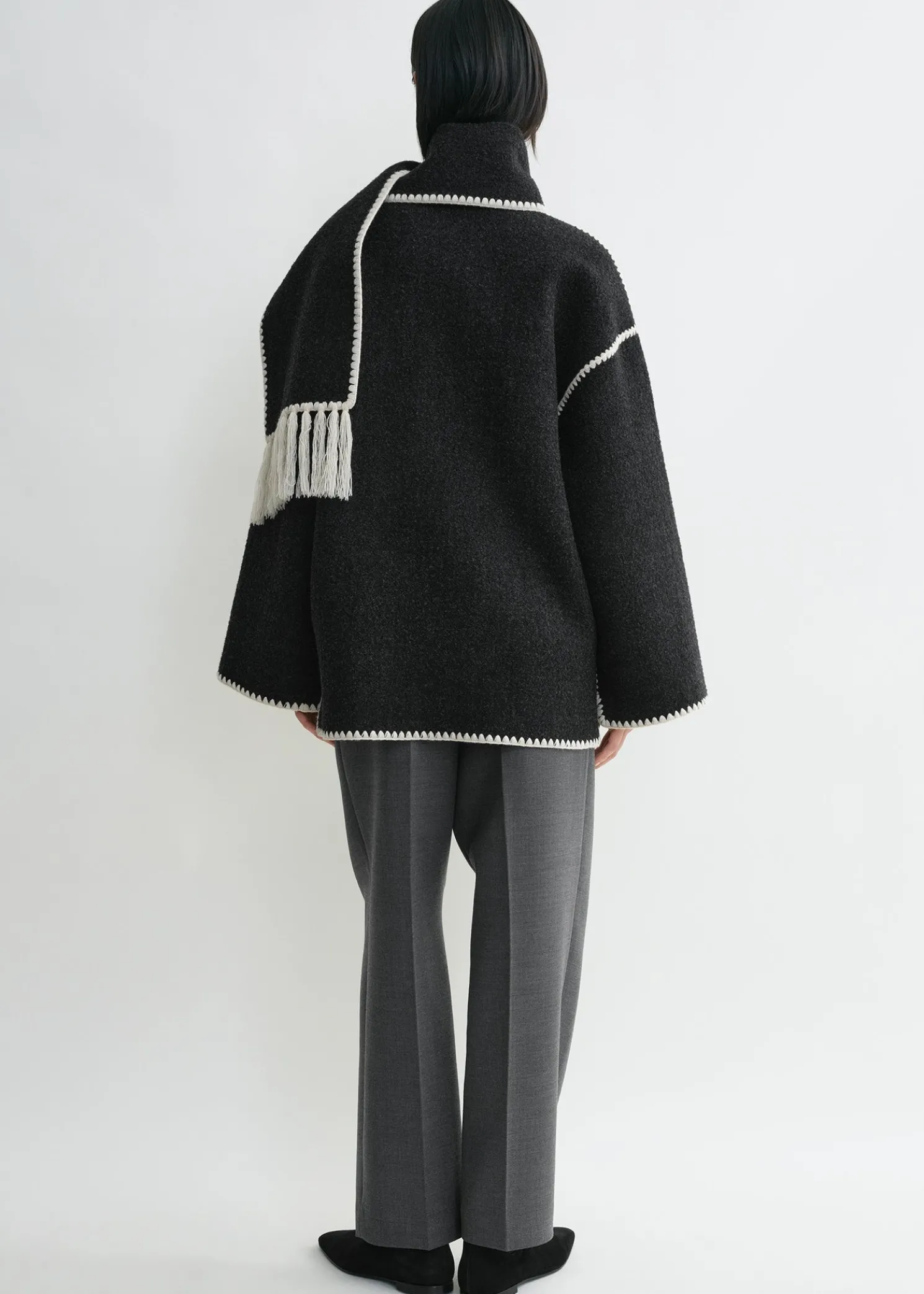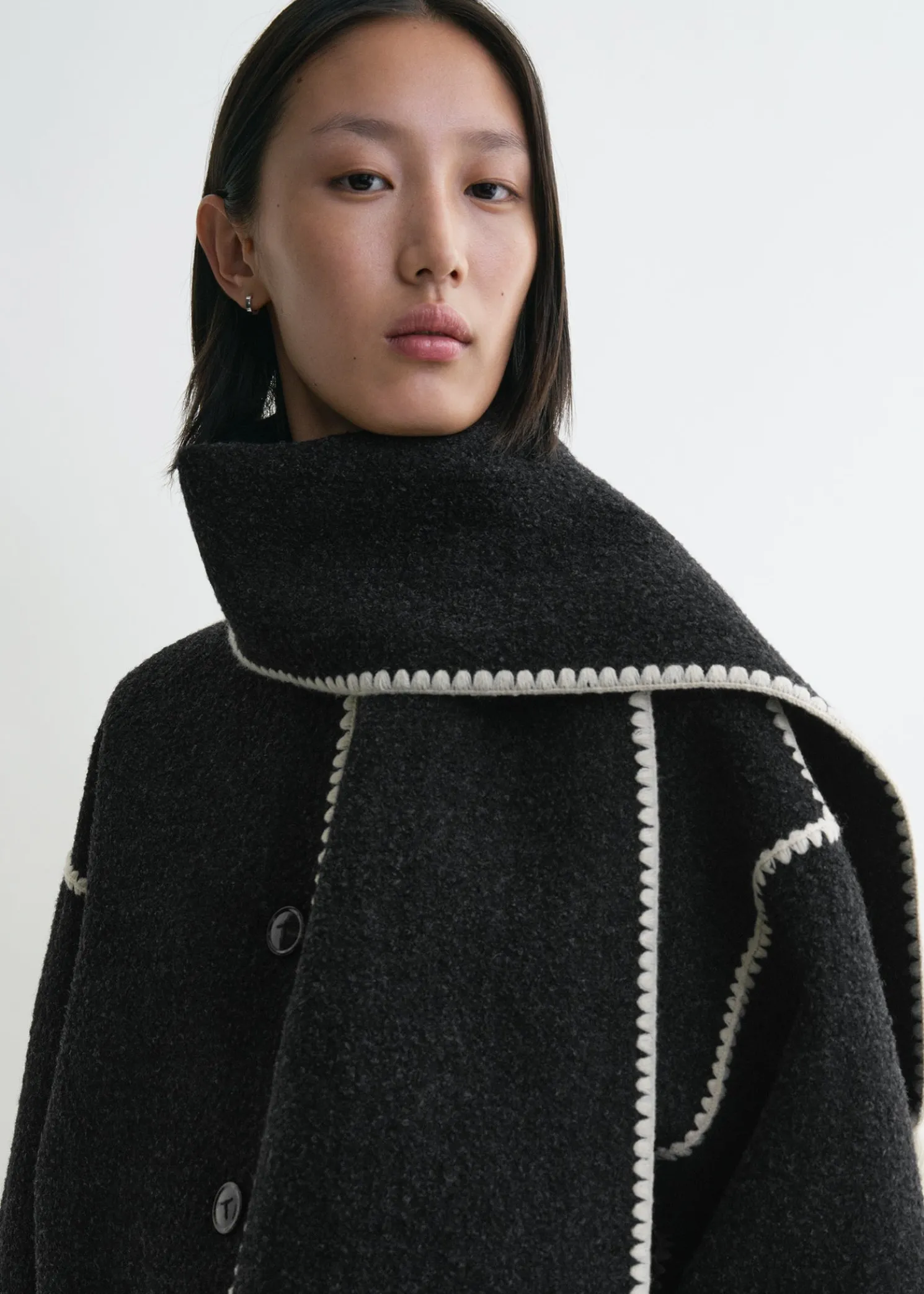 nnTOTEME coat jacket with an attached scarf embroidered along the edges for an artisanal finish. It is made from heavy and structured wool-blend felt certified by the Responsible Wool Standard and designed for an oversized fit with dropped shoulders, wide sleeves with slits, and patch pockets. Complement the hip-grazing length with straight trousers.