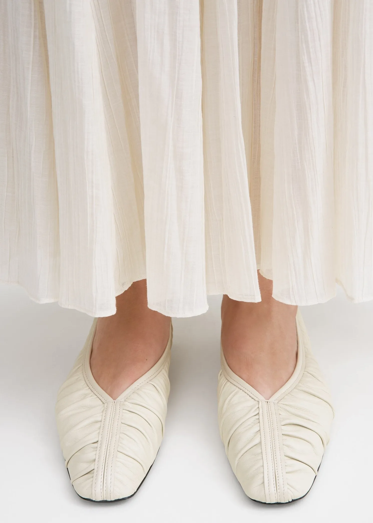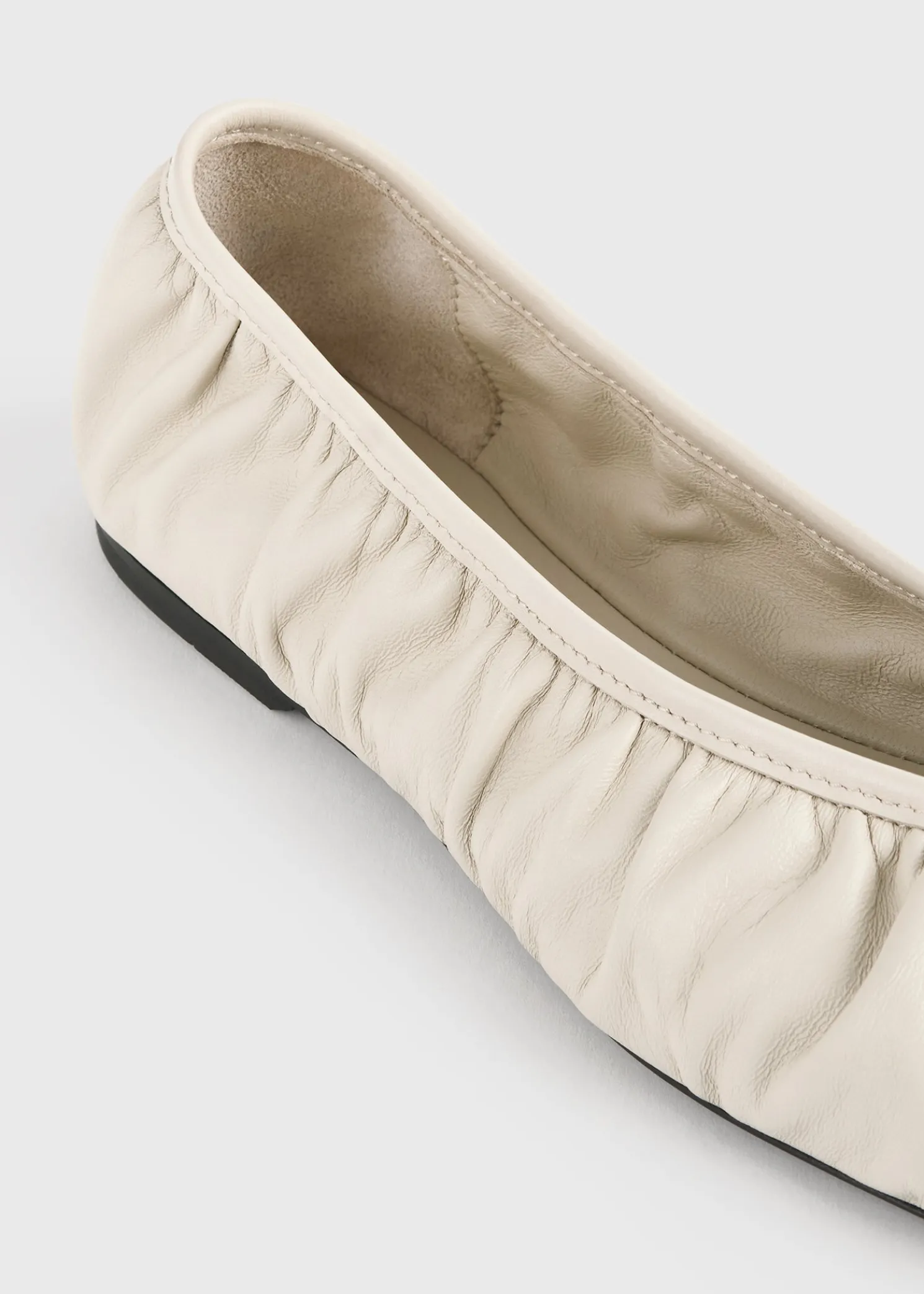 TOTEME flats reminiscent of ballerina pointes and gathered along the top for volume and texture. They are made in Italy from supple, double-faced Napa leather with a soft suede insert to protect the heel from chafing. Let them stand out below a midi skirt.