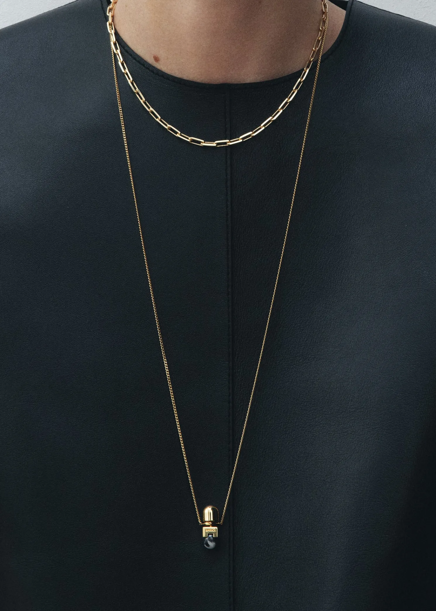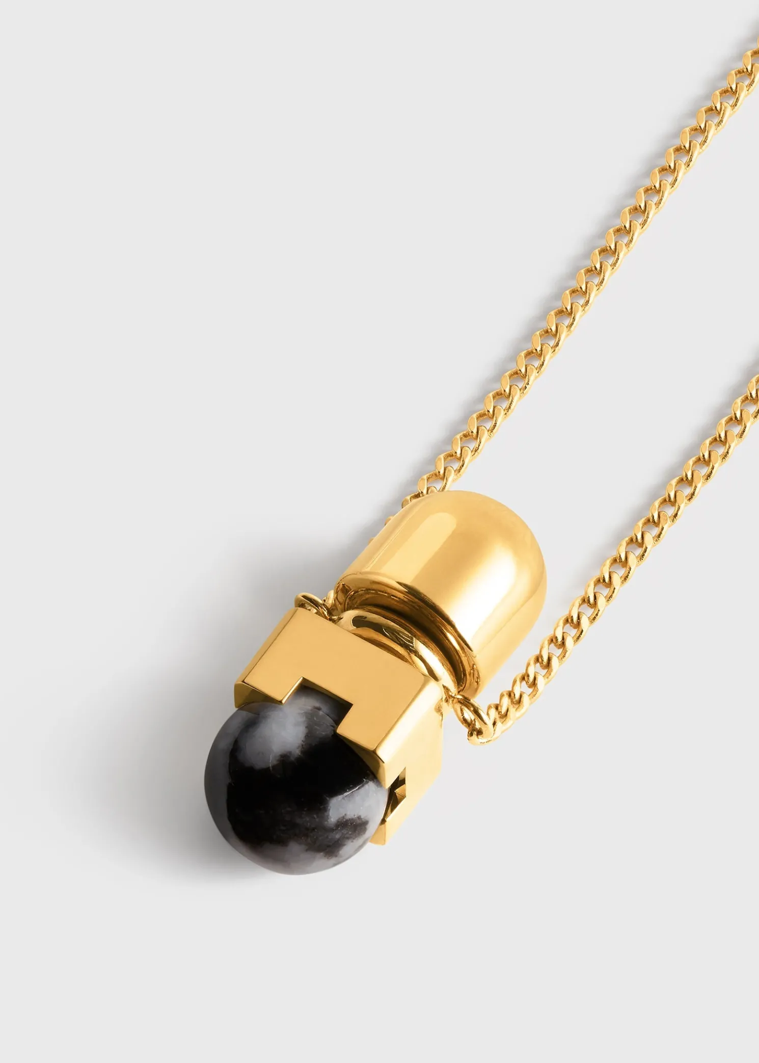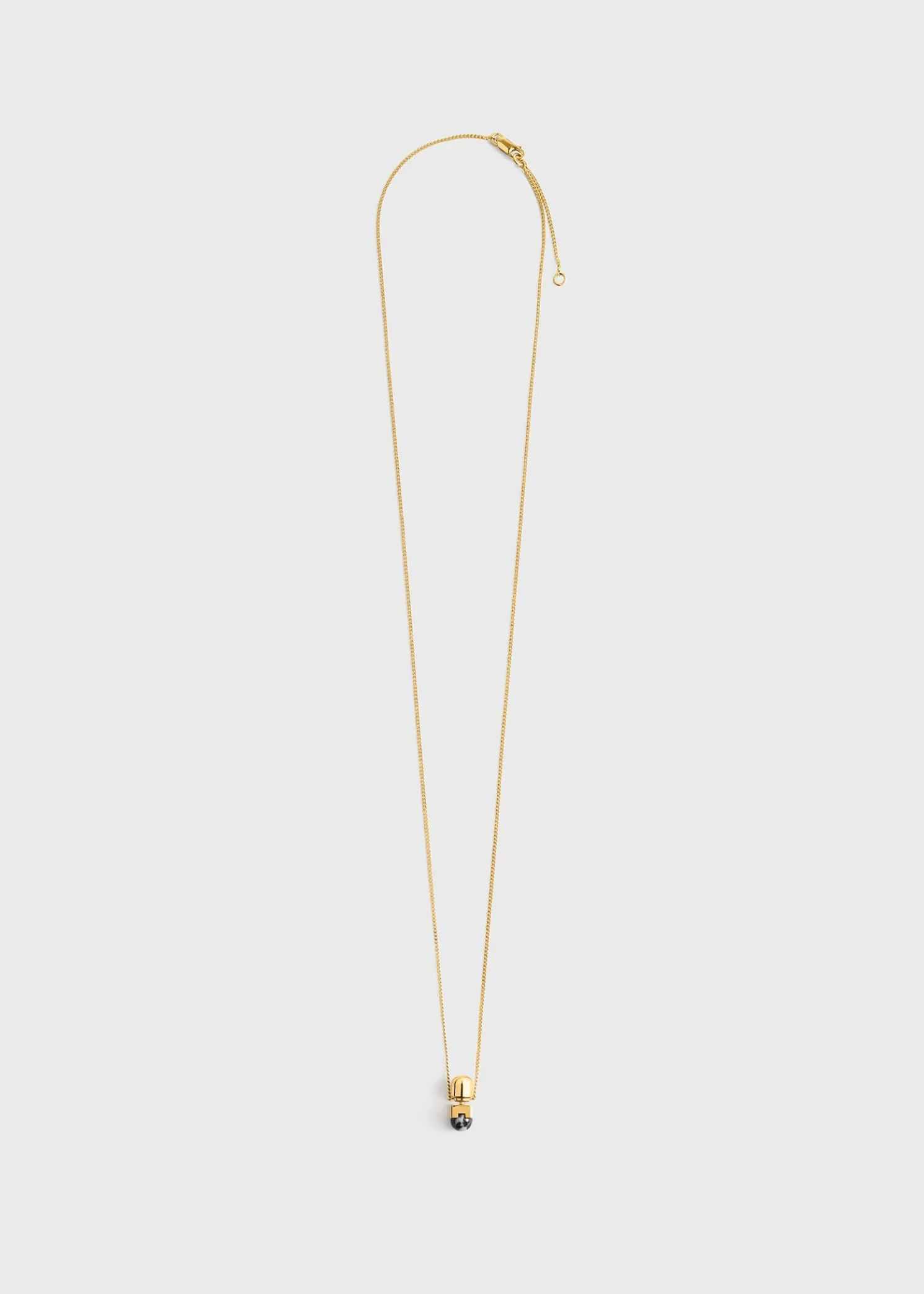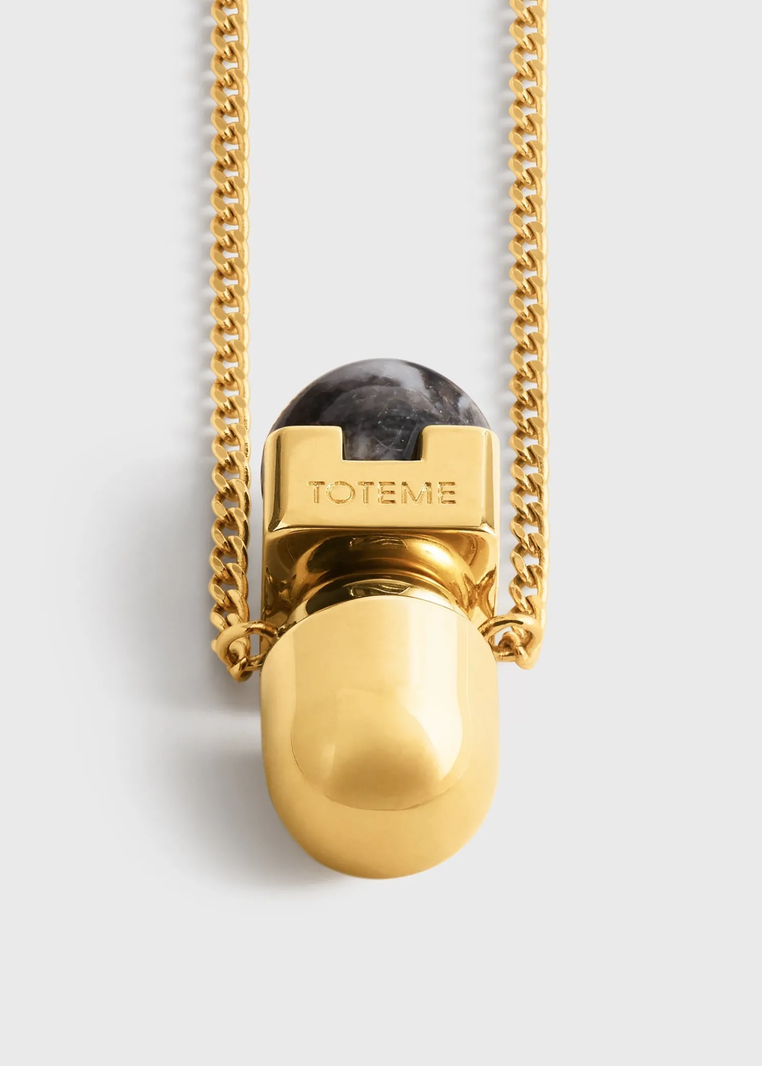 TOTEME necklace featuring a natural black and white jasper pendant with a vertical, mirrored shape. Made in Italy, it has a long, fine grumette chain that fastens with a toggle clasp to two lengths.