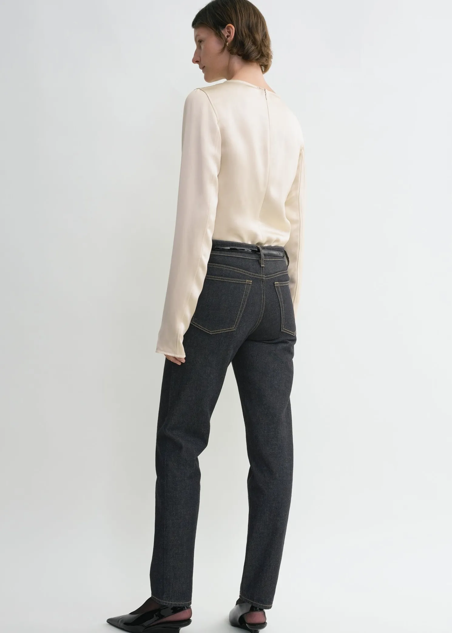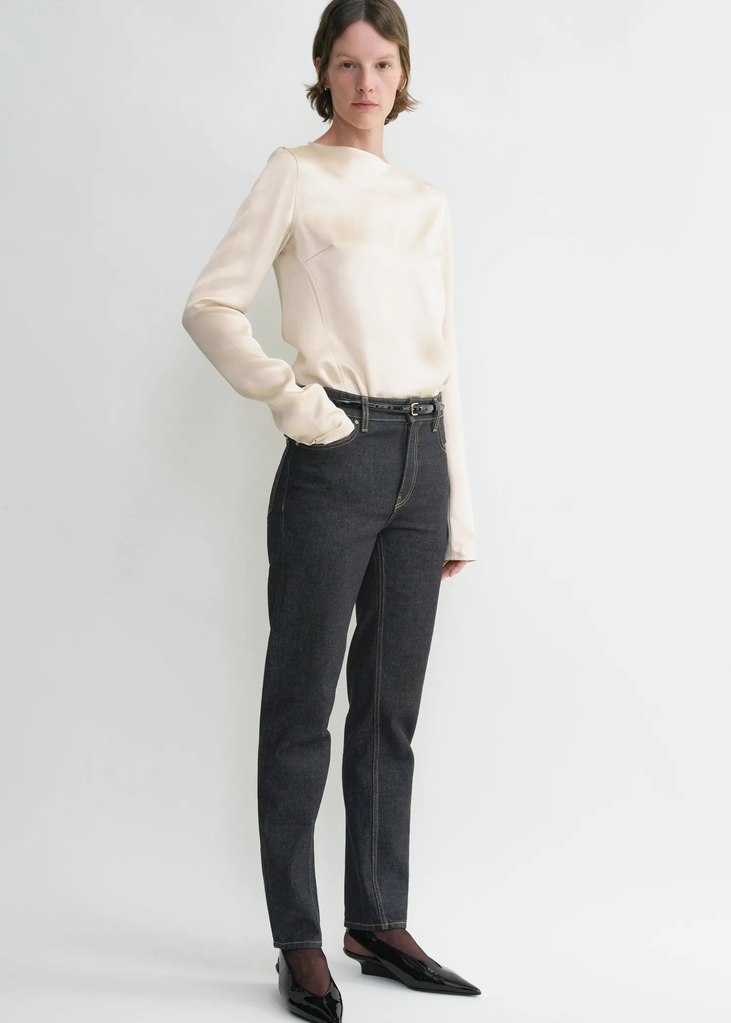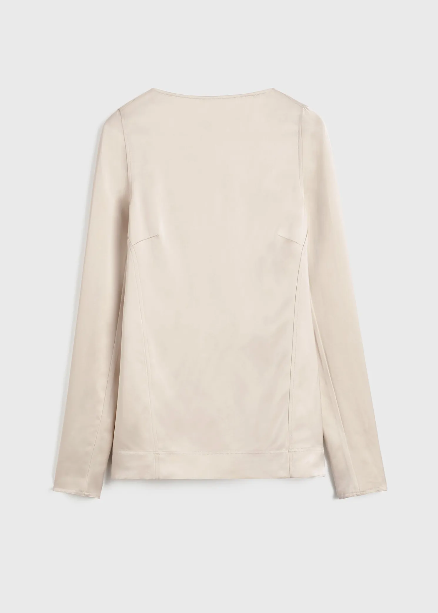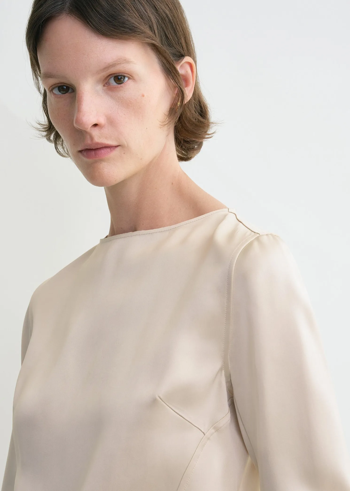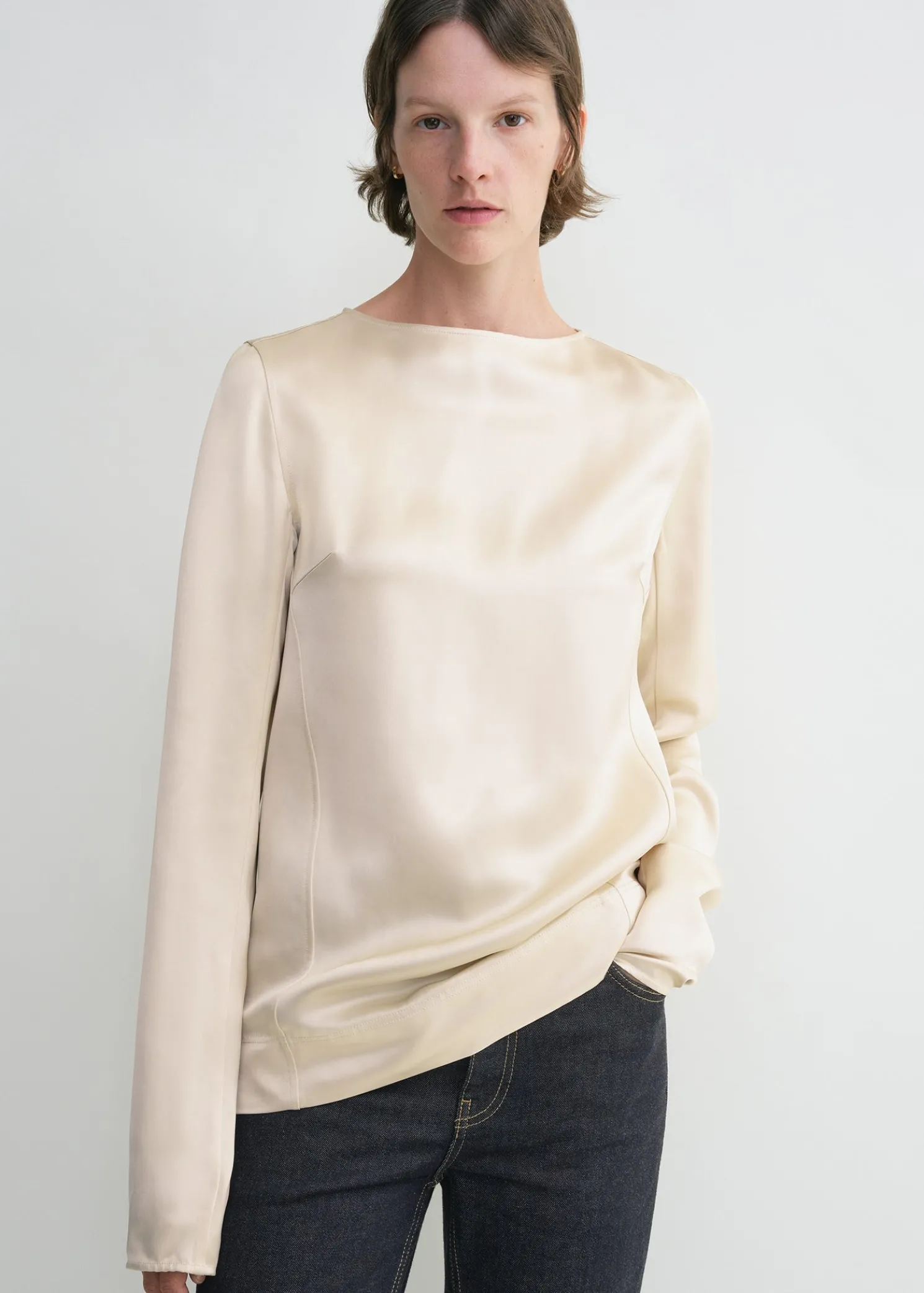 Slim TOTEME blouse top made from structured double-weave satin for a lustrous drape. It has a boat neckline and a longline silhouette constructed with signature twisted seams, then fastens with a concealed back zipper. Wear it as an evening set with matching trousers.