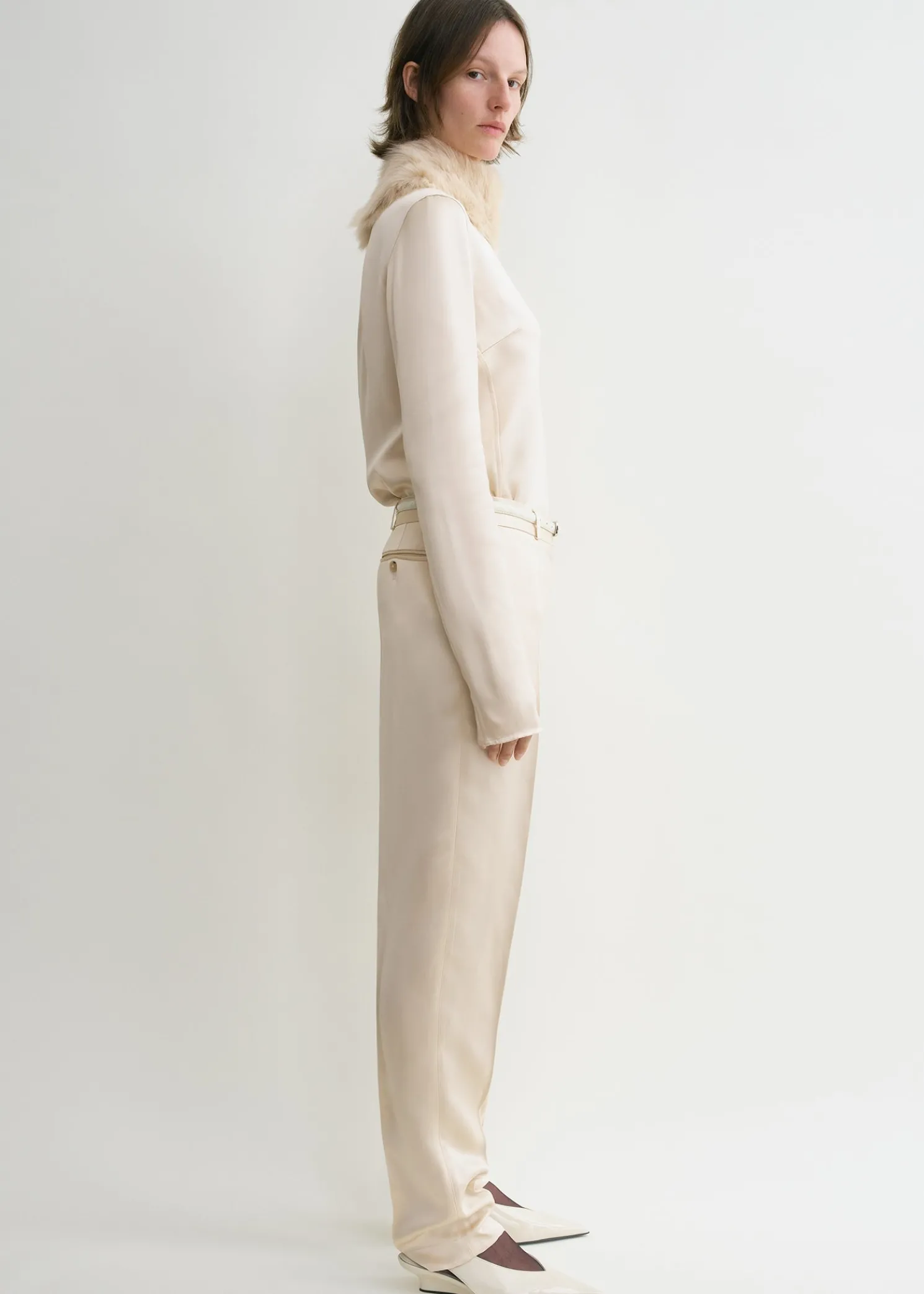 TOTEME trousers cut to a modern cigarette silhouette with a low waistline and slim, tapered legs. They are constructed from fluid double-weave satin and are fitted with belt loops, side and back pockets and a zipper fly. Add the matching top for an evening look.