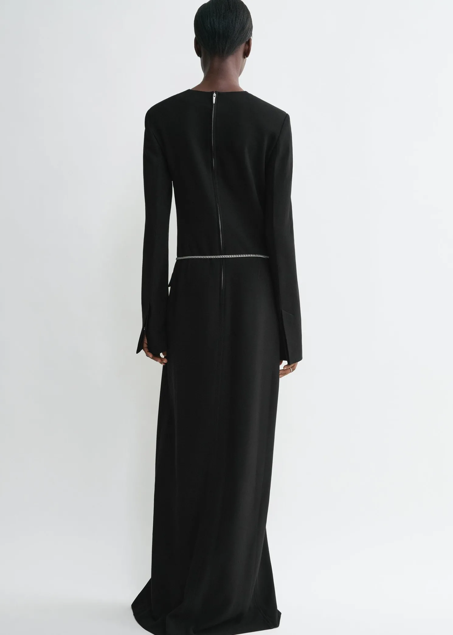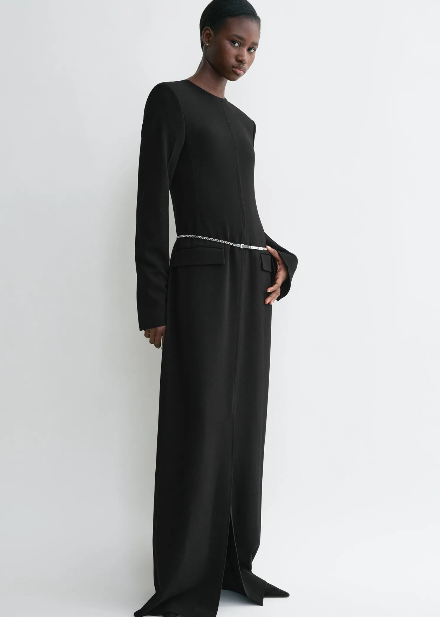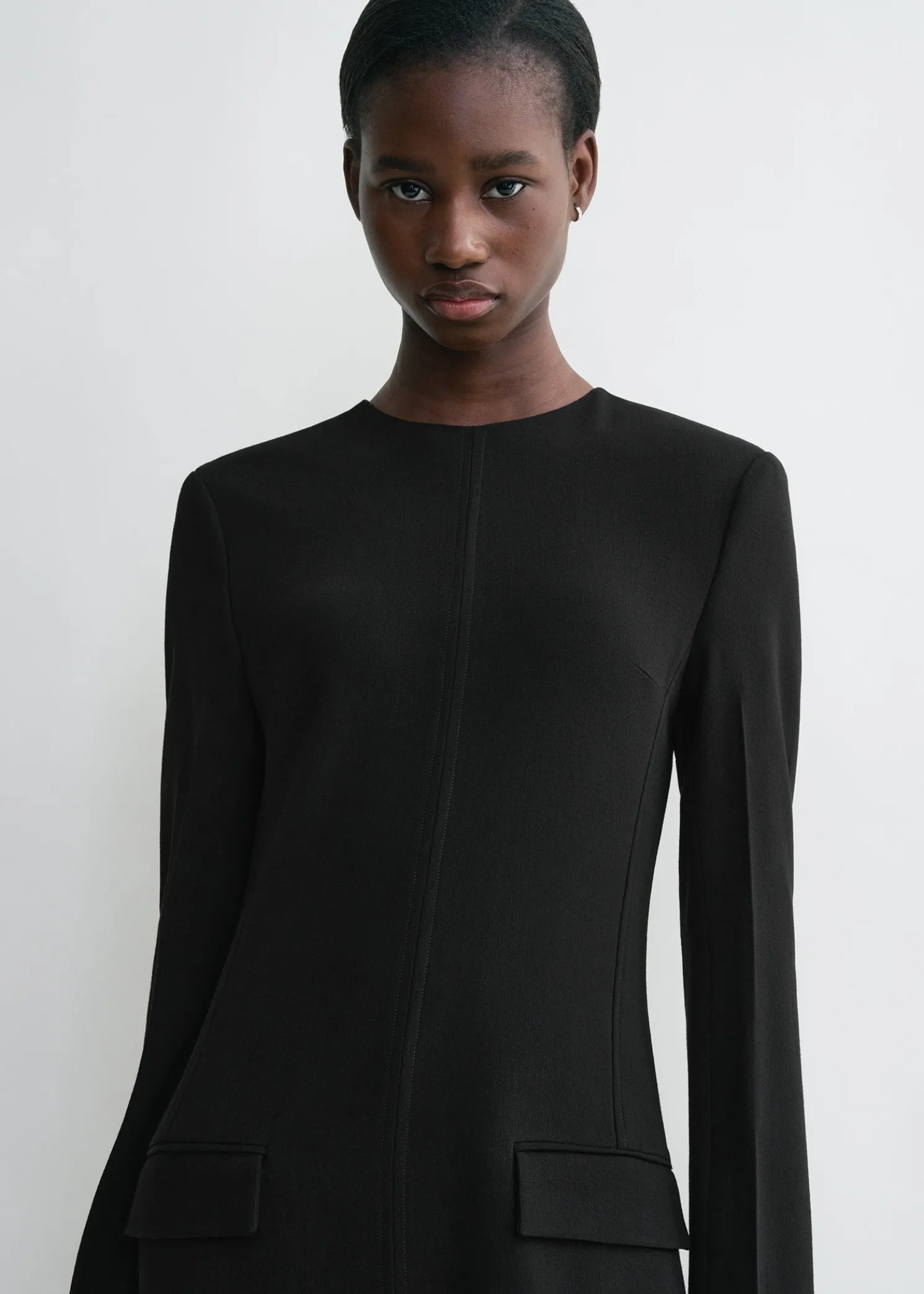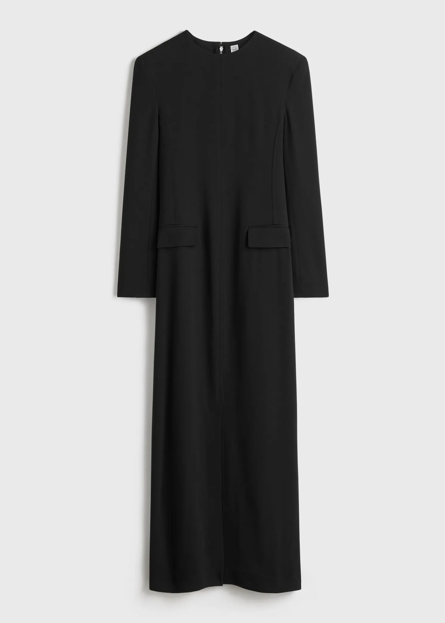 TOTEME evening dress infused with an air of effortless tailoring. Made from double crepe with a fluid, mid-weight hand, it is simply accented with two convenient flap pockets and fastens with a metal back zipper. Complement the strong-shouldered, slim silhouette with pointy boots.