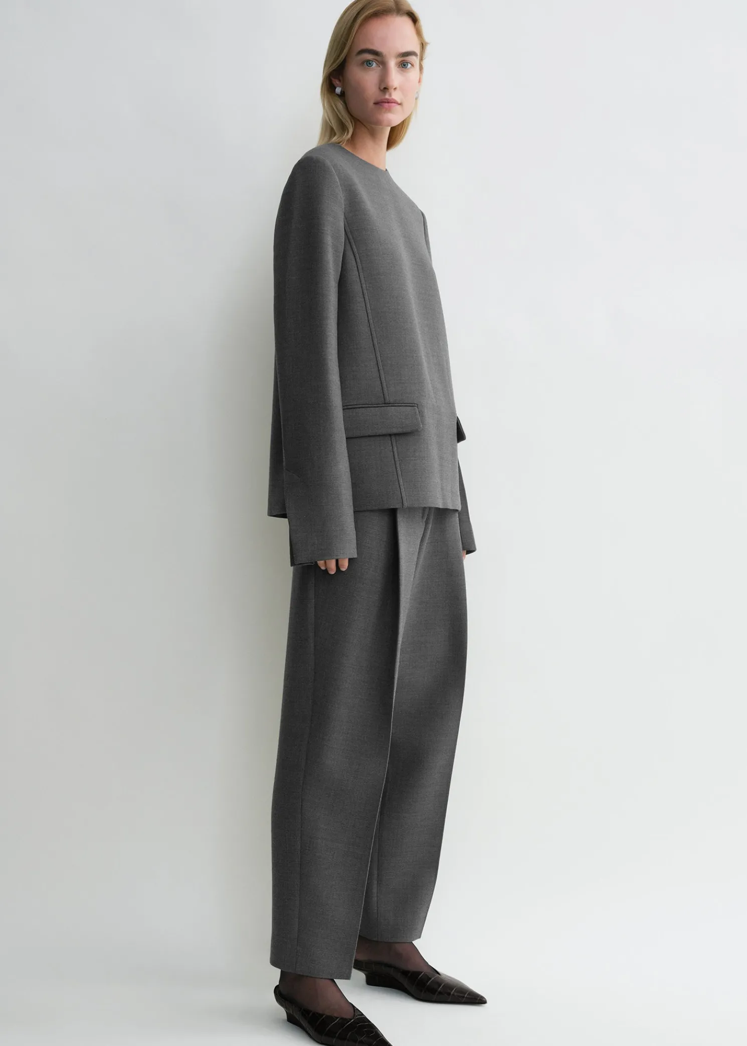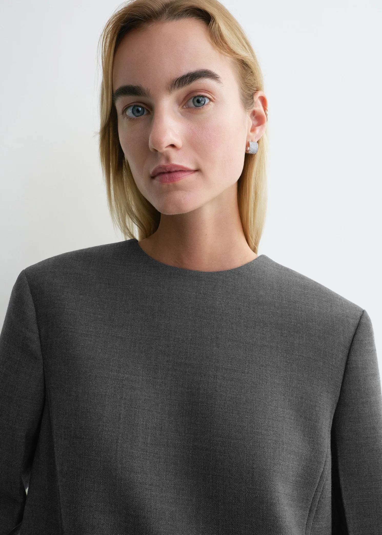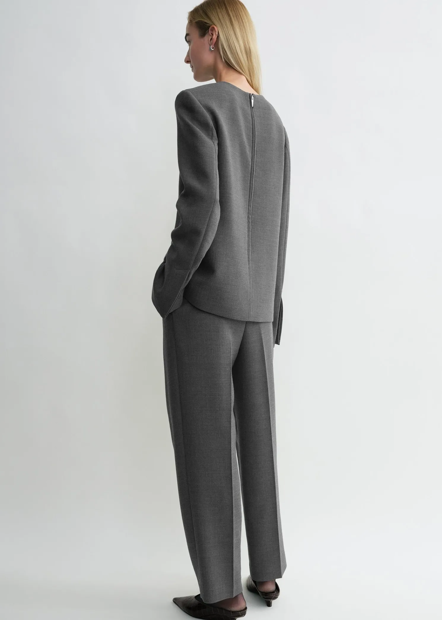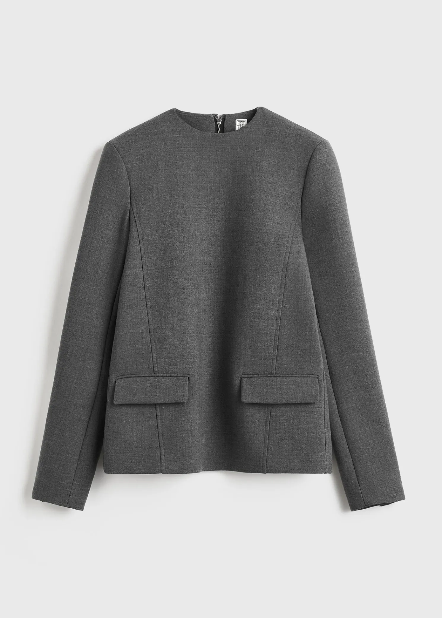 TOTEME evening top infused with an air of effortless tailoring. Made from a spongy suiting fabric with a mid-weight hand, it is simply accented with two convenient flap pockets and fastens with a metal back zipper. Wear it with coordinating trousers to a business meeting.