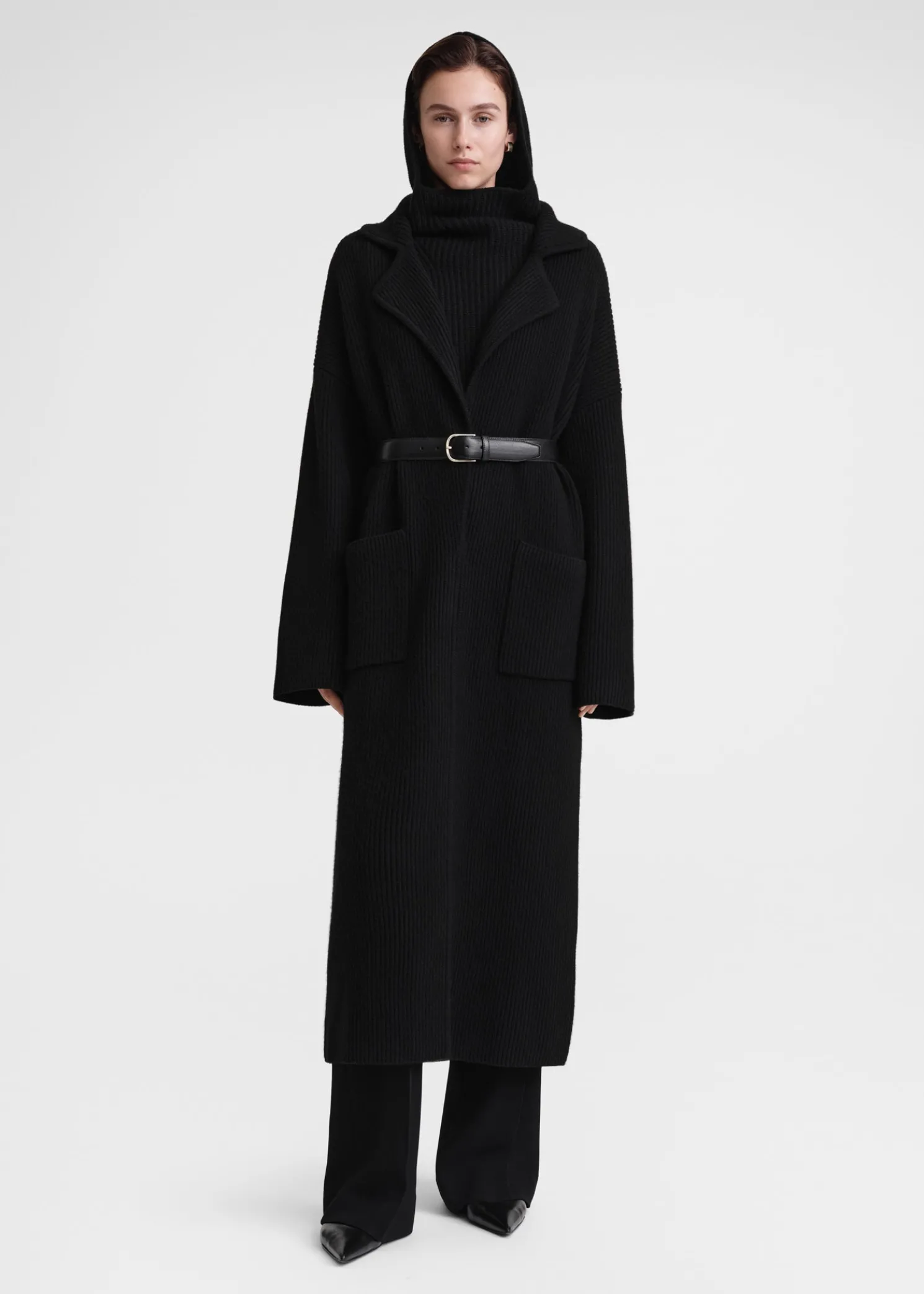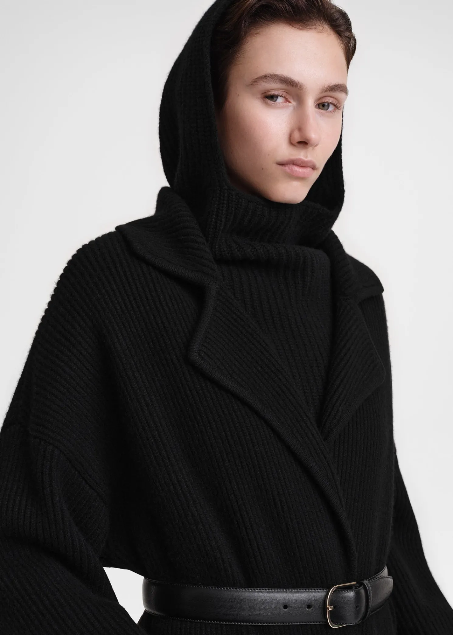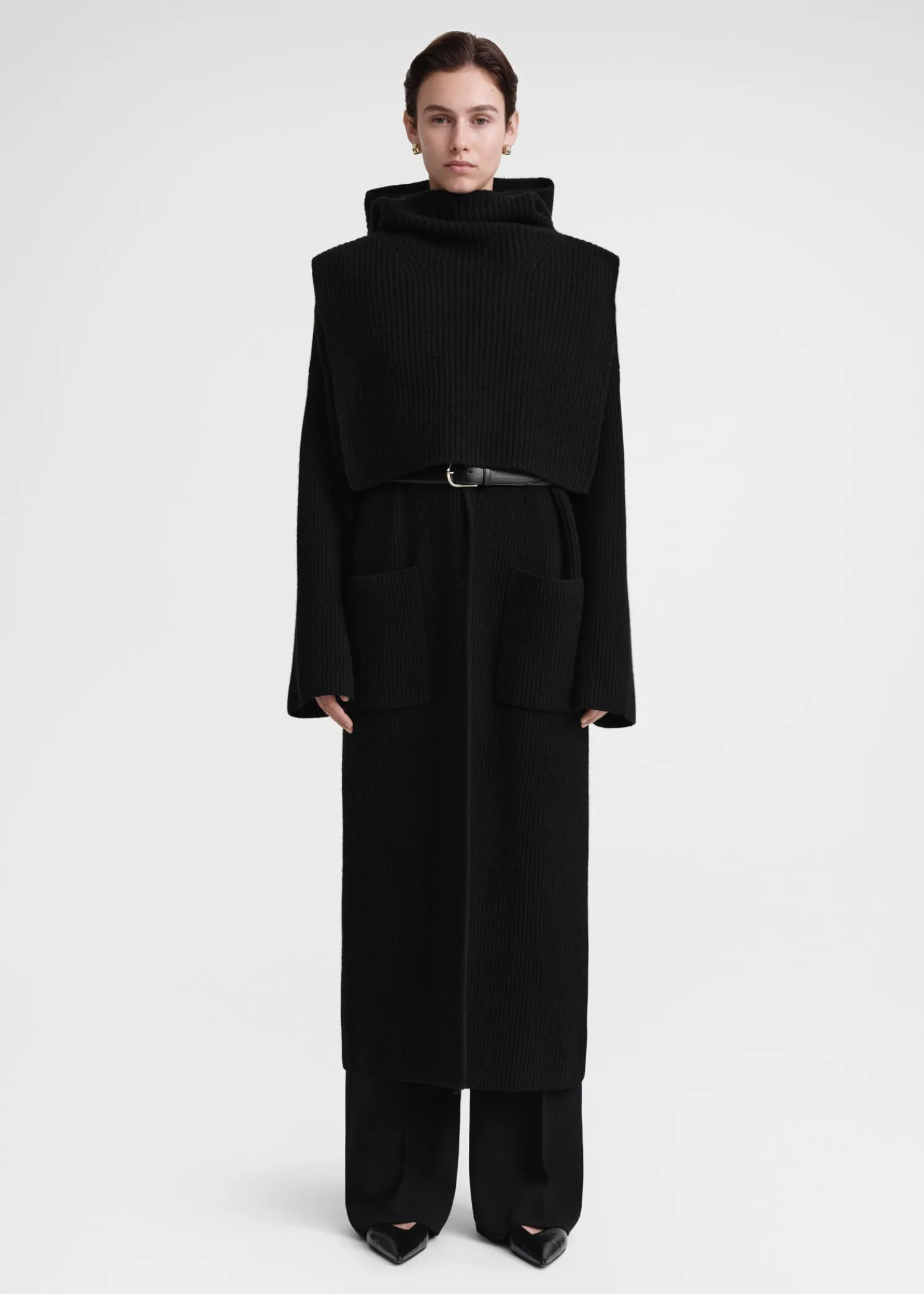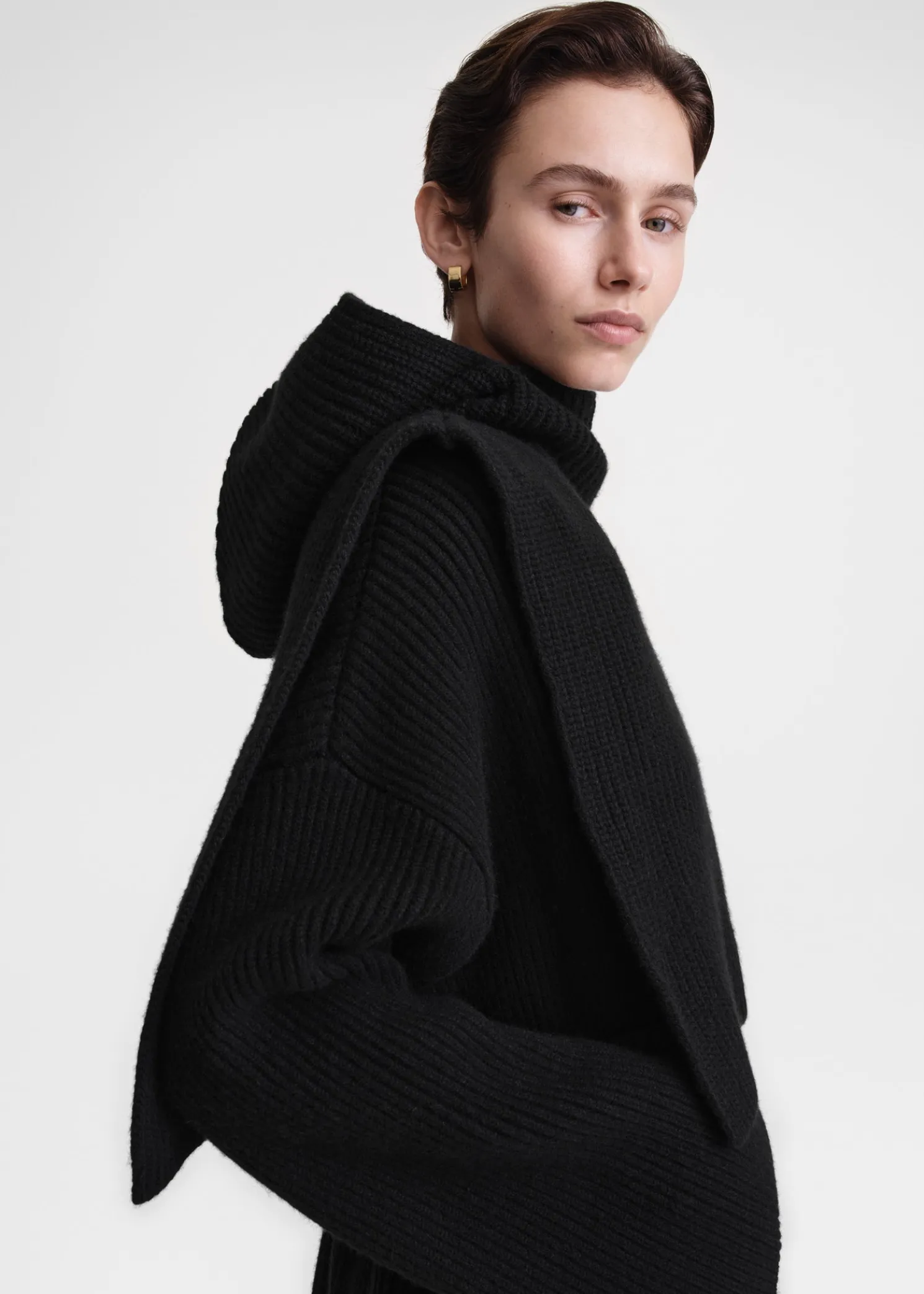 Hooded TOTEME bib to stay warm in style. It’s knitted from a heavyweight, fisherman-ribbed wool blend that feels sturdy yet soft. Wear it with tonal accessories in cold weather.