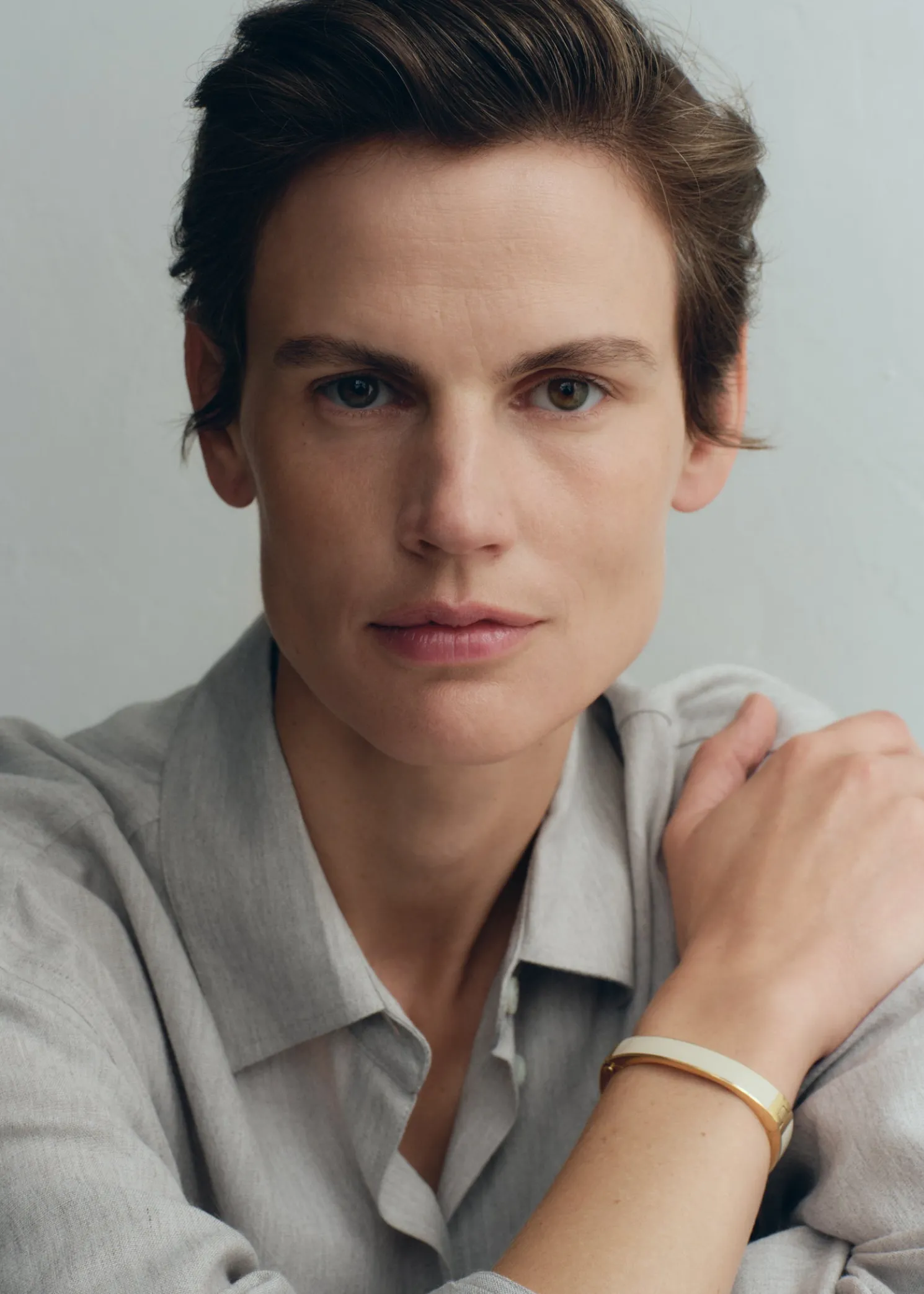 TOTEME Signature bracelet curated with a minimalist point of view to sharp proportions. It’s made by Italian goldsmiths from enamel-coated, hard-wearing 18kt gold-plated brass to a hinged construction that fastens with an effortless push button.