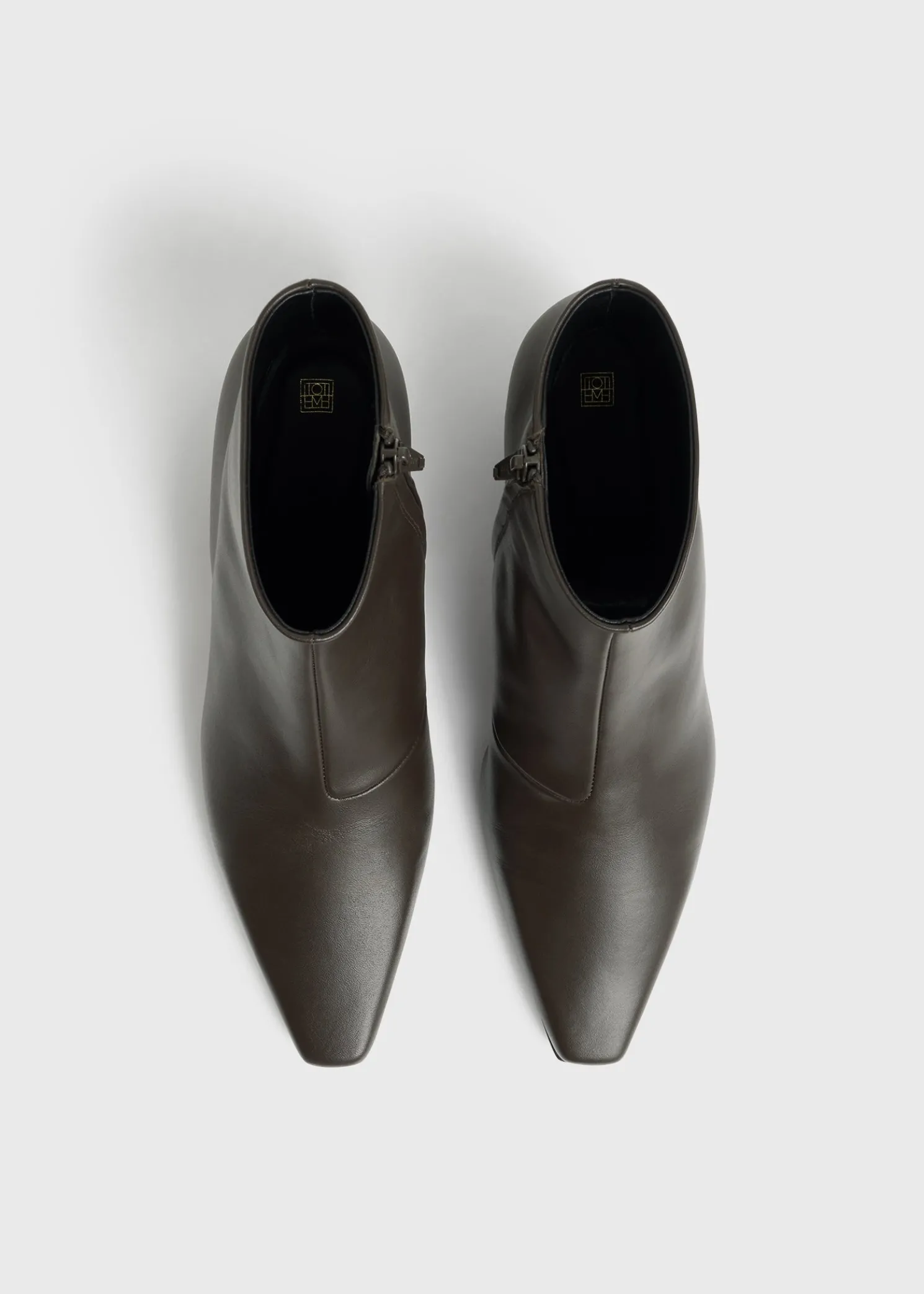 A sophisticated ankle-length style from TOTEME’s boot offering with an elongated silhouette and a 35mm kitten heel. They are crafted in Italy from smooth leather with a foot-wrapping effect that is possible thanks to a handy side zipper. Let them peep below tailored trousers.