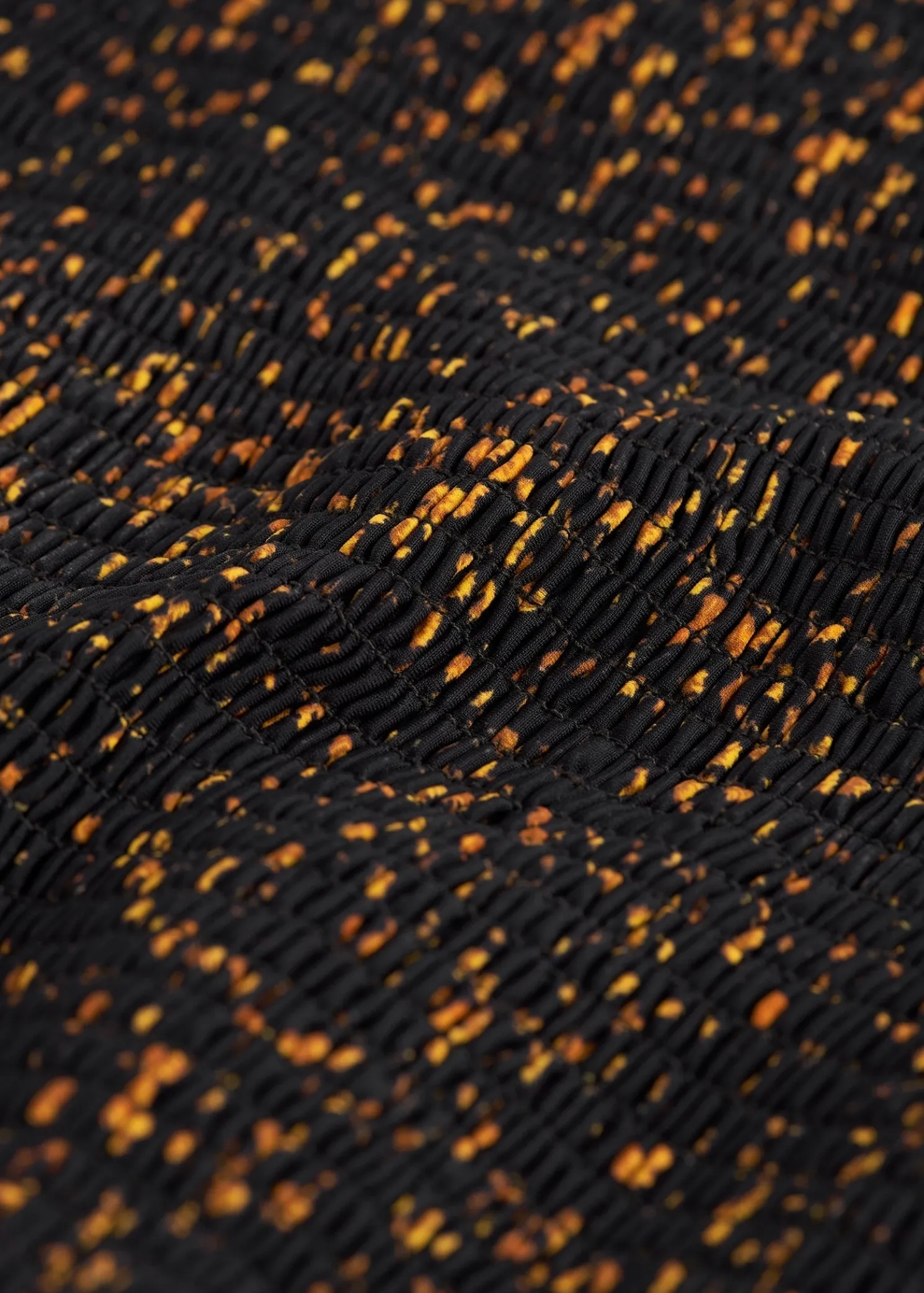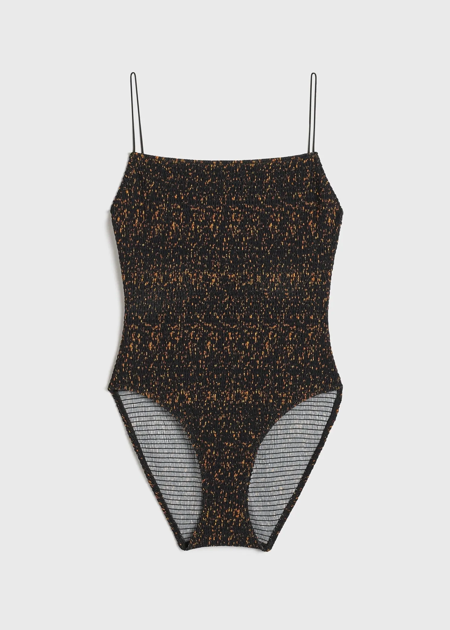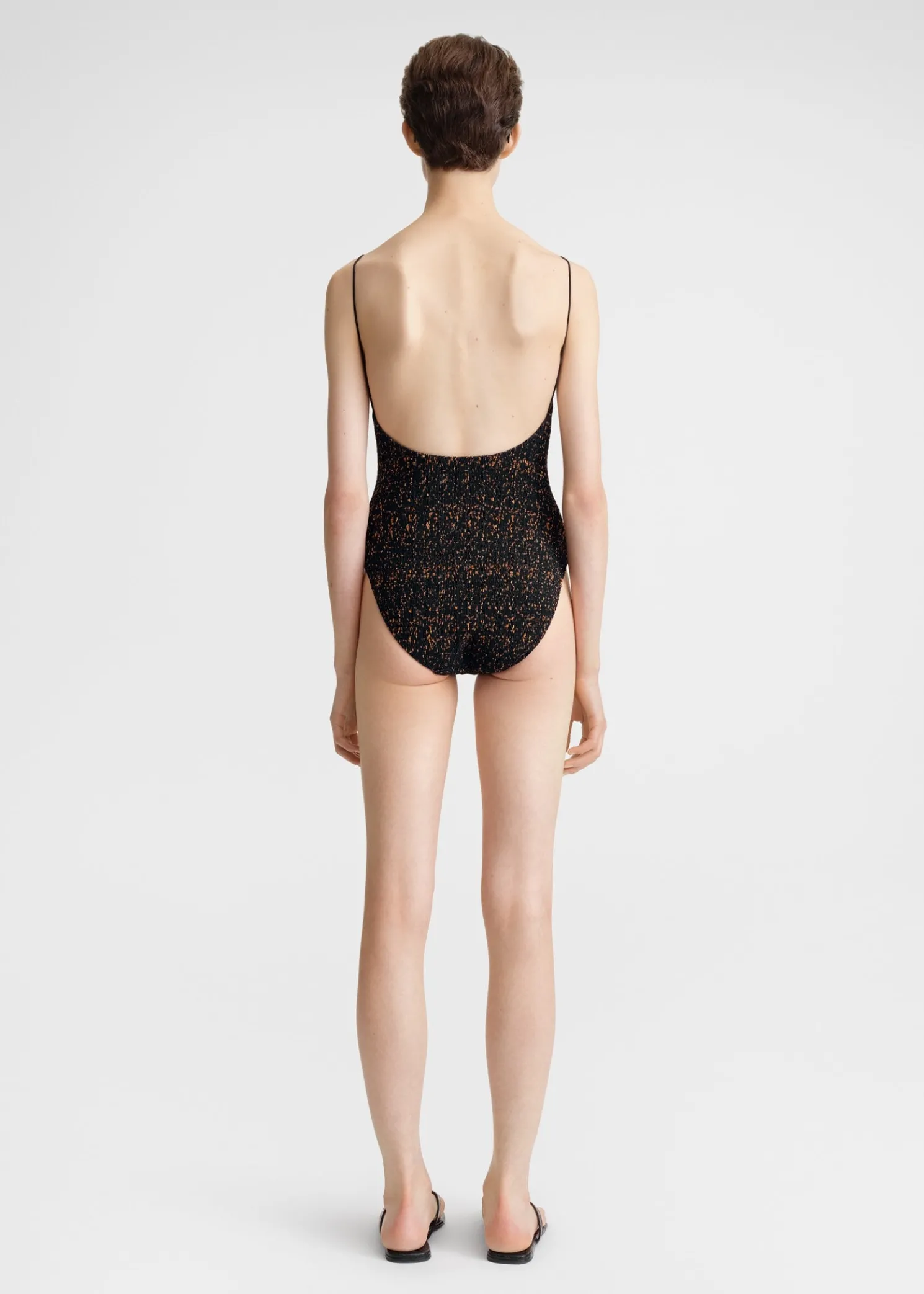 TOTEME swimsuit made from smocked jersey printed with a new tortoiseshell pattern. It’s blended from recycled polyamide yarns with a touch of elastane for a second-skin fit and shaped to a modern silhouette with slim spaghetti straps, a low back and crotch lining. Use it to add texture to your vacation wardrobe.