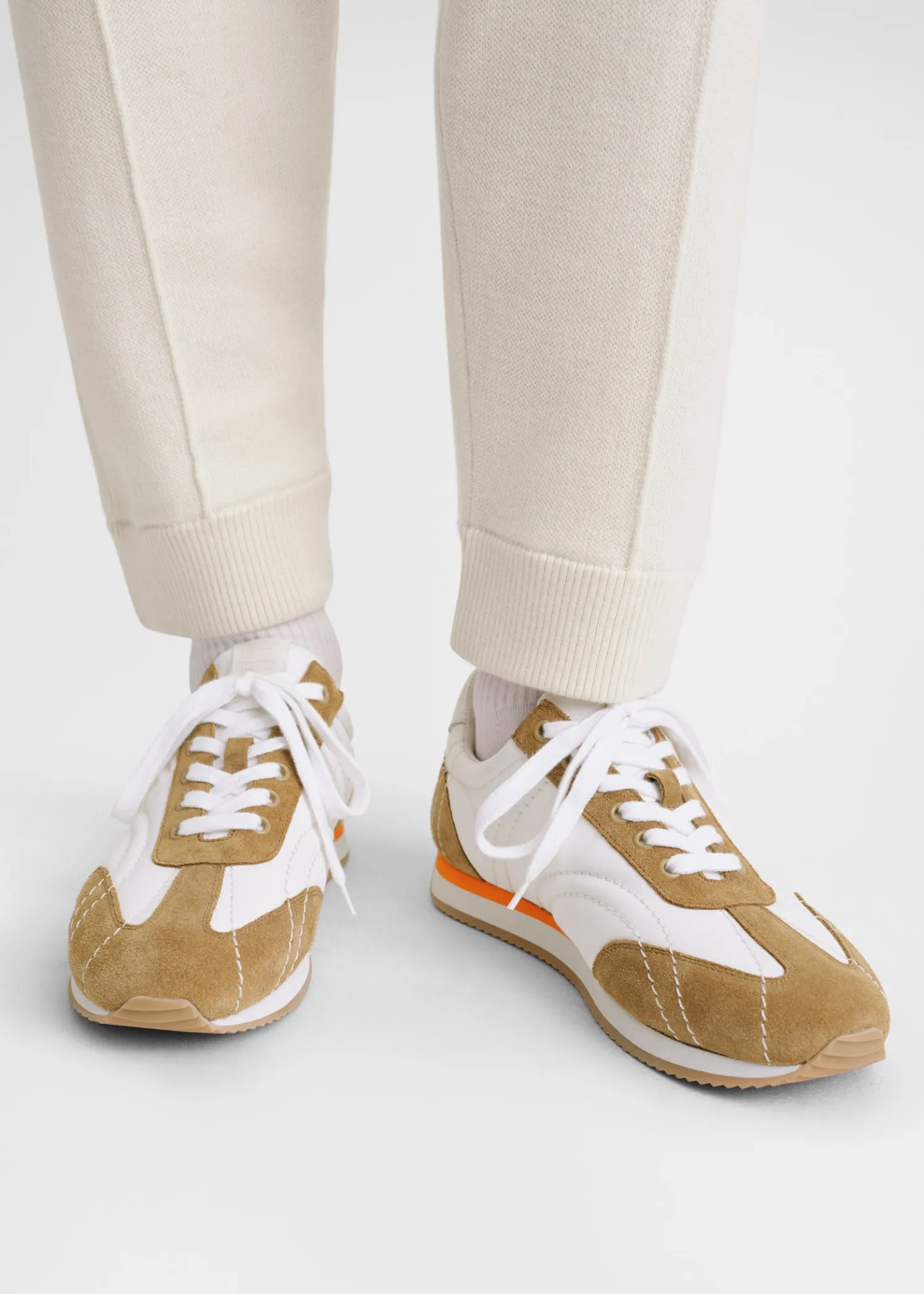 TOTEME sneakers reworked in a bicolor combination for a sporty feel. They’re made in Portugal from monogram-quilted recycled polyamide paired with tan suede and set on a foam midsole with a bright orange insert. Team them with leggings on your way to a workout.