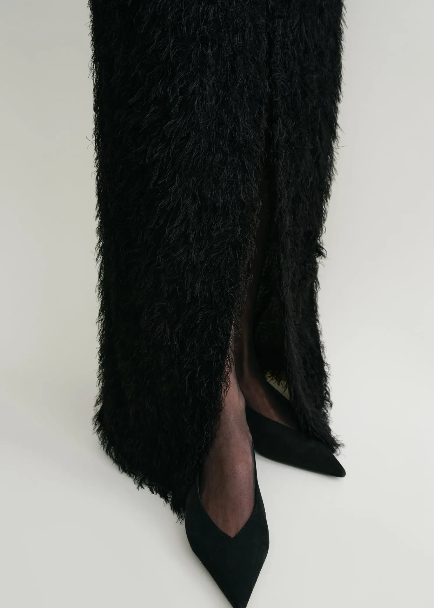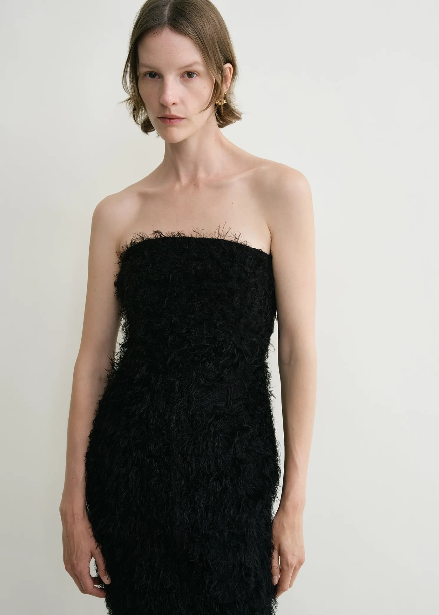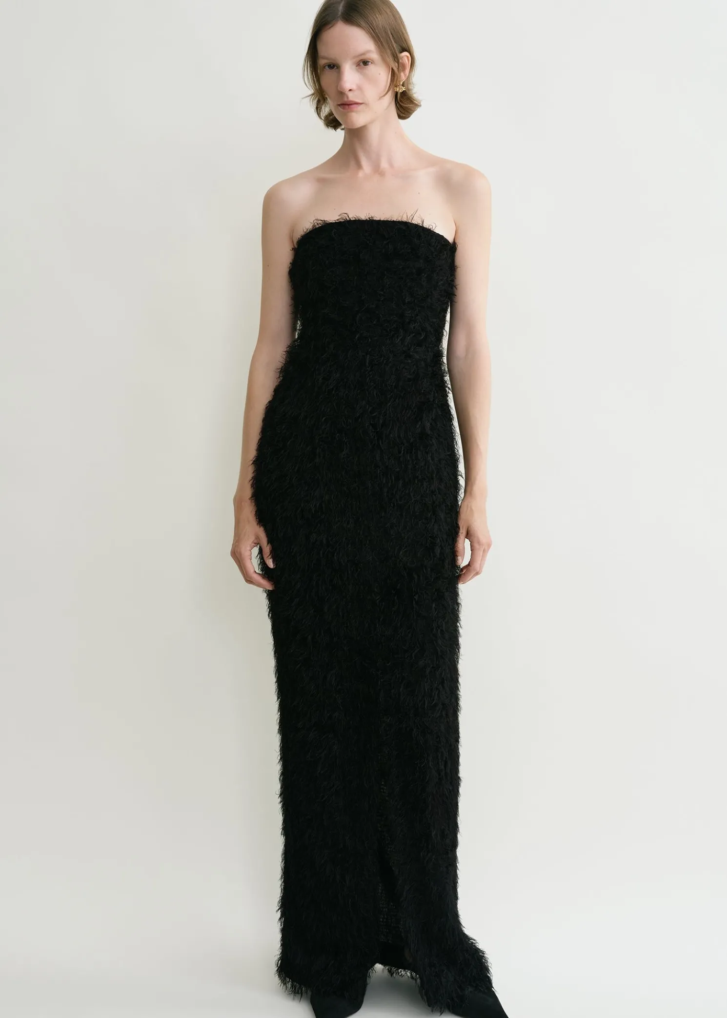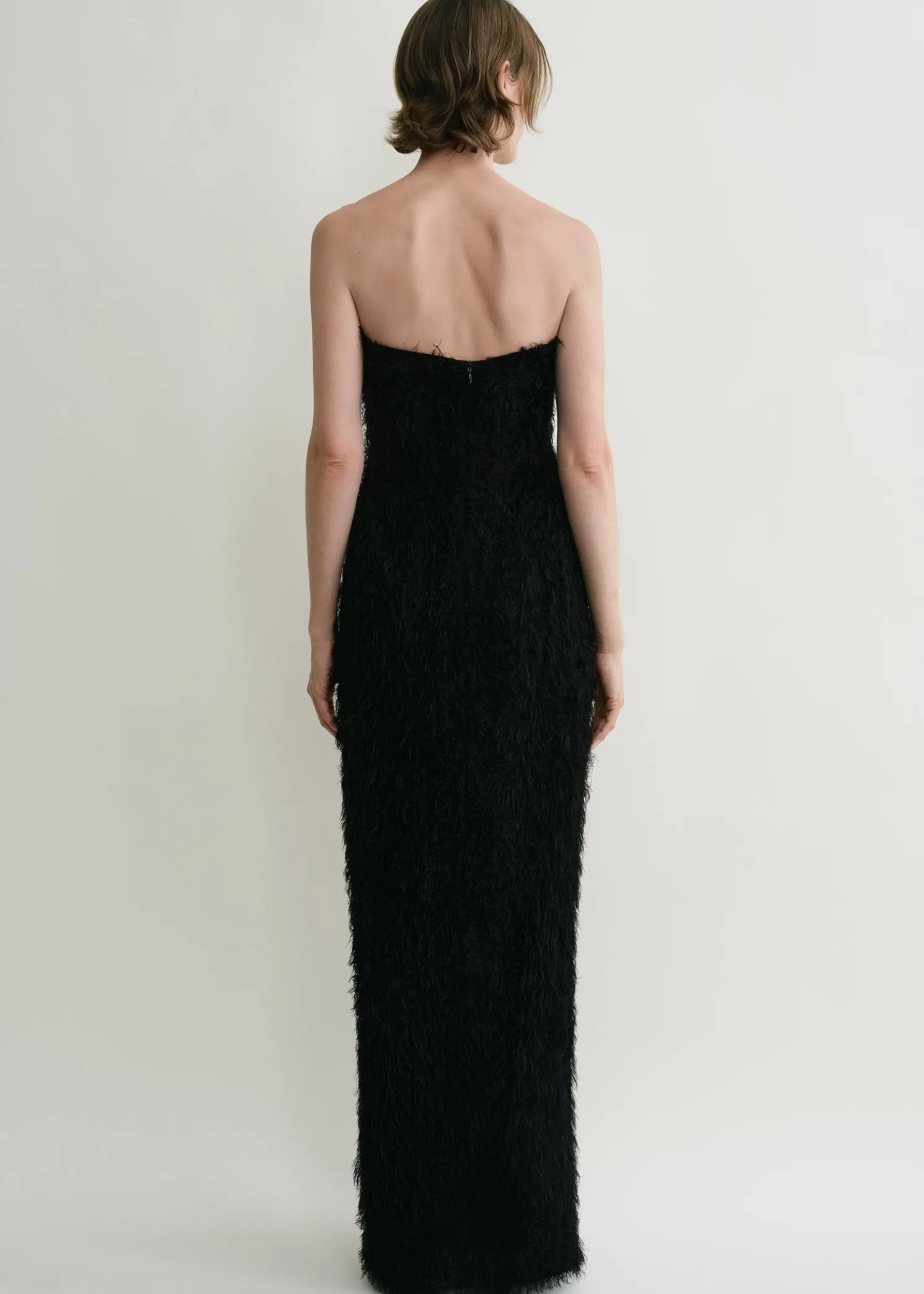 TOTEME occasion dress crafted from fil coupé, a whisper-light fabric with soft threads reminiscent of feathers. It has a strapless neckline with an internal corset-like structure that elegantly drives the fabric away from the body, then fastens with a concealed back zipper. Style it with pumps to attend a formal event.