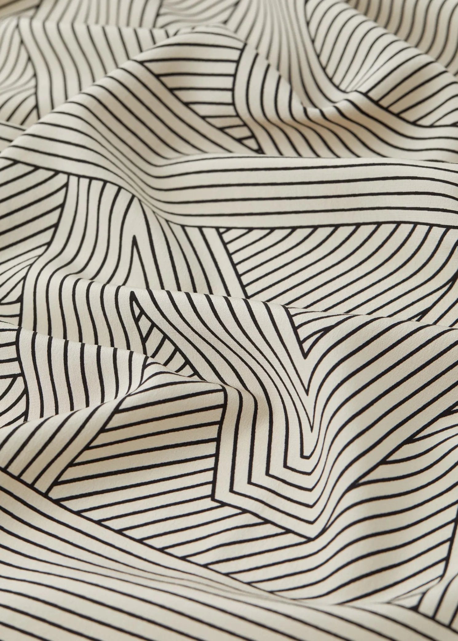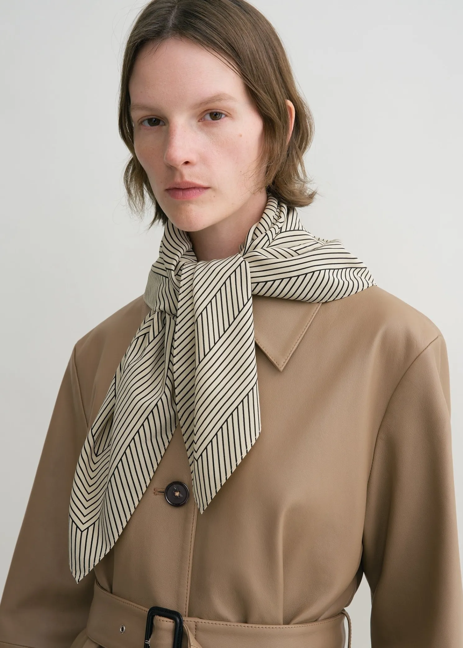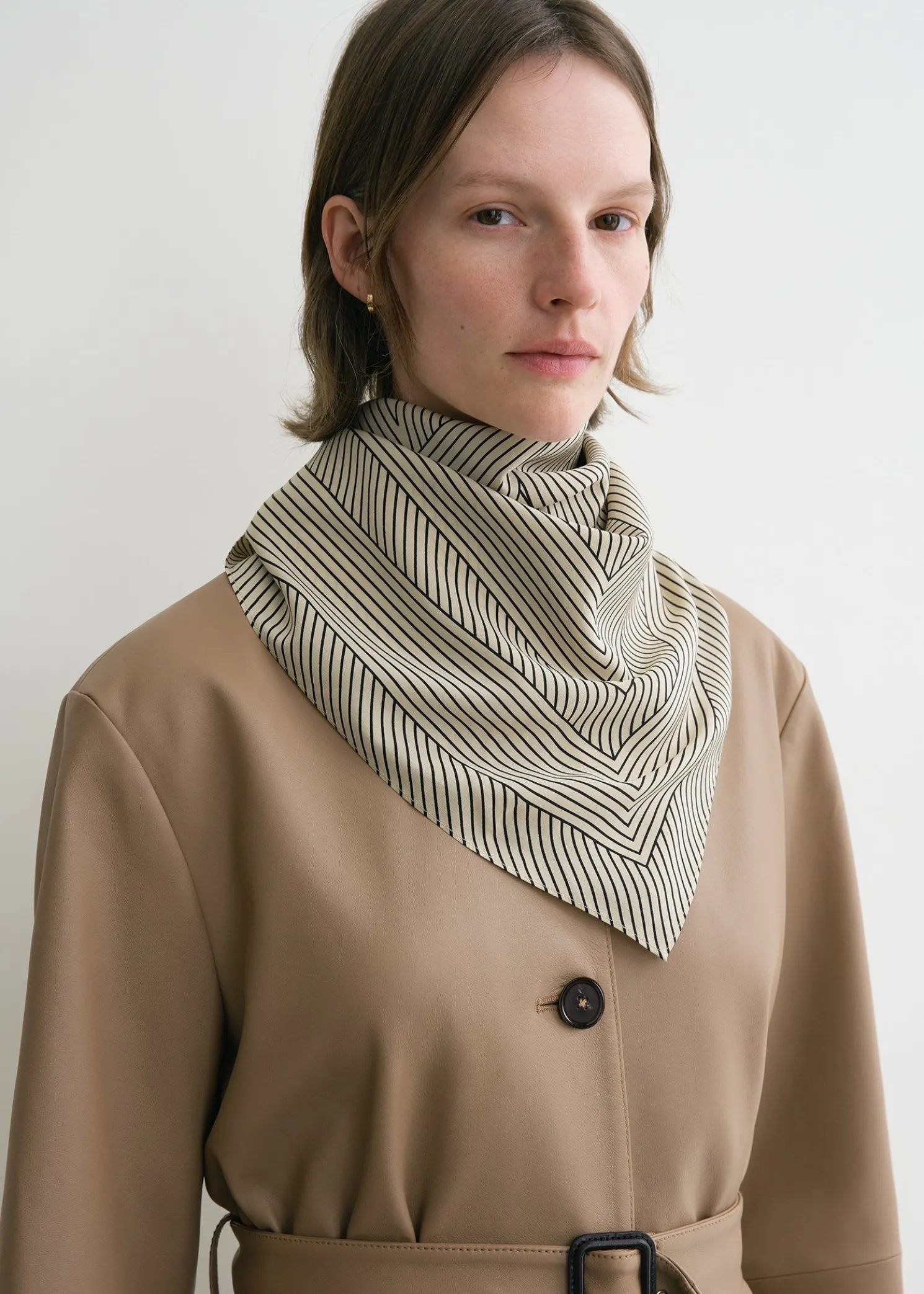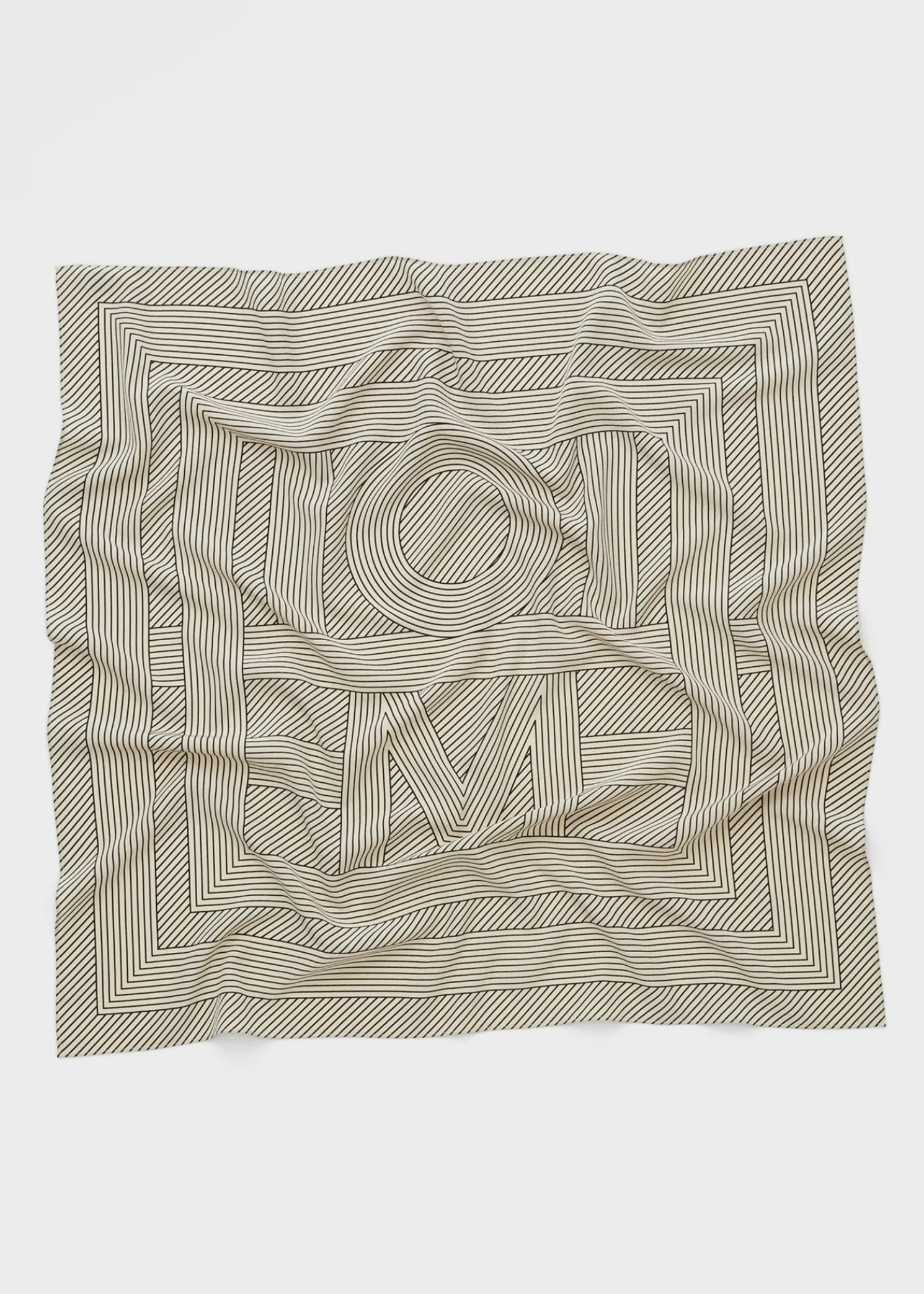 nnLarge silk scarf cut to a square shape measuring 80x80cm that’s printed with a black and crème-striped version of TOTEME’s distinctive monogram. Wear it around your neck or over your shoulders.