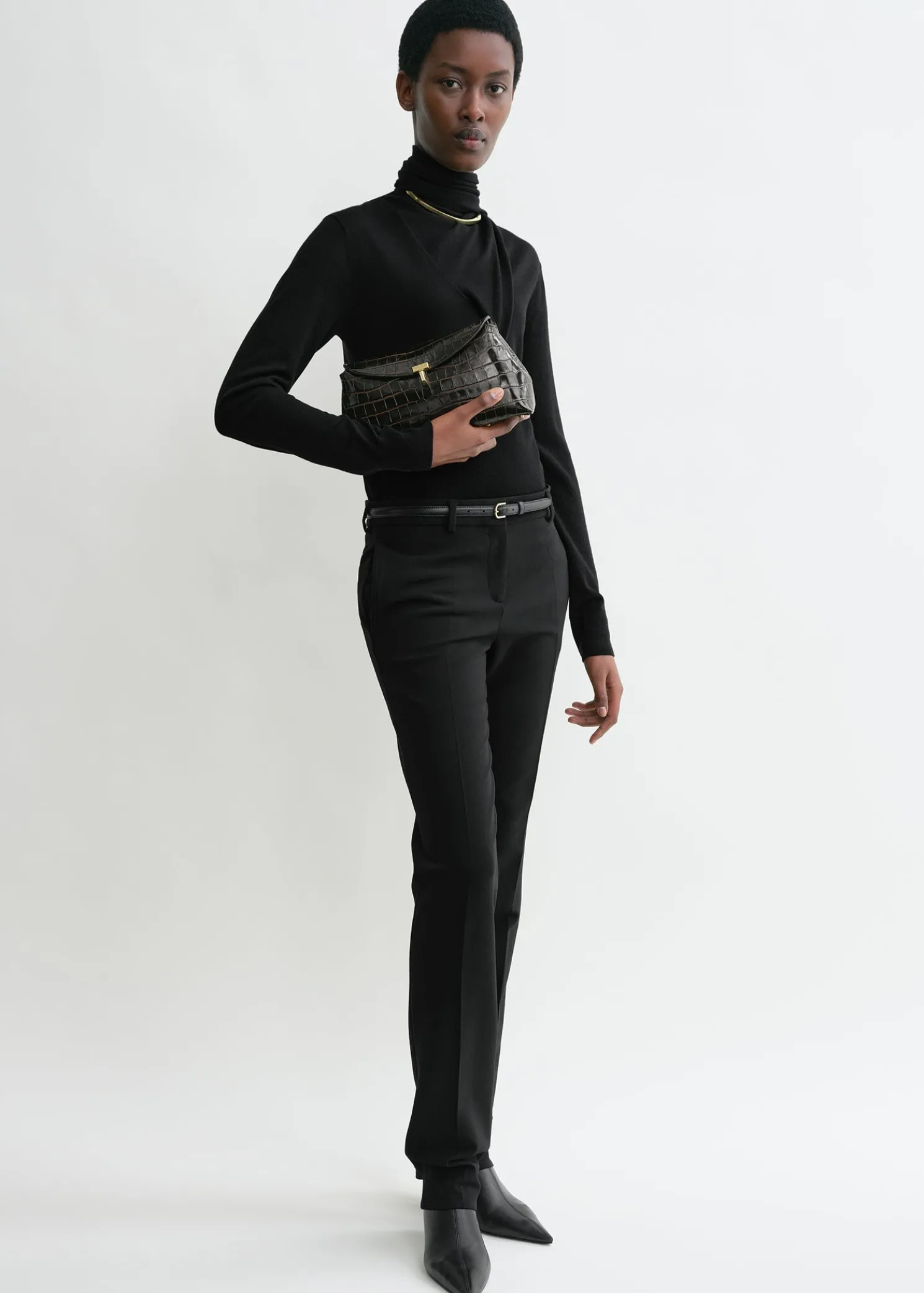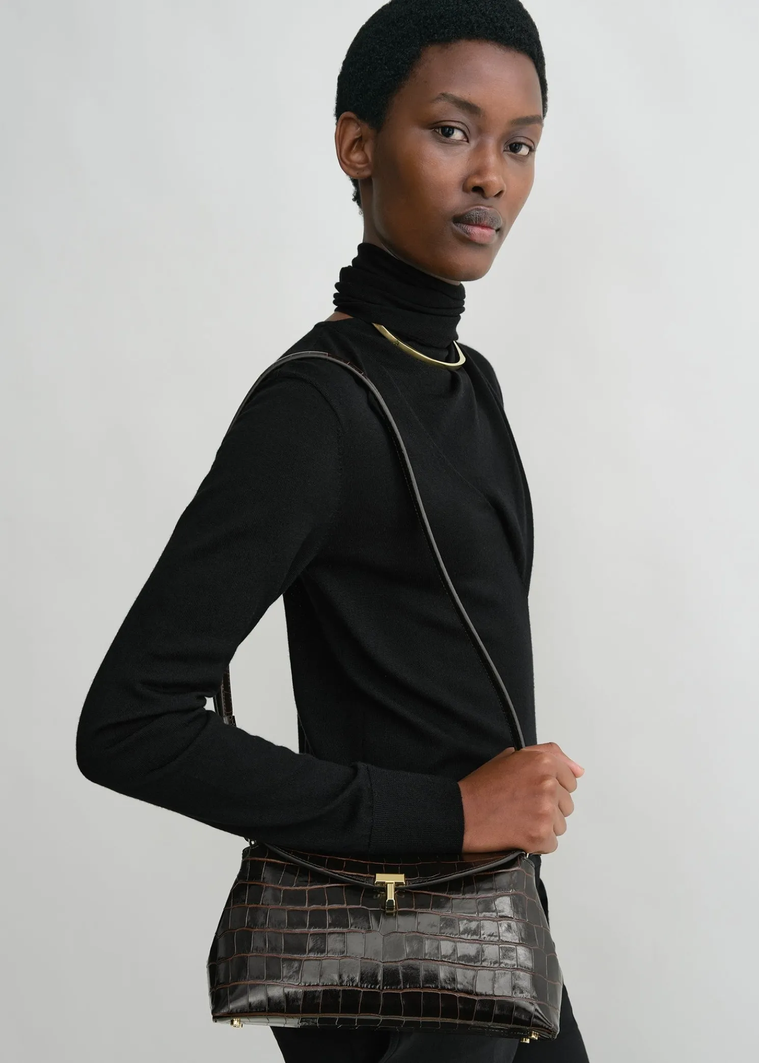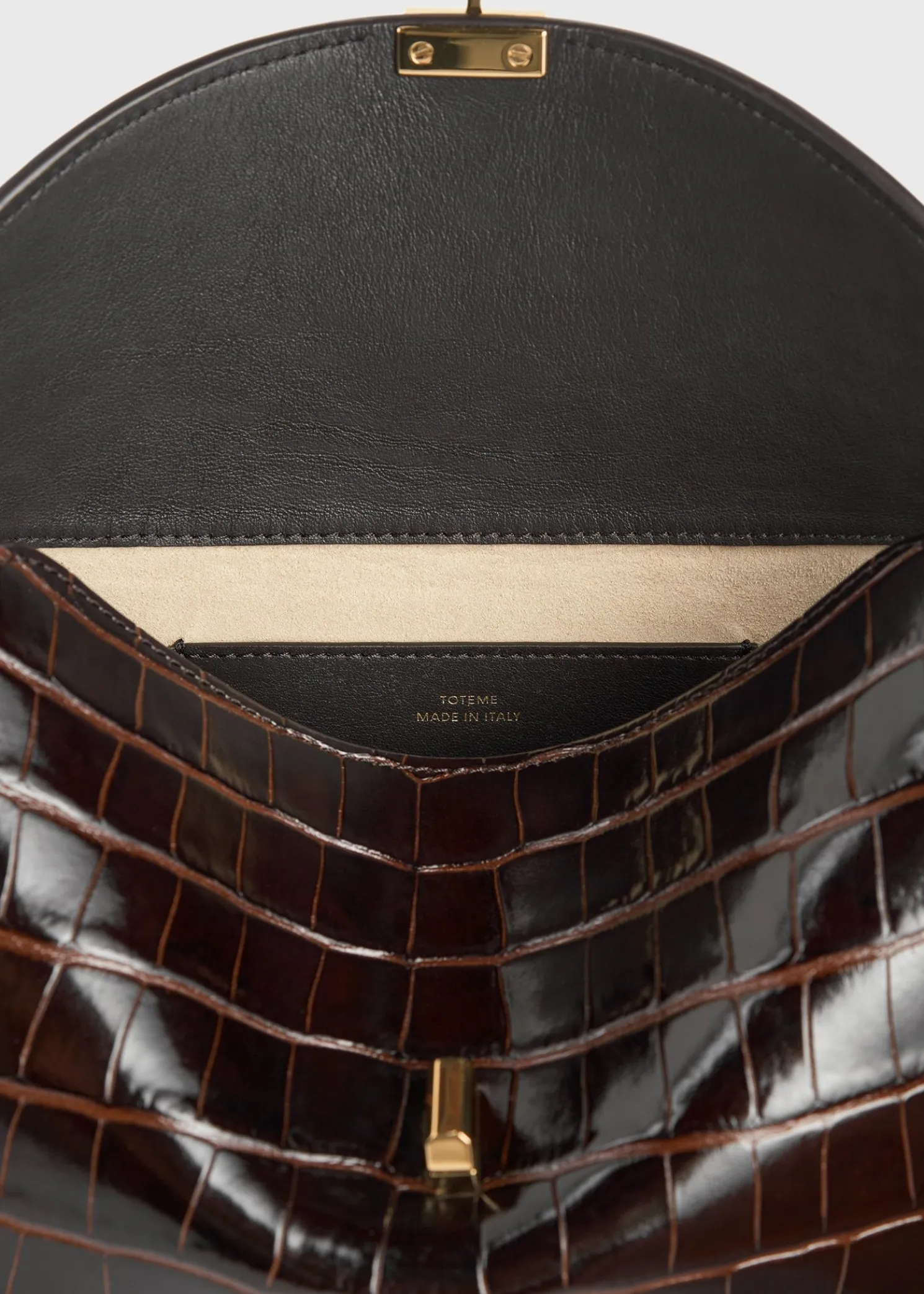 Sculptural TOTEME clutch bag named T-Lock after the gold-tone metal twist lock securing the curved top flap. It is crafted in Italy from crocodile-effect leather and fitted with an internal card slot. Hold it in your hand or carry it across the body using the optional strap.