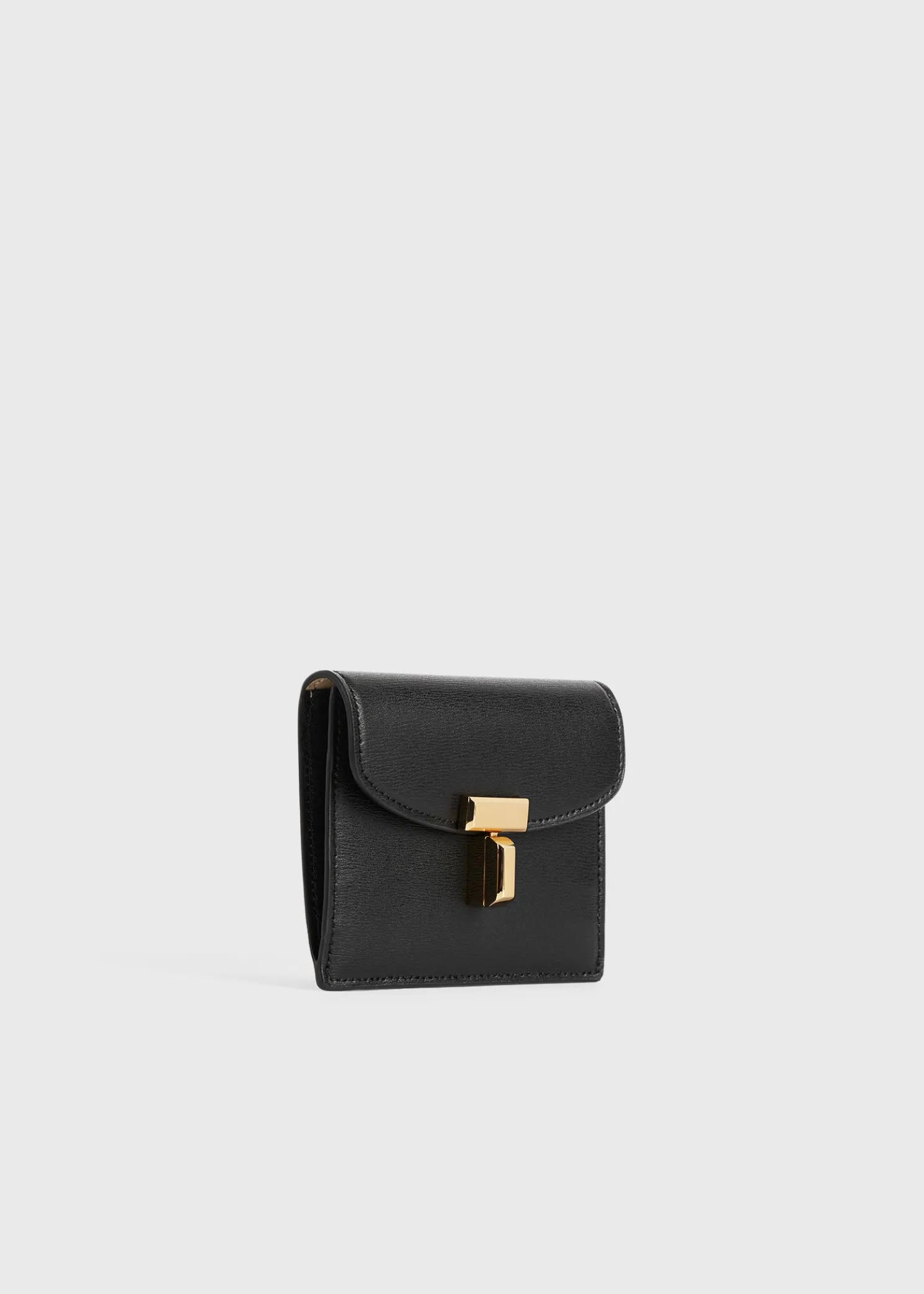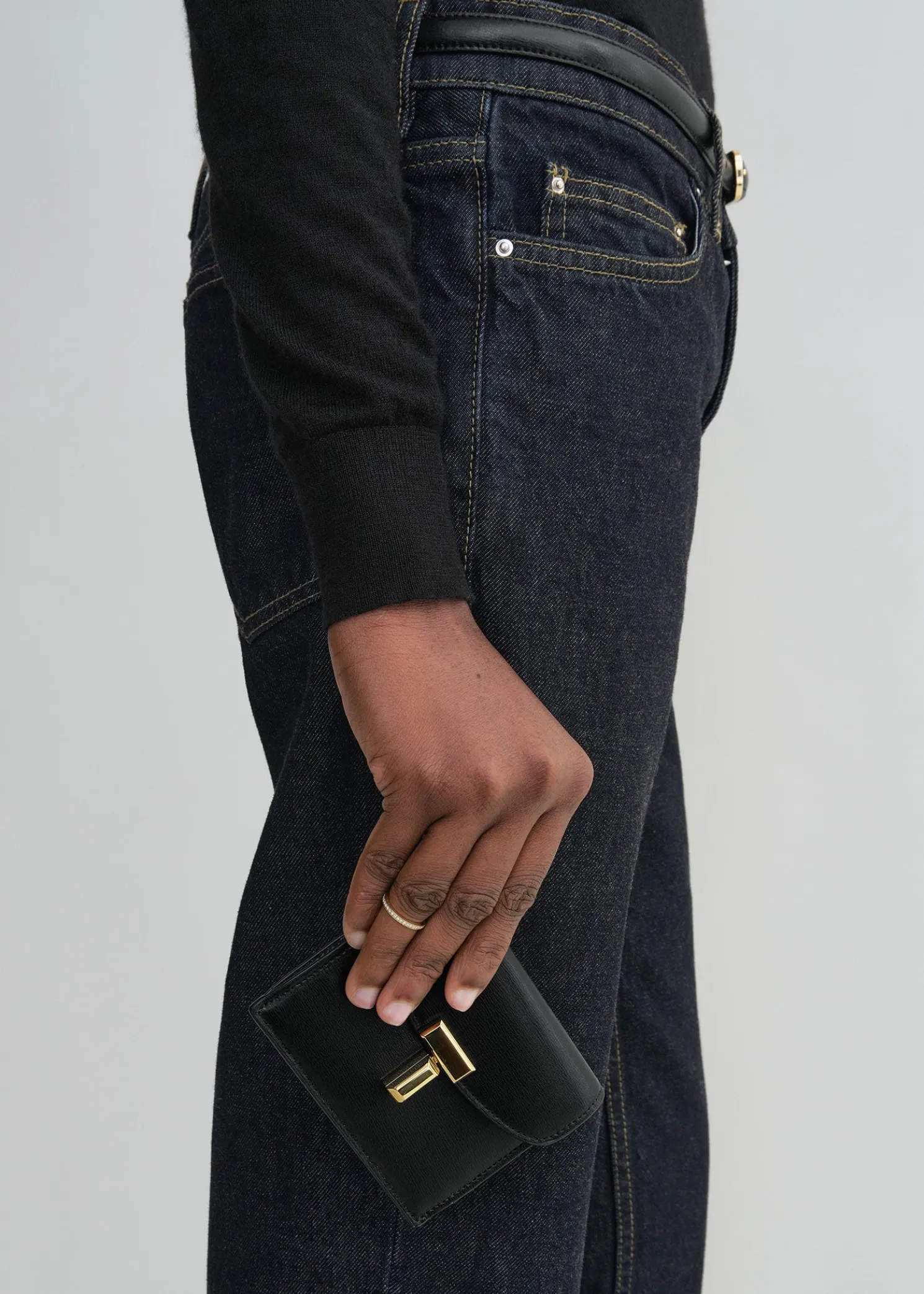 TOTEME’s T-Lock family is expanding into small leather goods, including this elegant cardholder. It is crafted from softly textured Palmellata leather set with a metal clasp and fitted with multiple card slots.