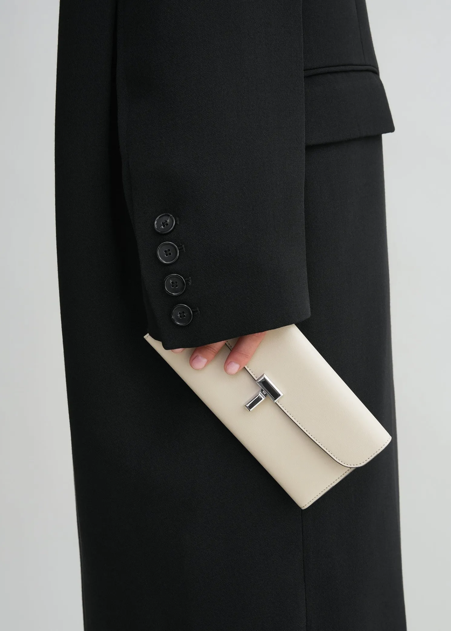 TOTEME’s T-Lock family is expanding into small leather goods, including this elegant continental wallet. It is crafted from softly textured Palmellata leather set with a metal clasp and fitted with multiple internal compartments, including six card slots.