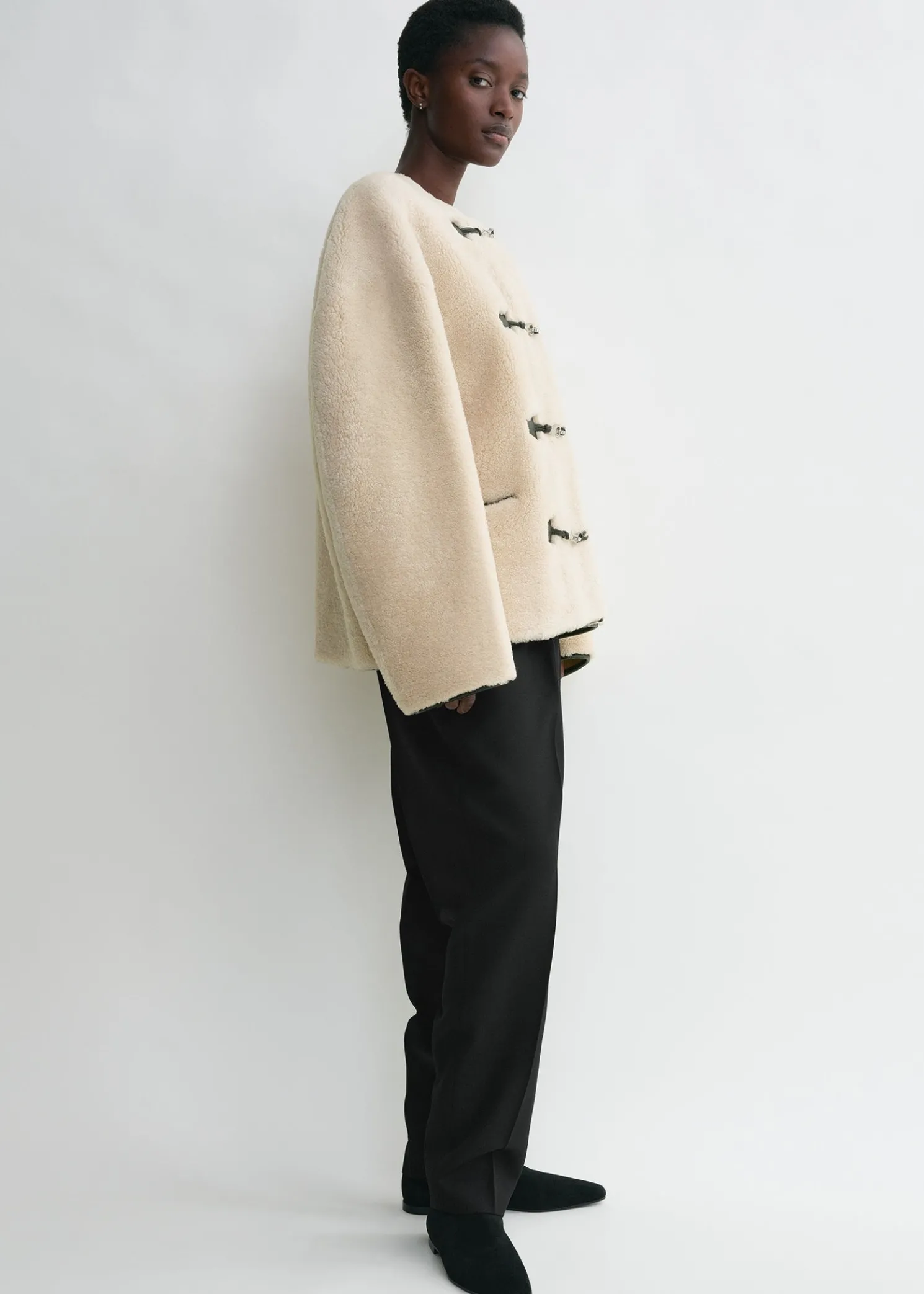 nnTOTEME winter jacket made from mid-weight, soft and warm teddy shearling with a supple leather interior matching the pockets and trims. It has a wide torso and arms resulting in a laid-back, oversized silhouette that fastens with silver-tone metal clasps. Wear it throughout the week as a cozy outerwear piece.