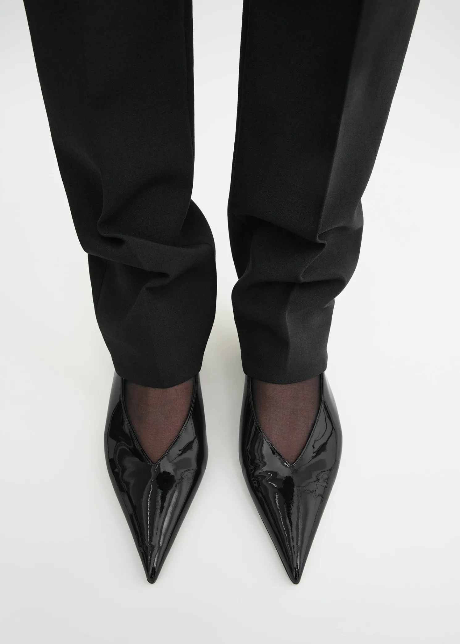 Seen throughout the FW24 runway show, these TOTEME slingback pumps are set on a demure 40mm heel with a tapered half-wedge silhouette. They are crafted in Italy from patent leather lined in leather and are elasticated at the back for a comfortable fit. Wear them with black tights as an elegant backdrop.