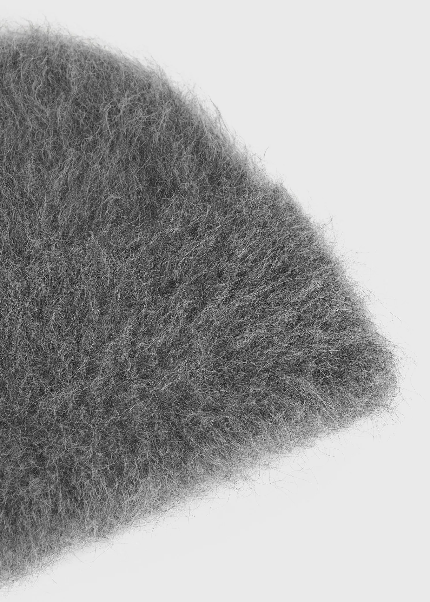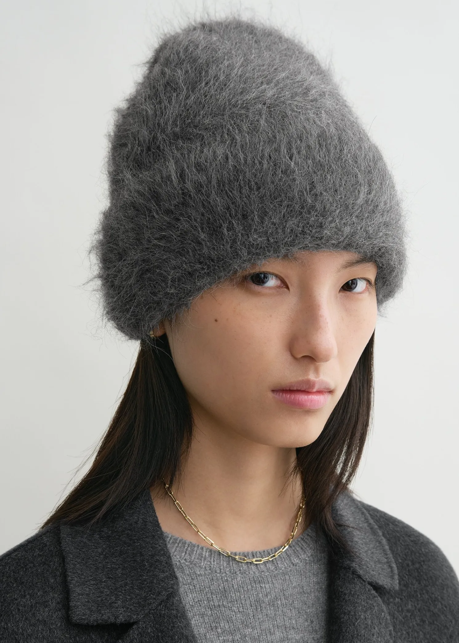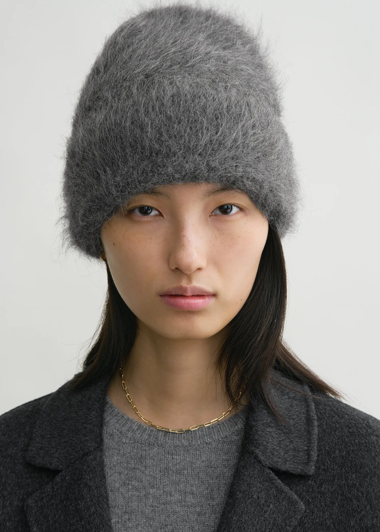 TOTEME beanie hat imagined as a warm winter set complete with the Boxy alpaca knit. It Is knitted from a fuzzy alpaca blend with a mélange effect and can be worn with the edge folded or extended.