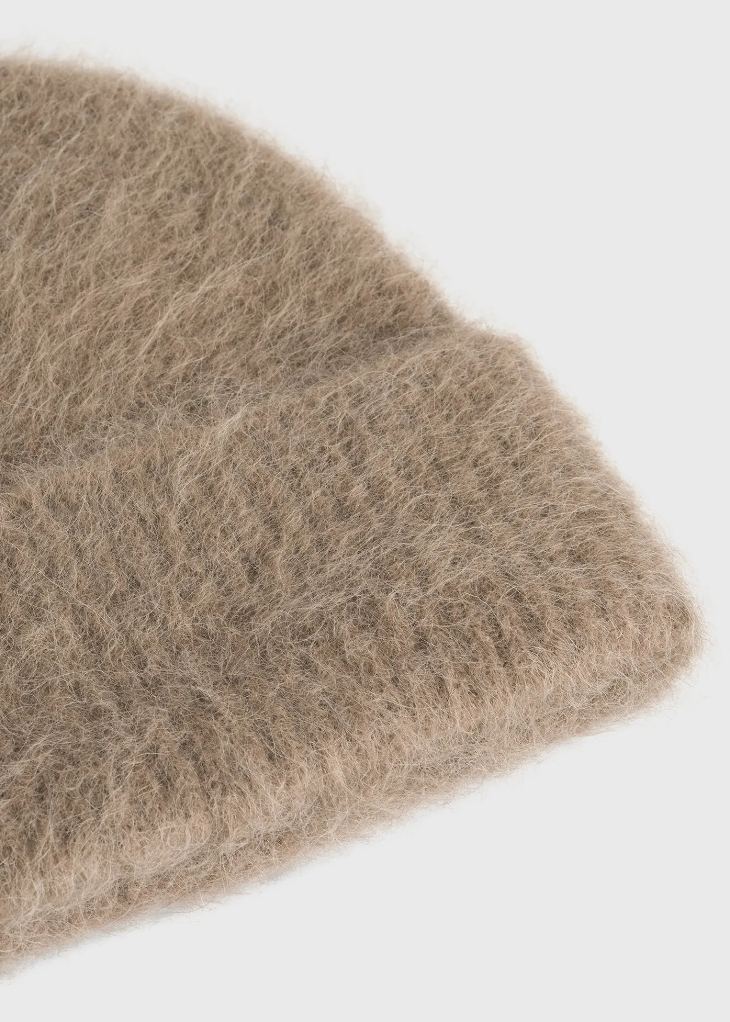 TOTEME beanie hat imagined as a warm winter set complete with the Boxy alpaca knit. It Is knitted from a fuzzy alpaca blend with a mélange effect and can be worn with the edge folded or extended.