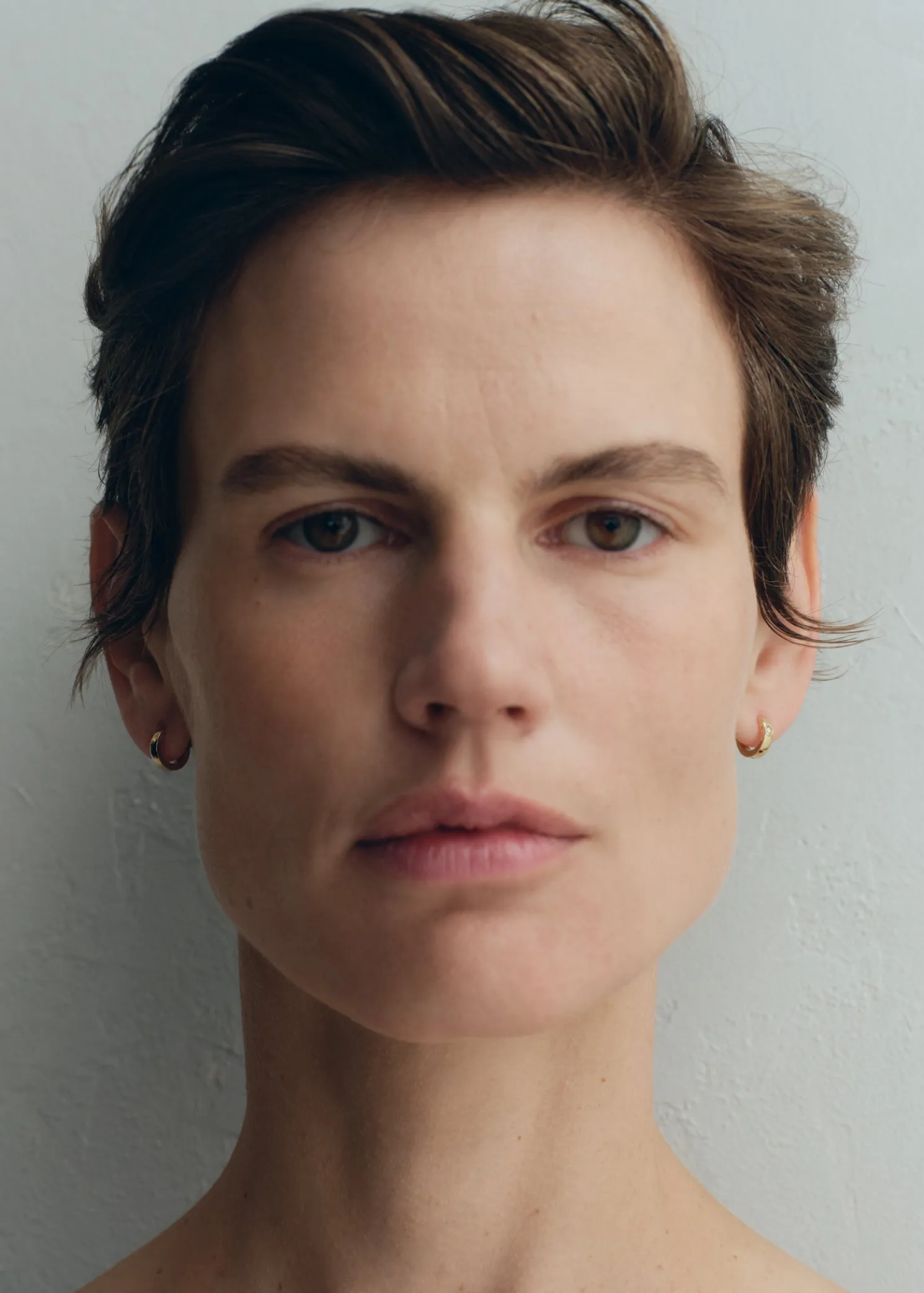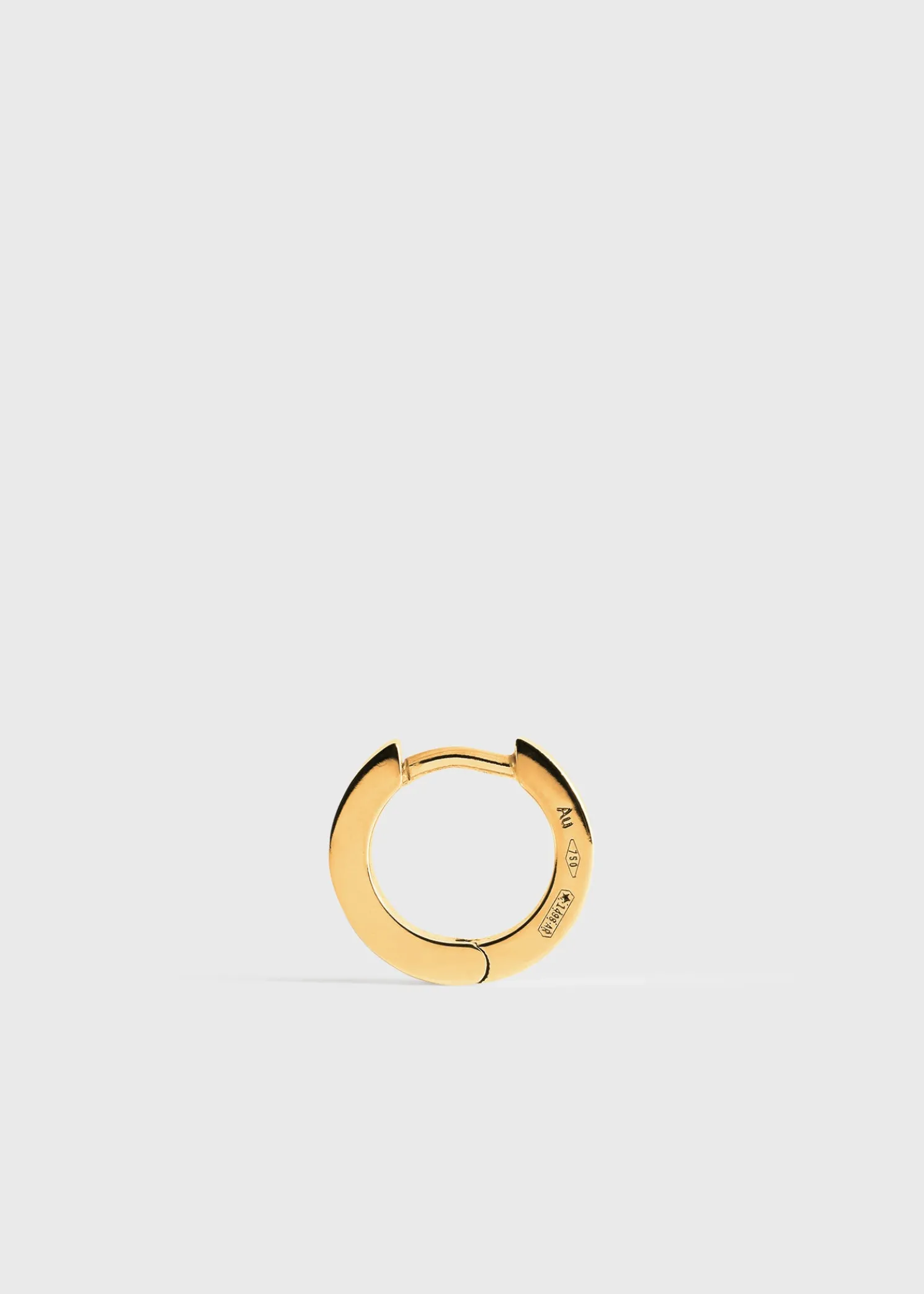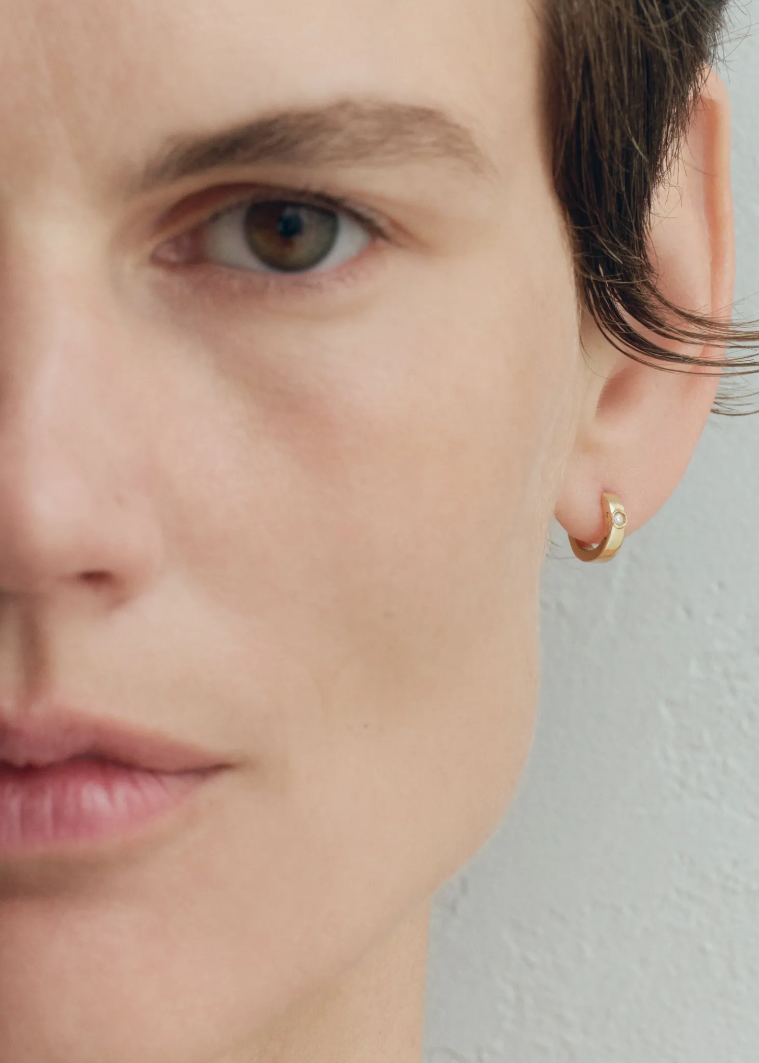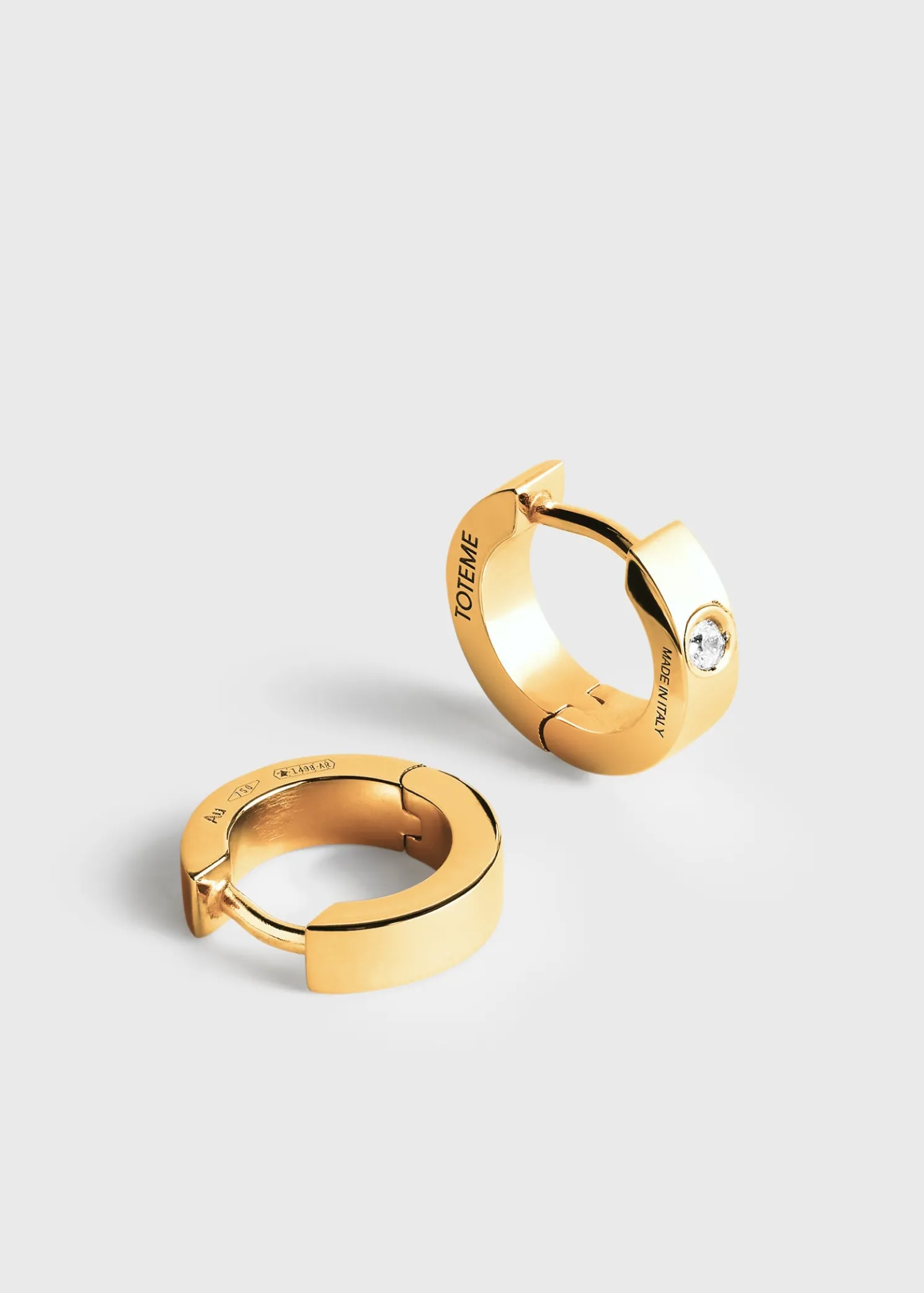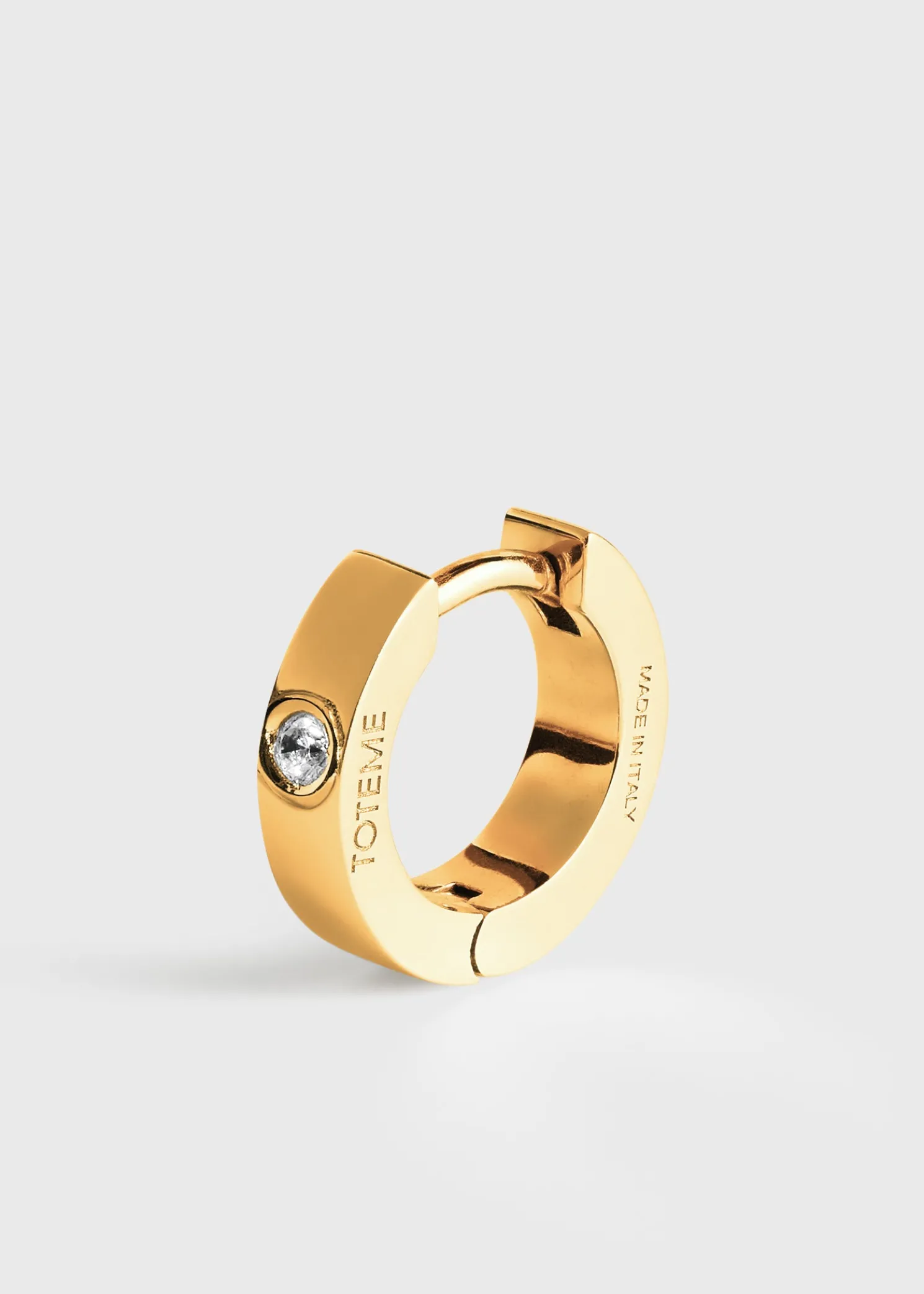 nTOTEME huggy hoops accented with a single 0.014-carat diamond that is meticulously bezel-set into one of them. They are Italian-crafted from recycled 18kt yellow gold and fasten with an effortless hinged mechanism.