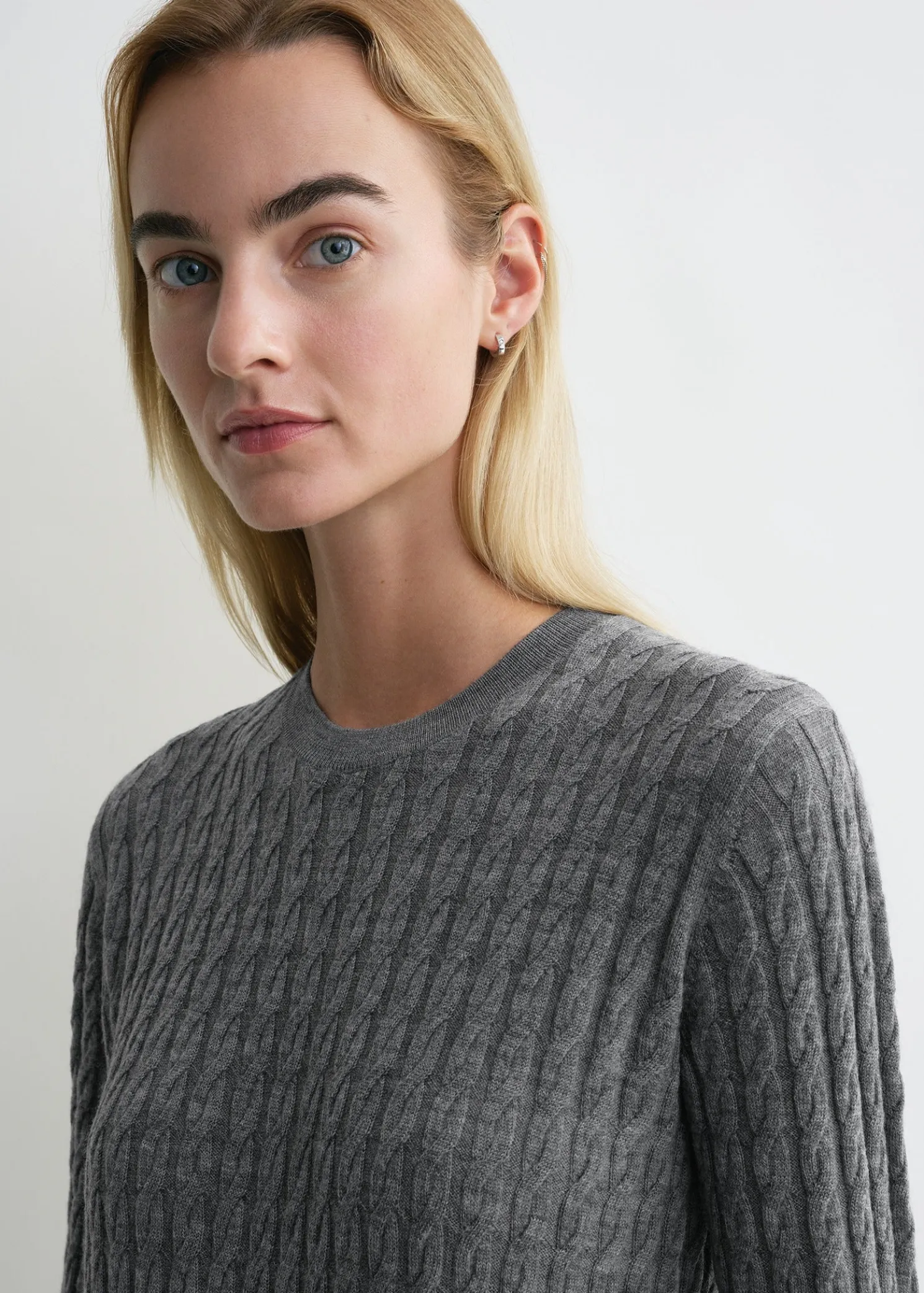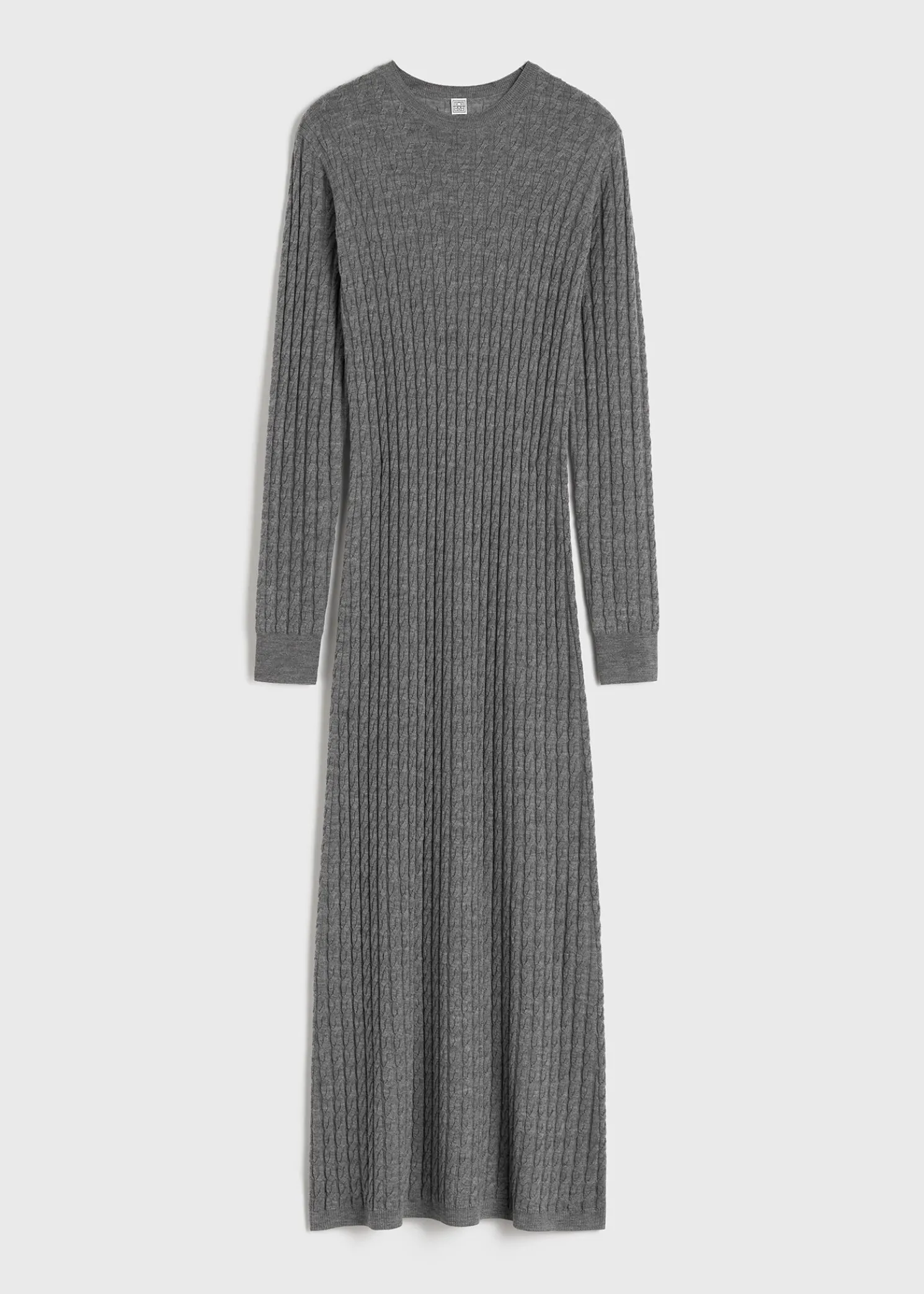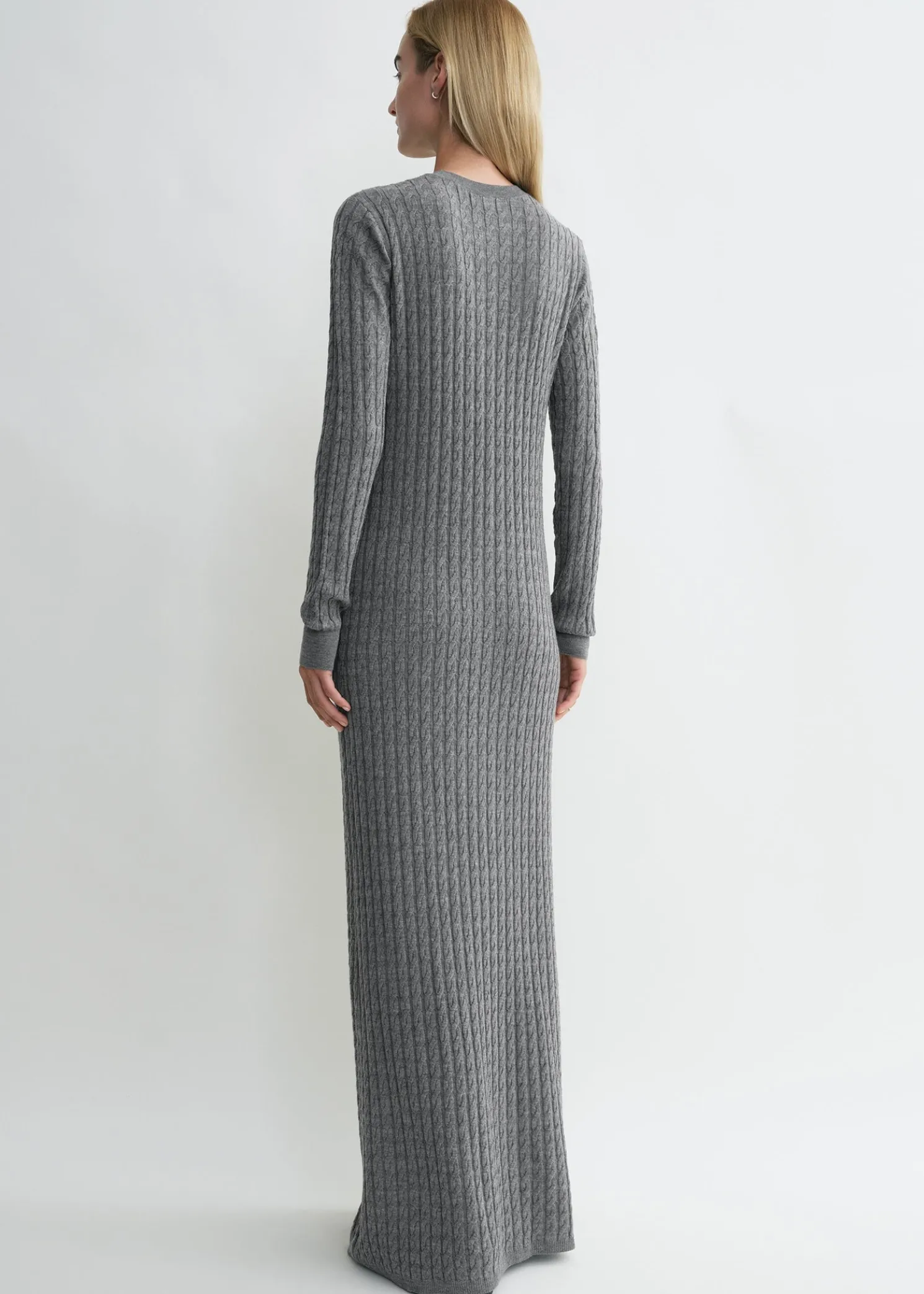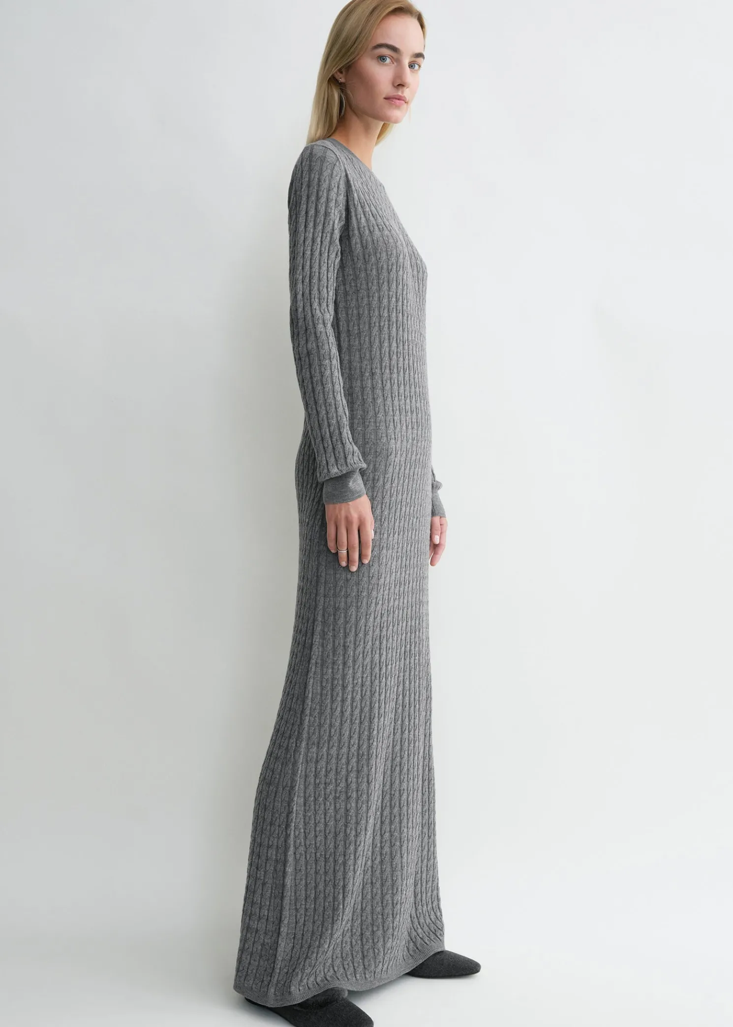 Our signature TOTEME cable knitwear is reimagined as a long slim dress. It is knitted from responsibly sourced merino wool with a minimalist crew neckline and slender long sleeves. Wear it to entertain at home.