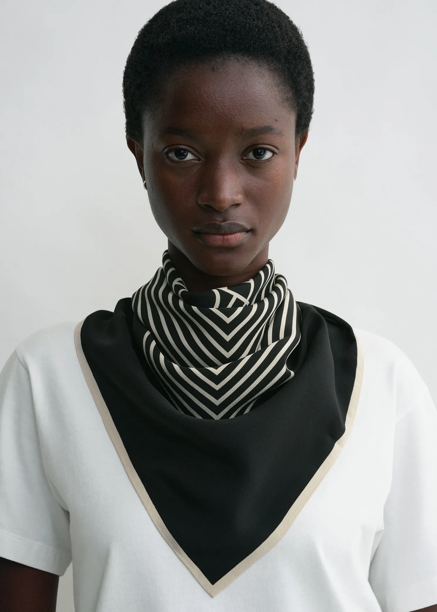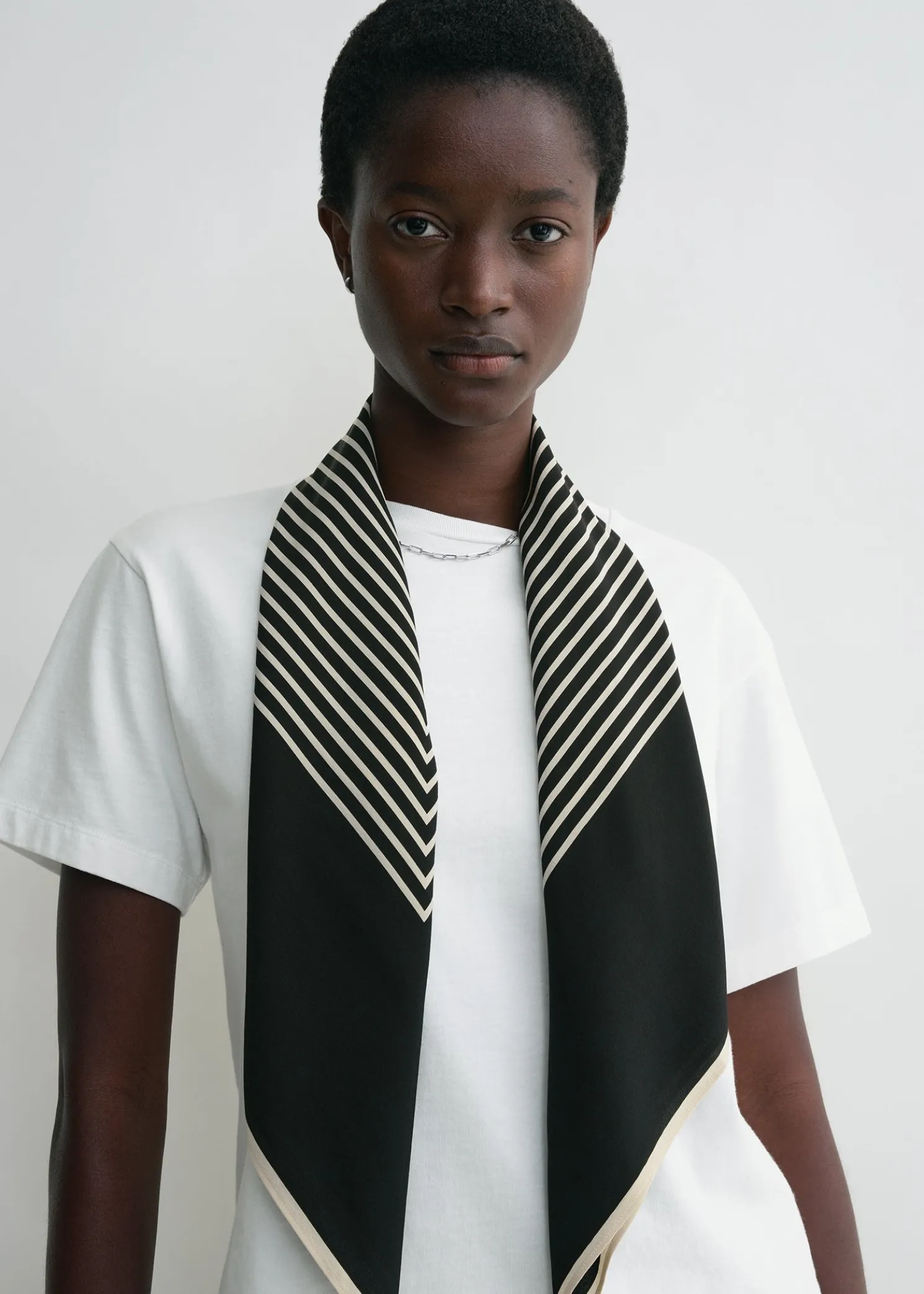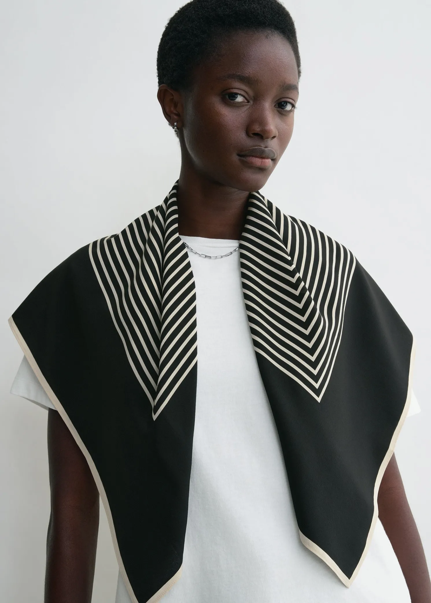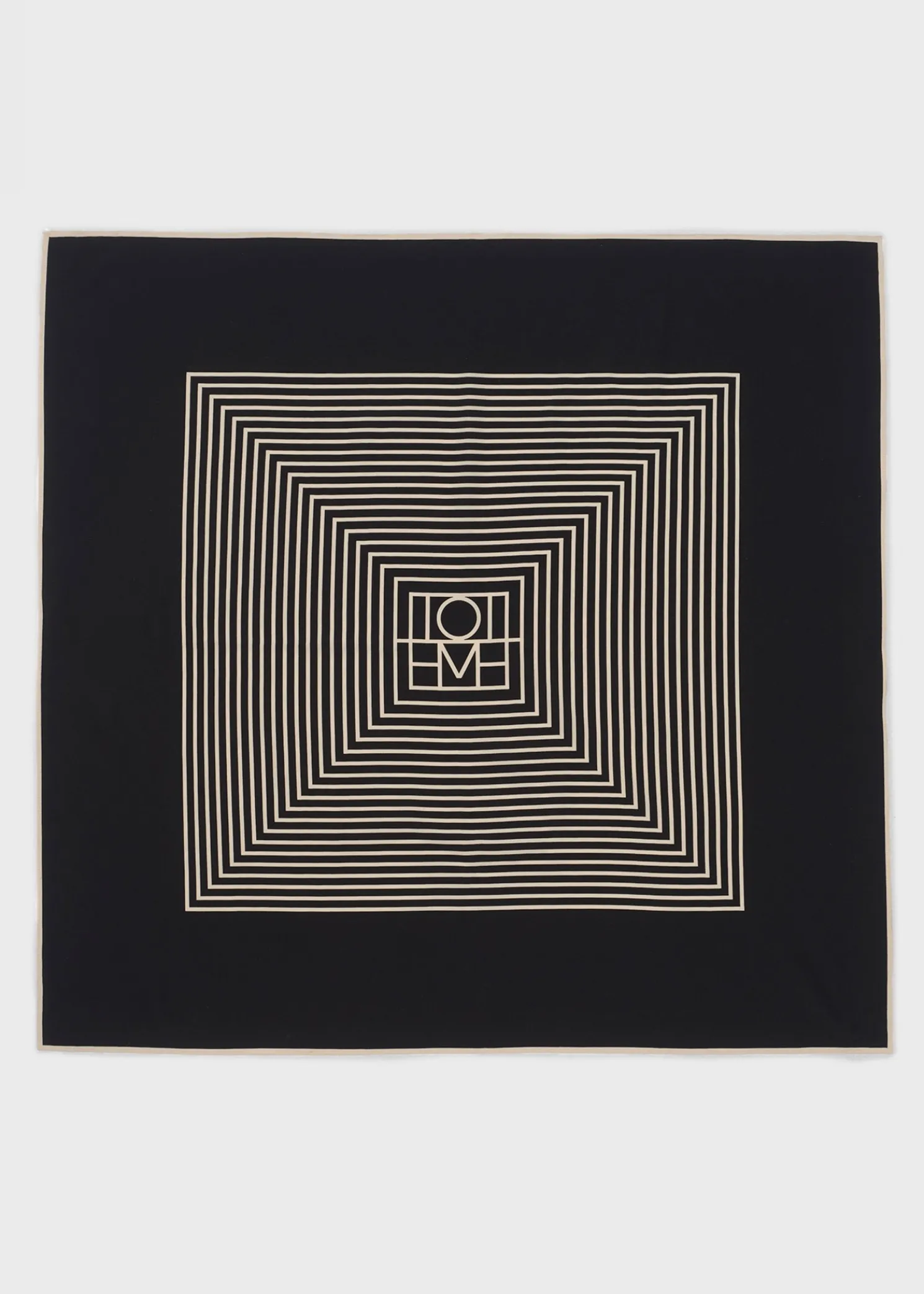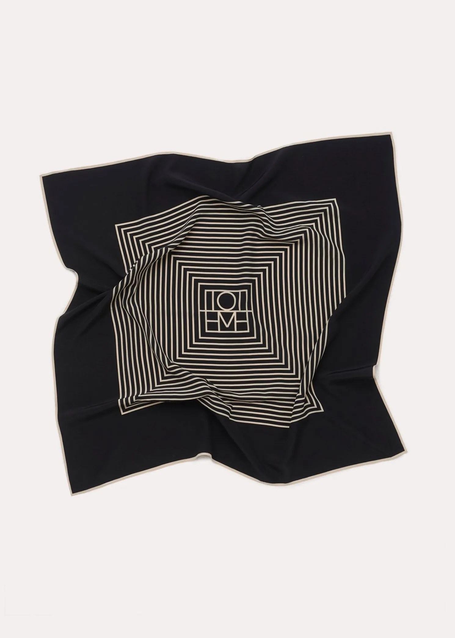 nnnnnClassic TOTEME silk scarf cut to a square shape measuring 80x80cm and printed with a centered, striped monogram in black and crème. Drape it over your shoulders or fold it neatly around your neck.