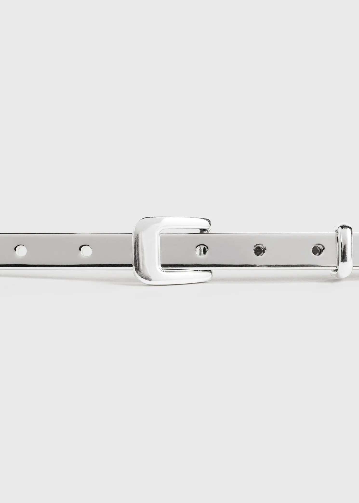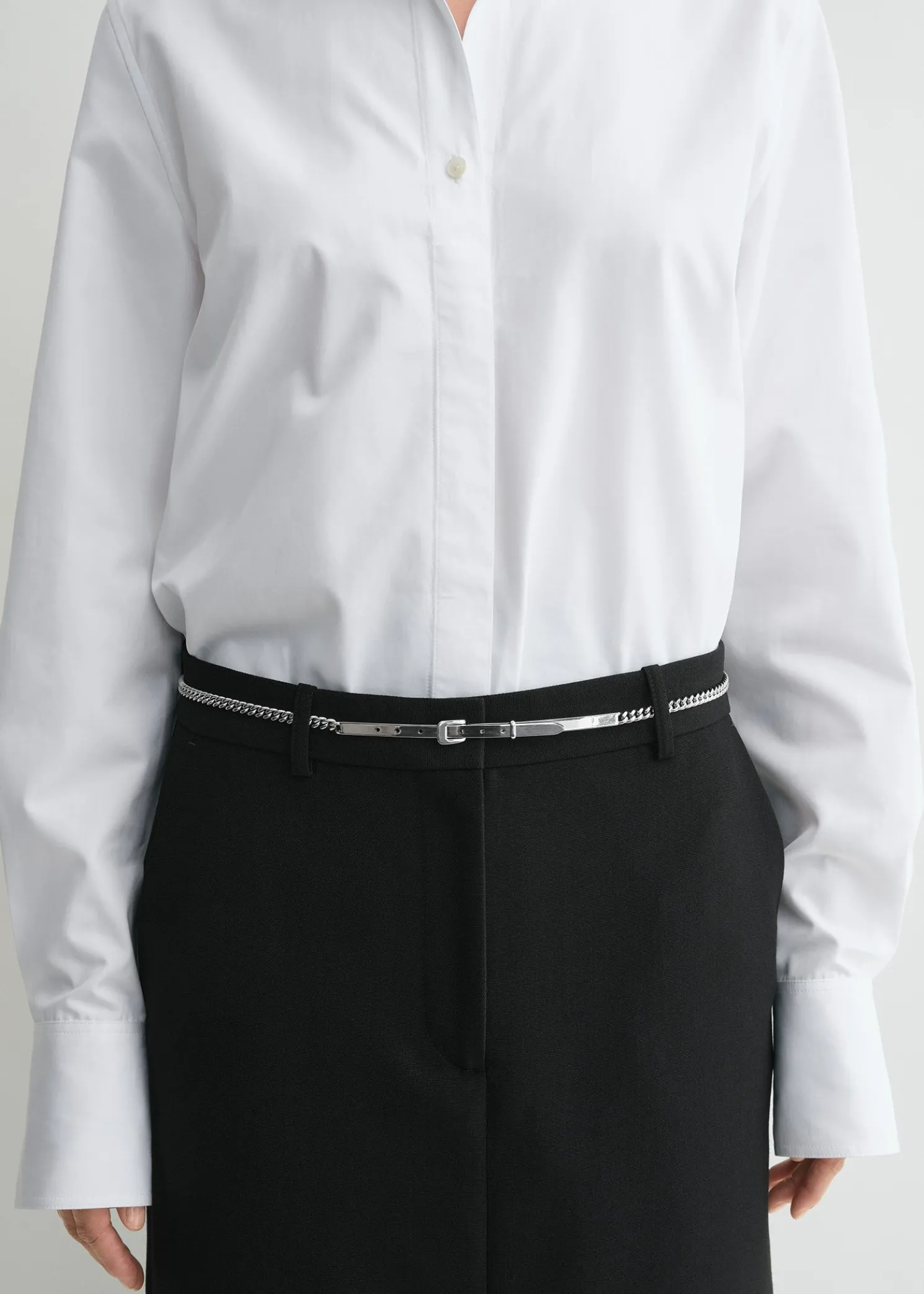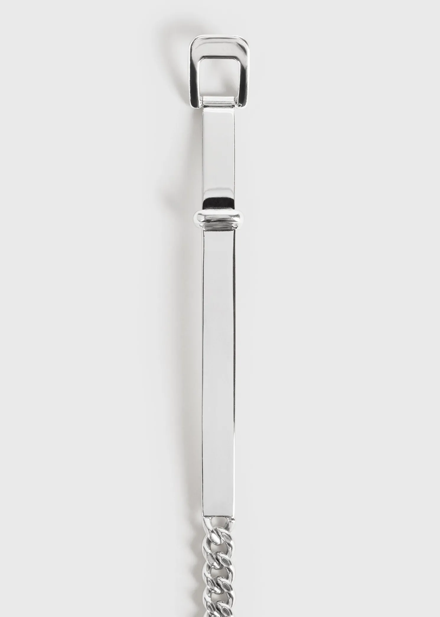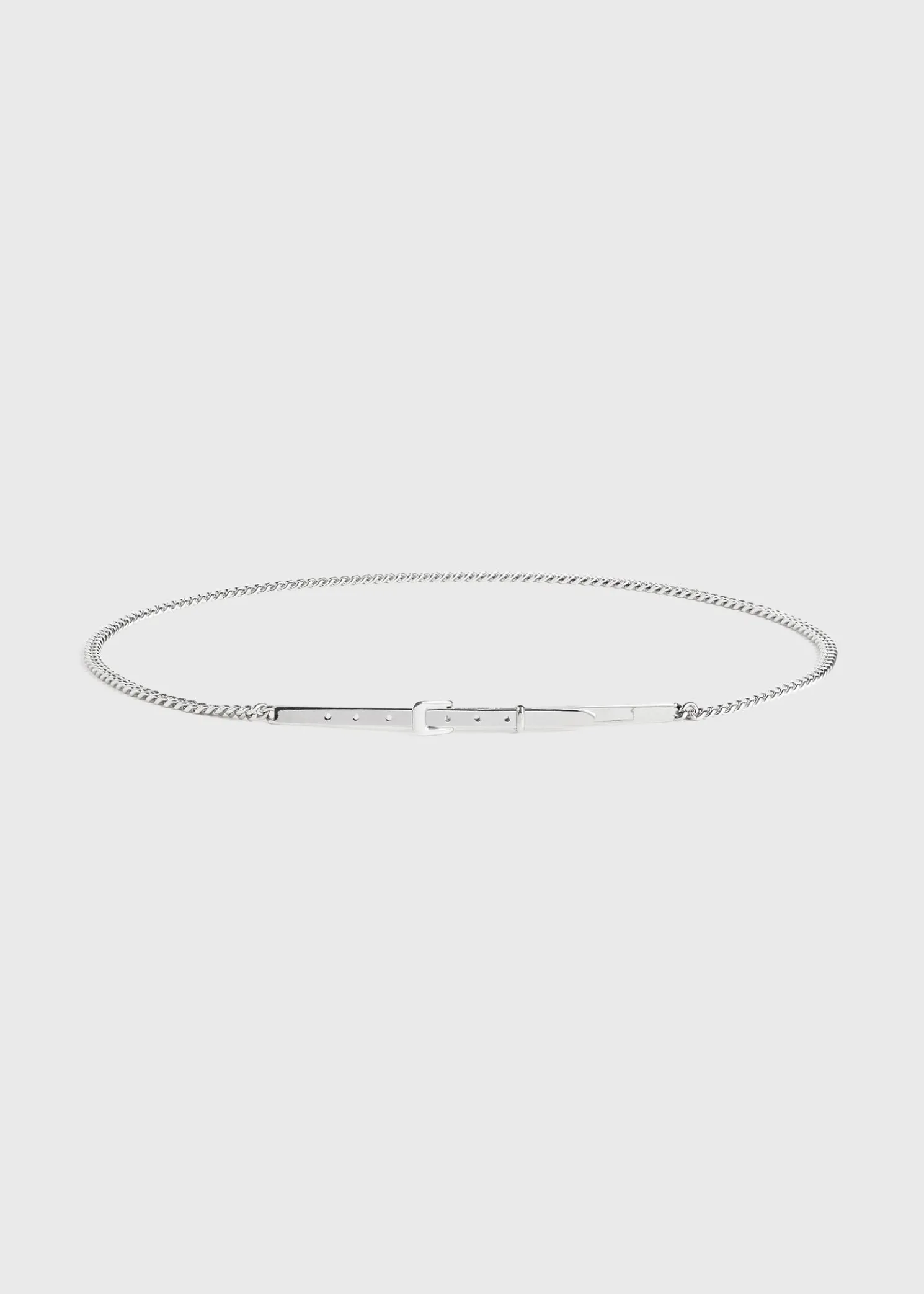 Directional TOTEME belt crafted in Italy from shiny rhodium-plated brass. It consists of a slim curb chain set with rigid edges where the matching buckle can be adjusted to different sizes. Let it stand out over dark separates.