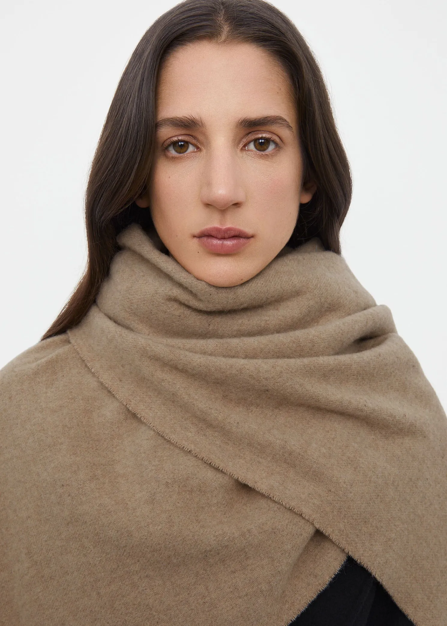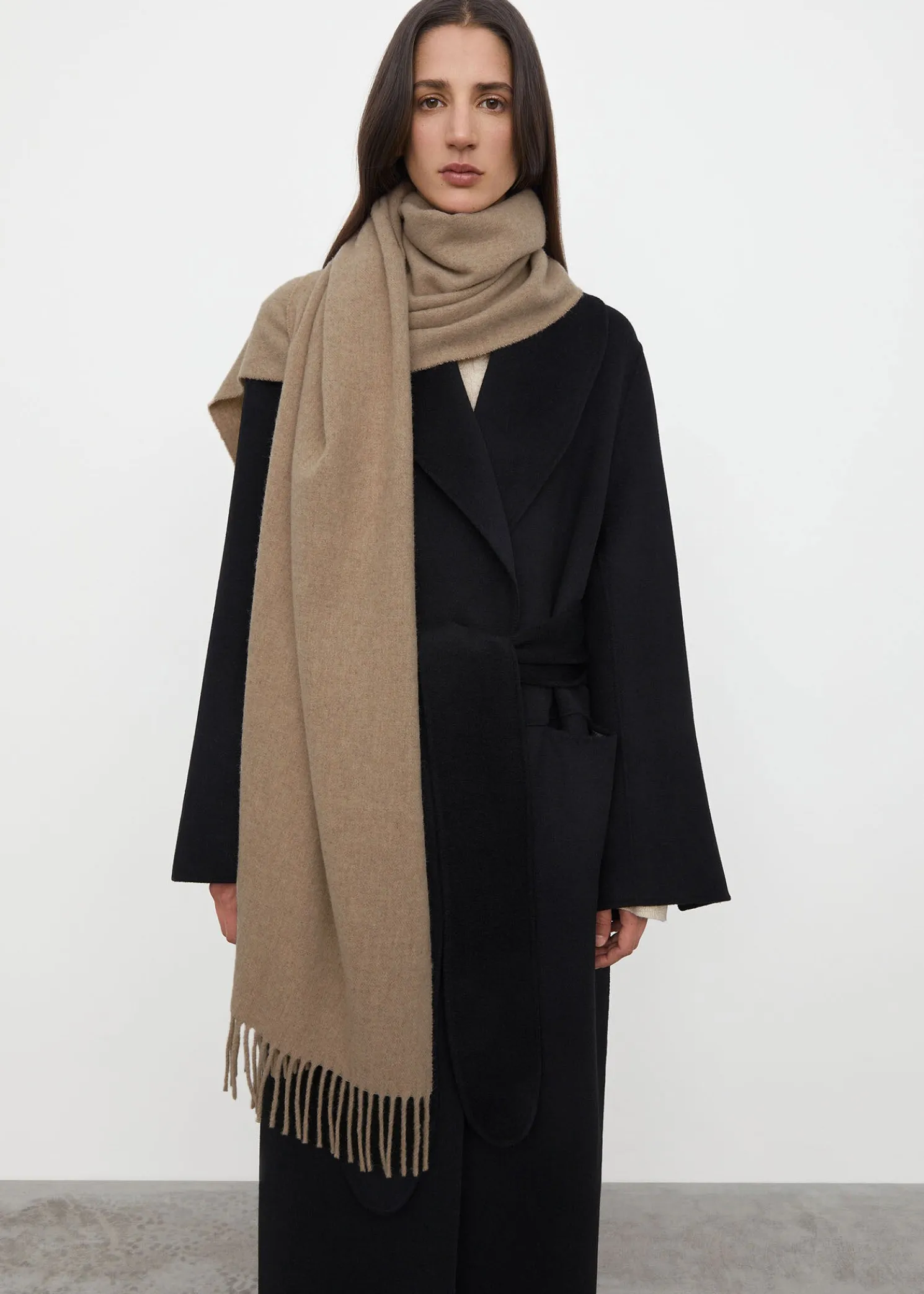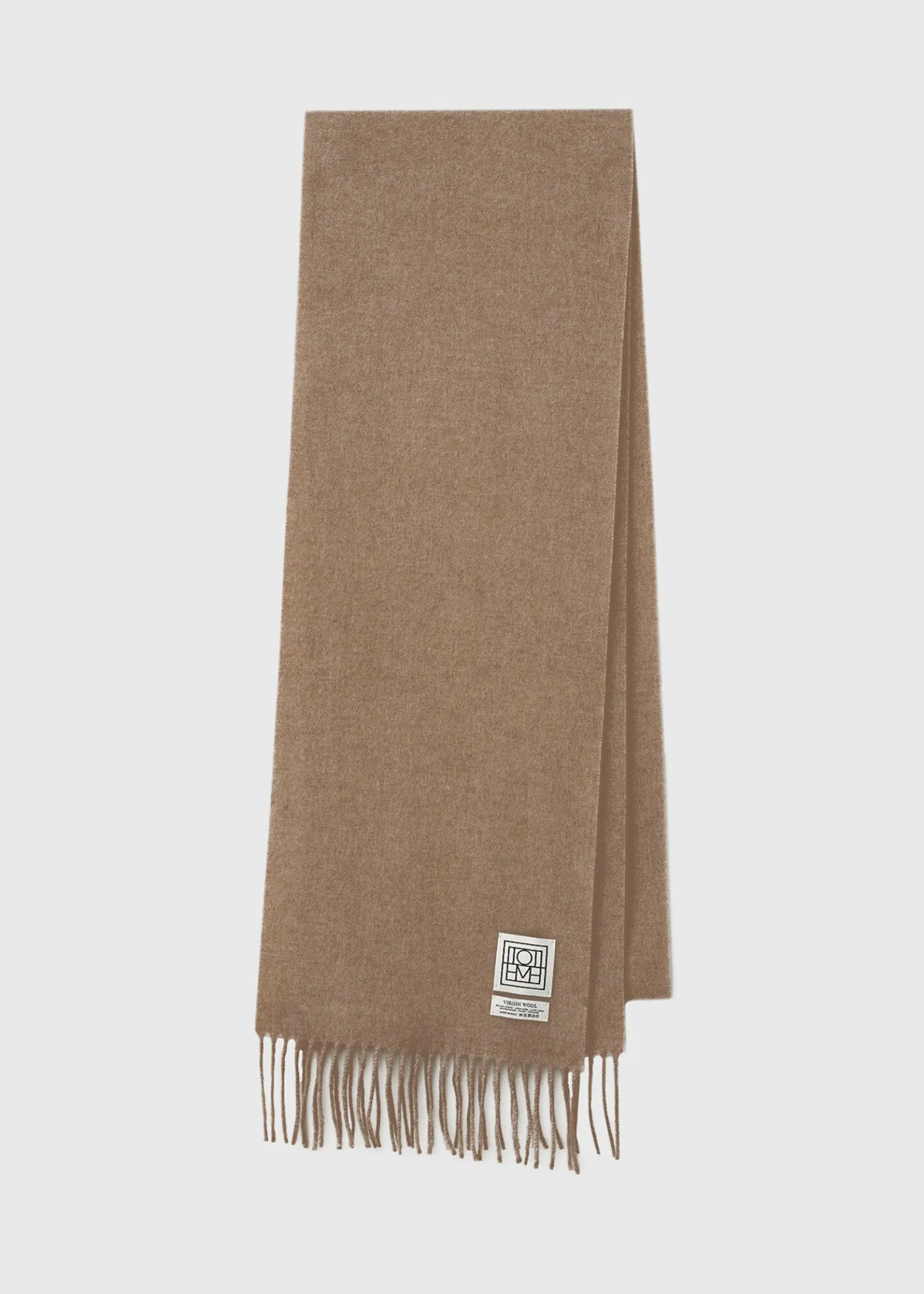 Classic TOTEME scarf made in Italy from responsibly sourced wool. It has a rectangular shape measuring 200x50cm with fringed edges and a monogram label. Wear it throughout winter over your favorite coat or jacket.