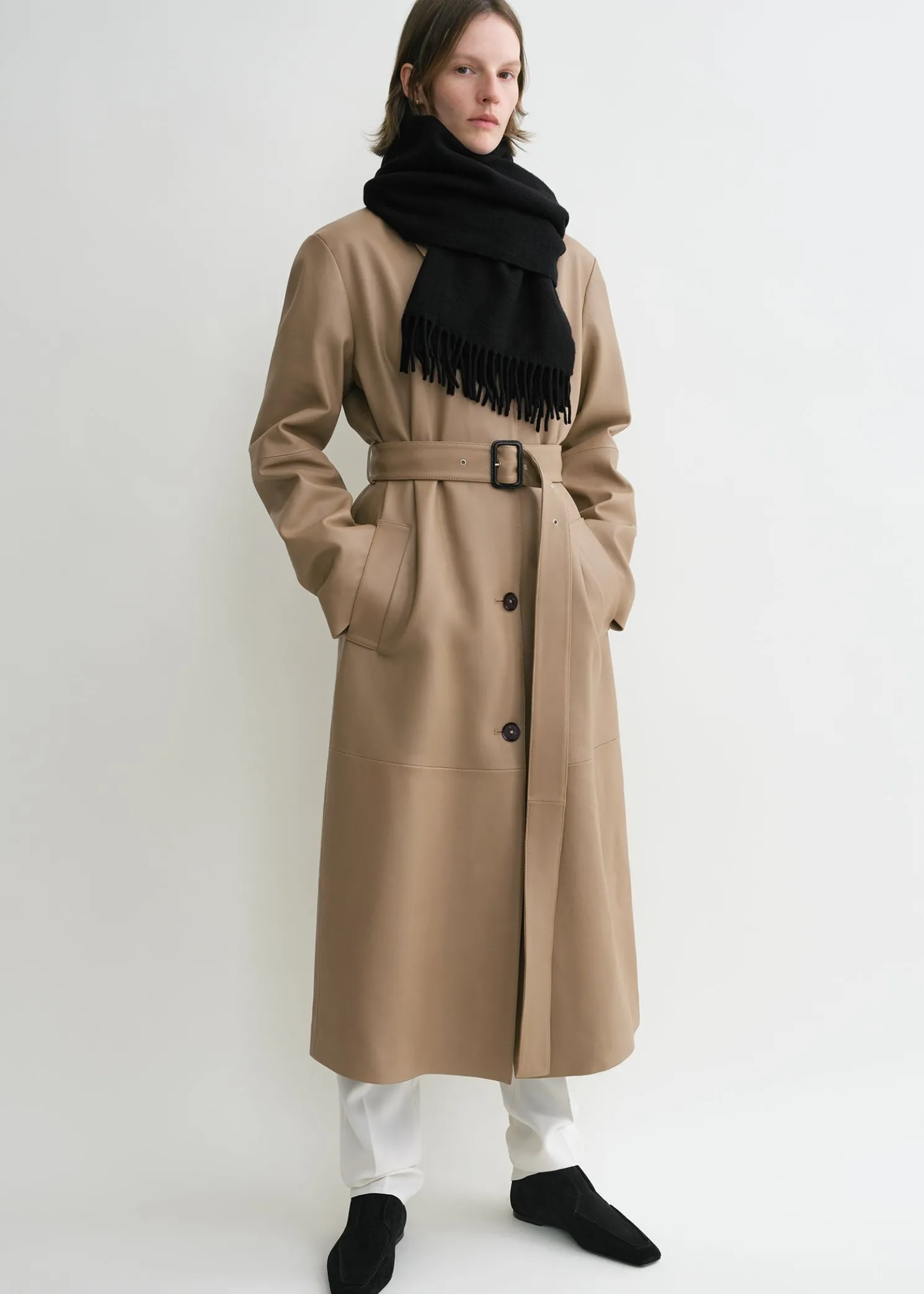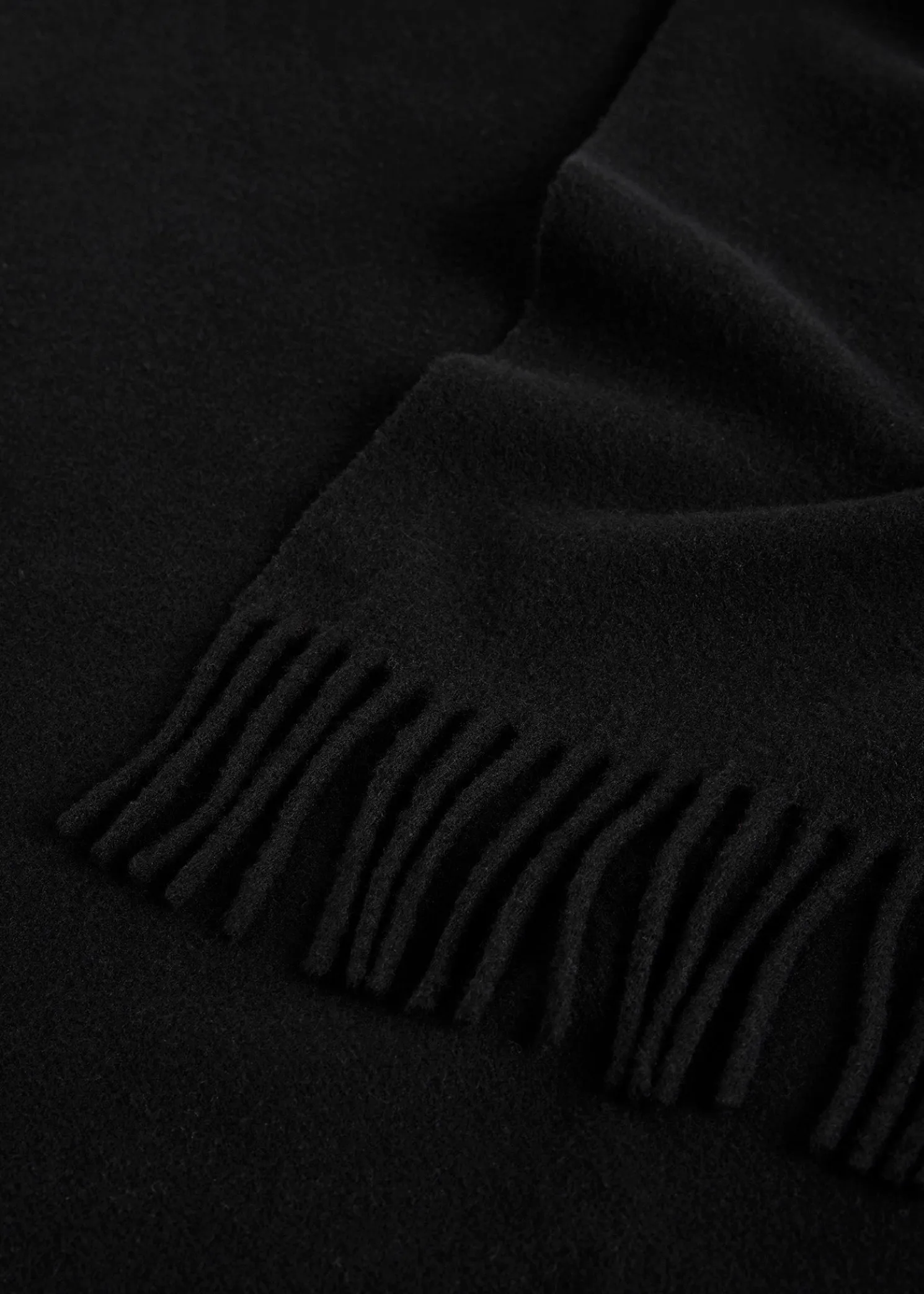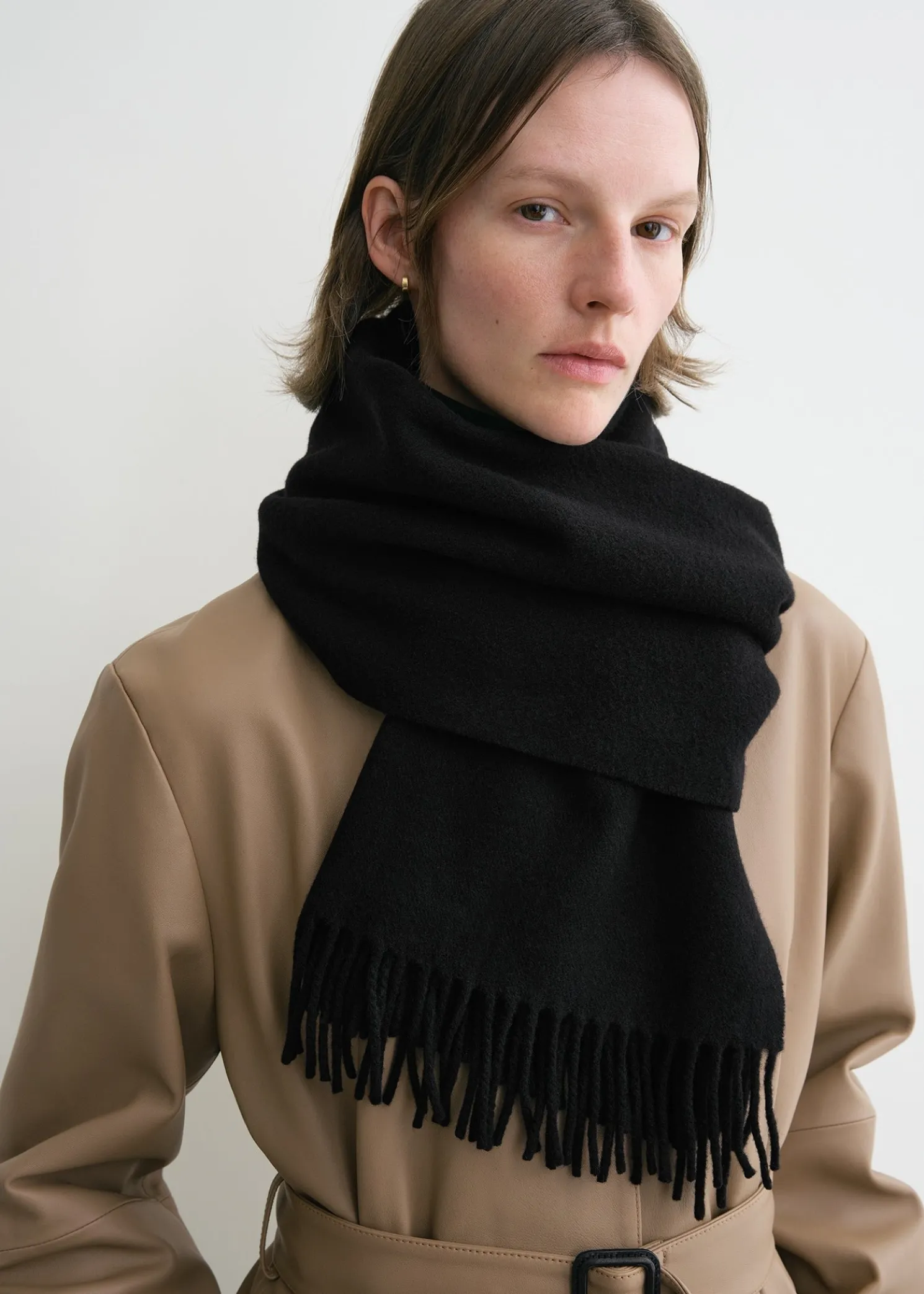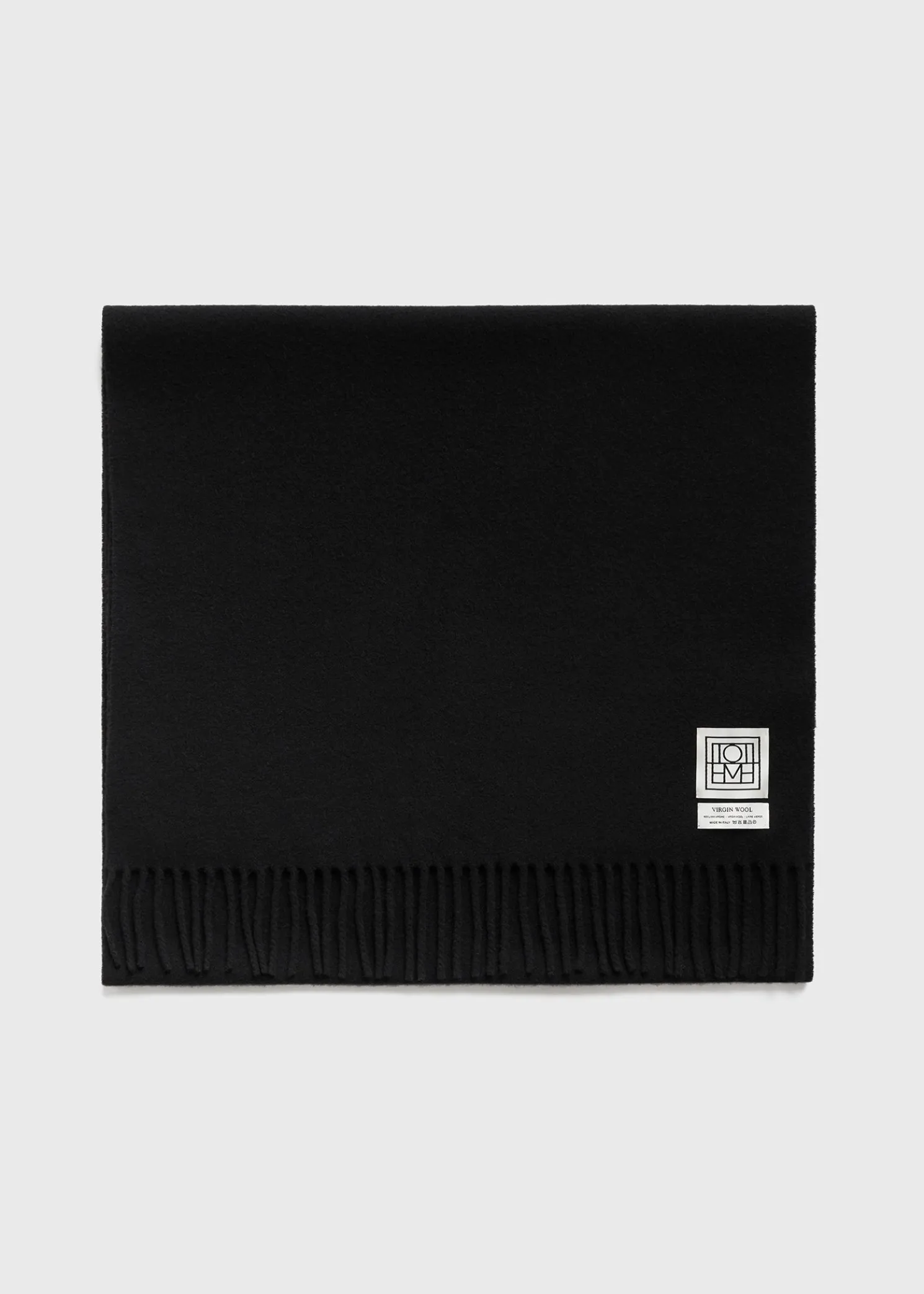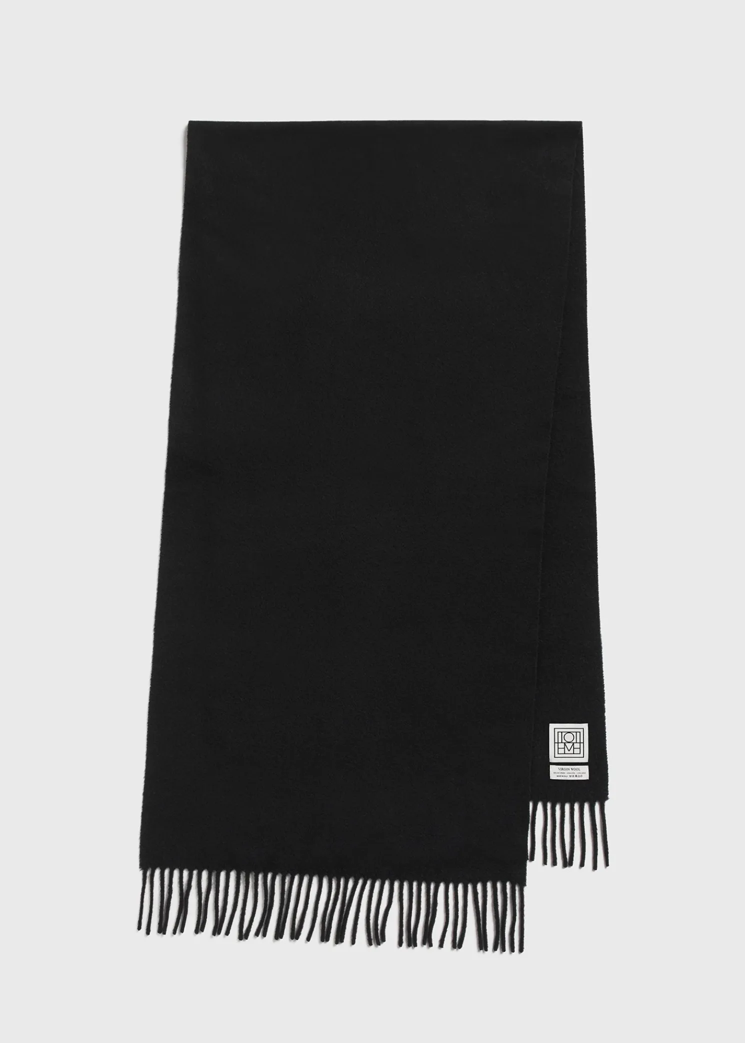 nnClassic TOTEME scarf made in Italy from responsibly sourced wool. It has a rectangular shape measuring 220x50cm with fringed edges and a monogram label. Wear it throughout winter over your favorite coat or jacket.