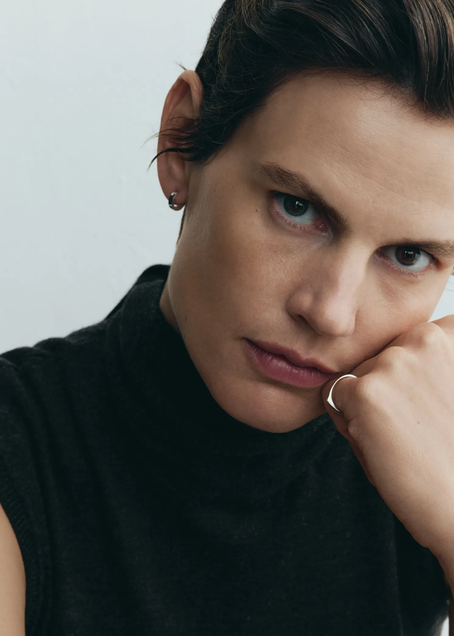 TOTEME ring featuring a single brilliant-cut diamond in a bezel setting that feels minimalist and considered. It is crafted in Arezzo, Italy by expert jewelry makers from palladium-reinforced, recycled 18kt white gold with a partial chain construction instilling movement into the piece.