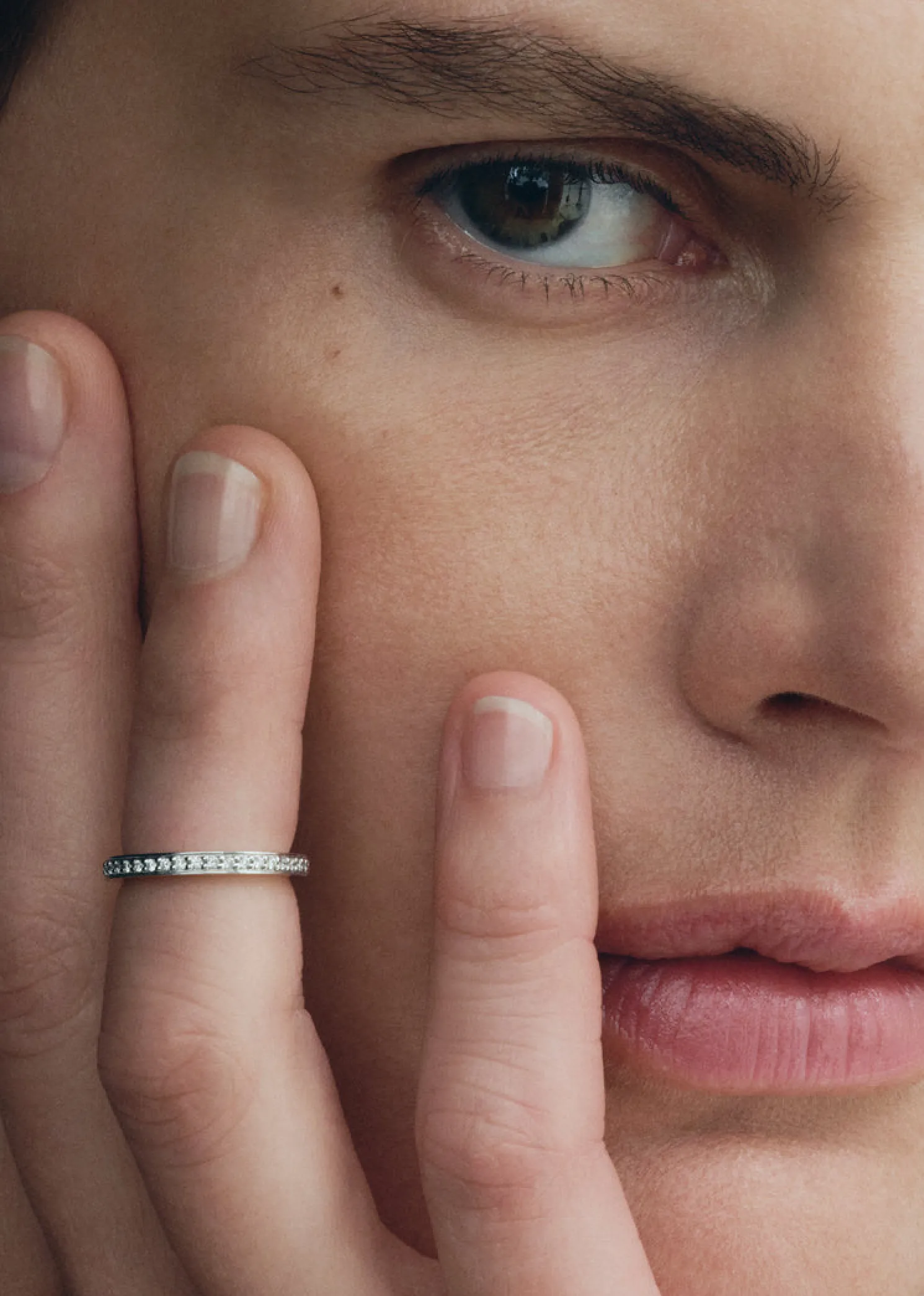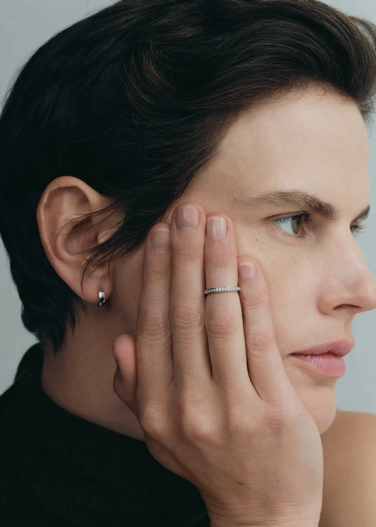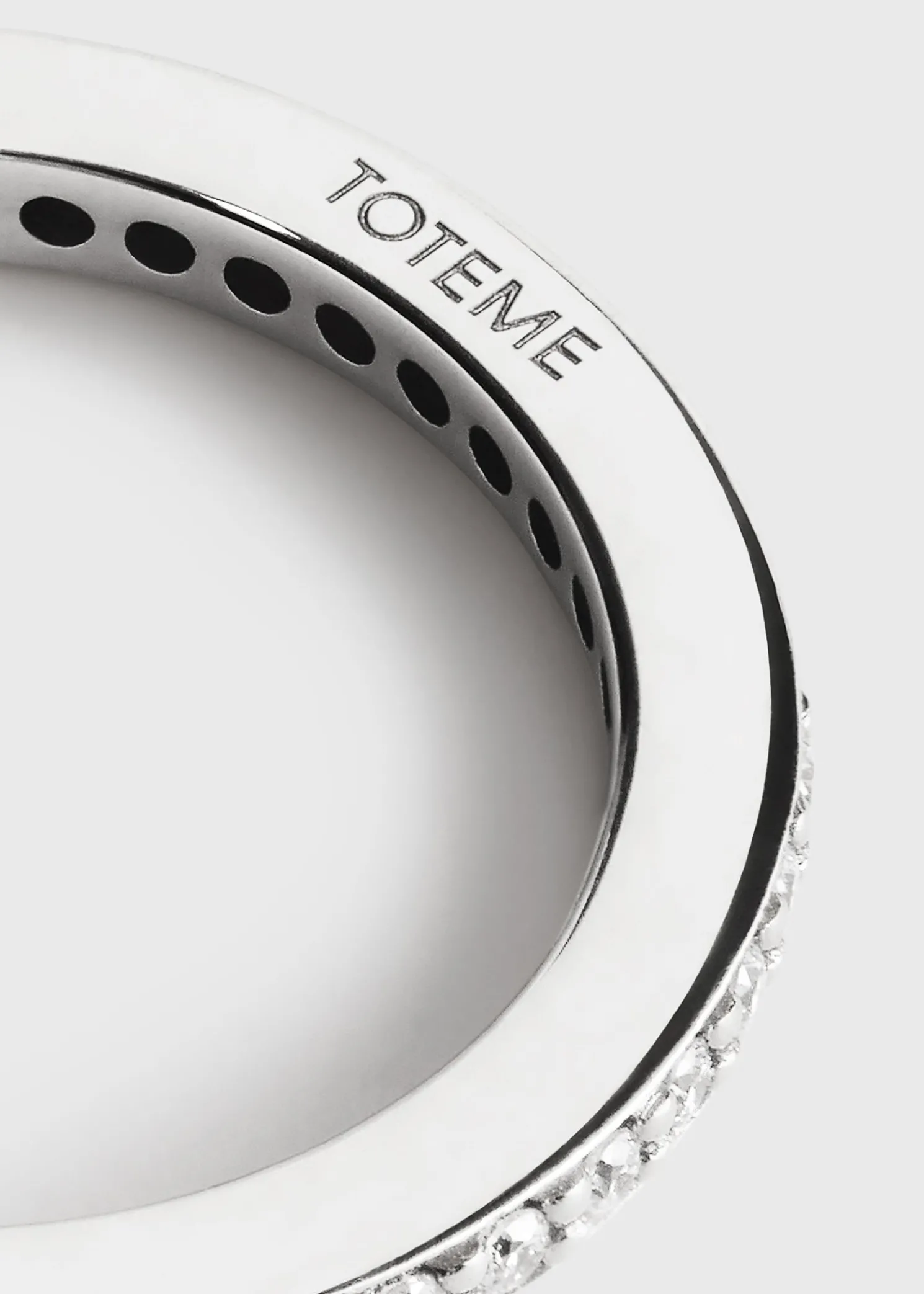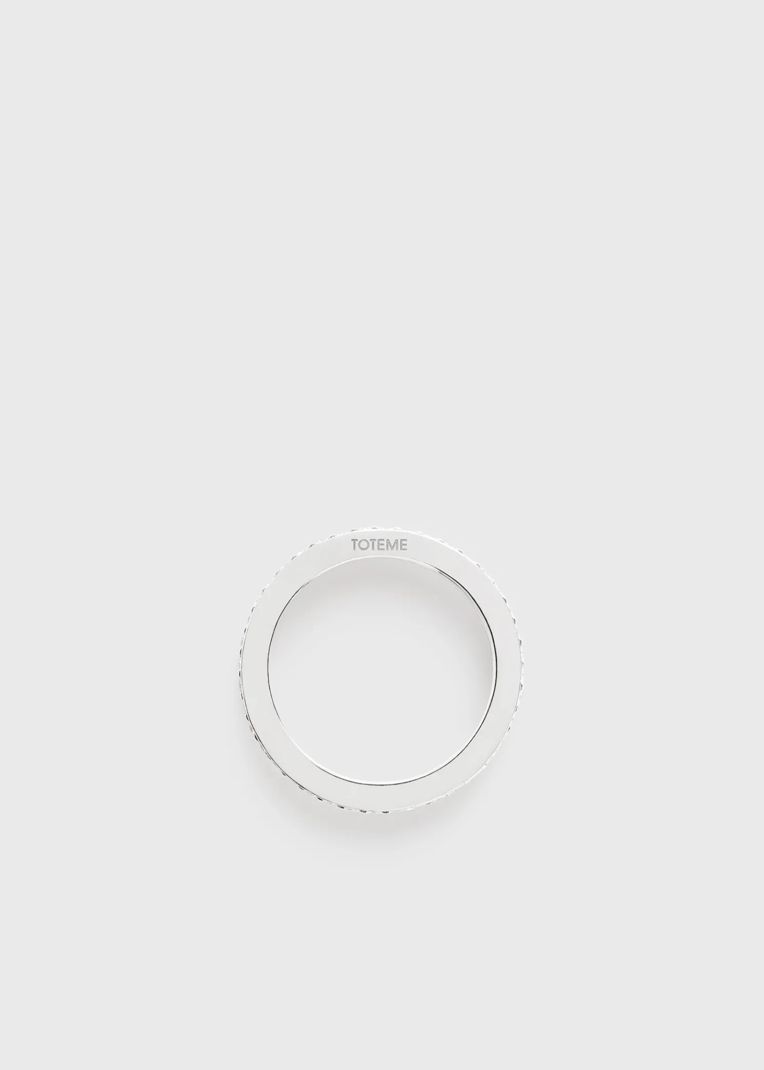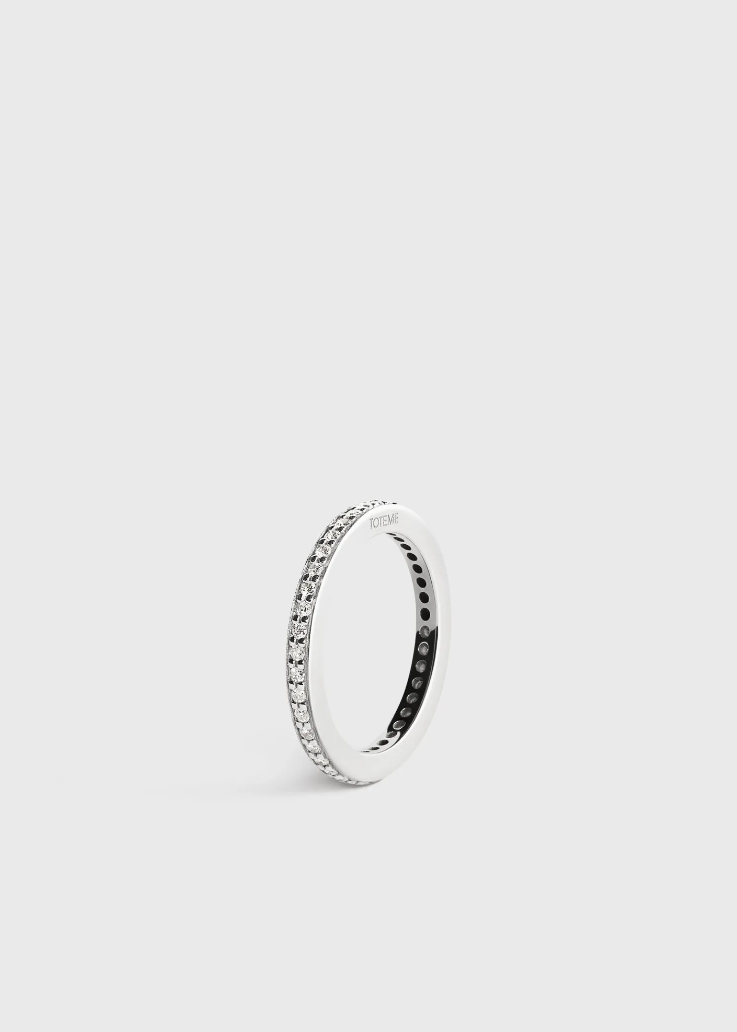 The TOTEME eternity ring is shaped to modern midi proportions devised to rest above the knuckle solo or stacked with other rings. It is crafted in Arezzo, Italy from recycled 18kt white gold grain-set with brilliant-cut diamonds supported by prongs for a classic result.