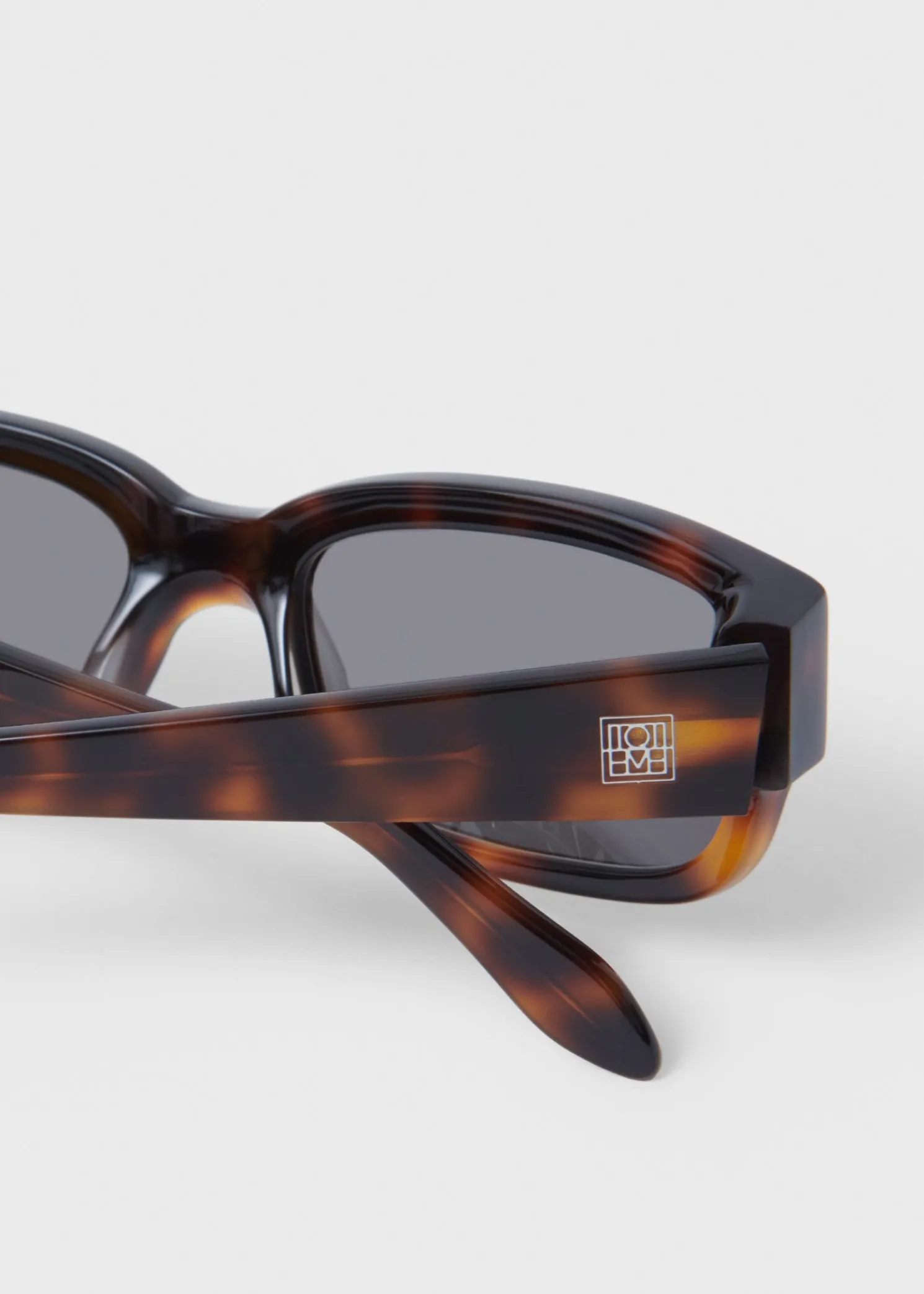 TOTEME sunglasses handmade in Italy from thick polished acetate. They are shaped to a classic rectangular silhouette with soft rounded edges and sleek arms, and have smoke tone UV protection lenses and a silver metal-engraved monogram. The sunglasses come in a pouch cut from TOTEME’s signature doublé wool cashmere fabric.