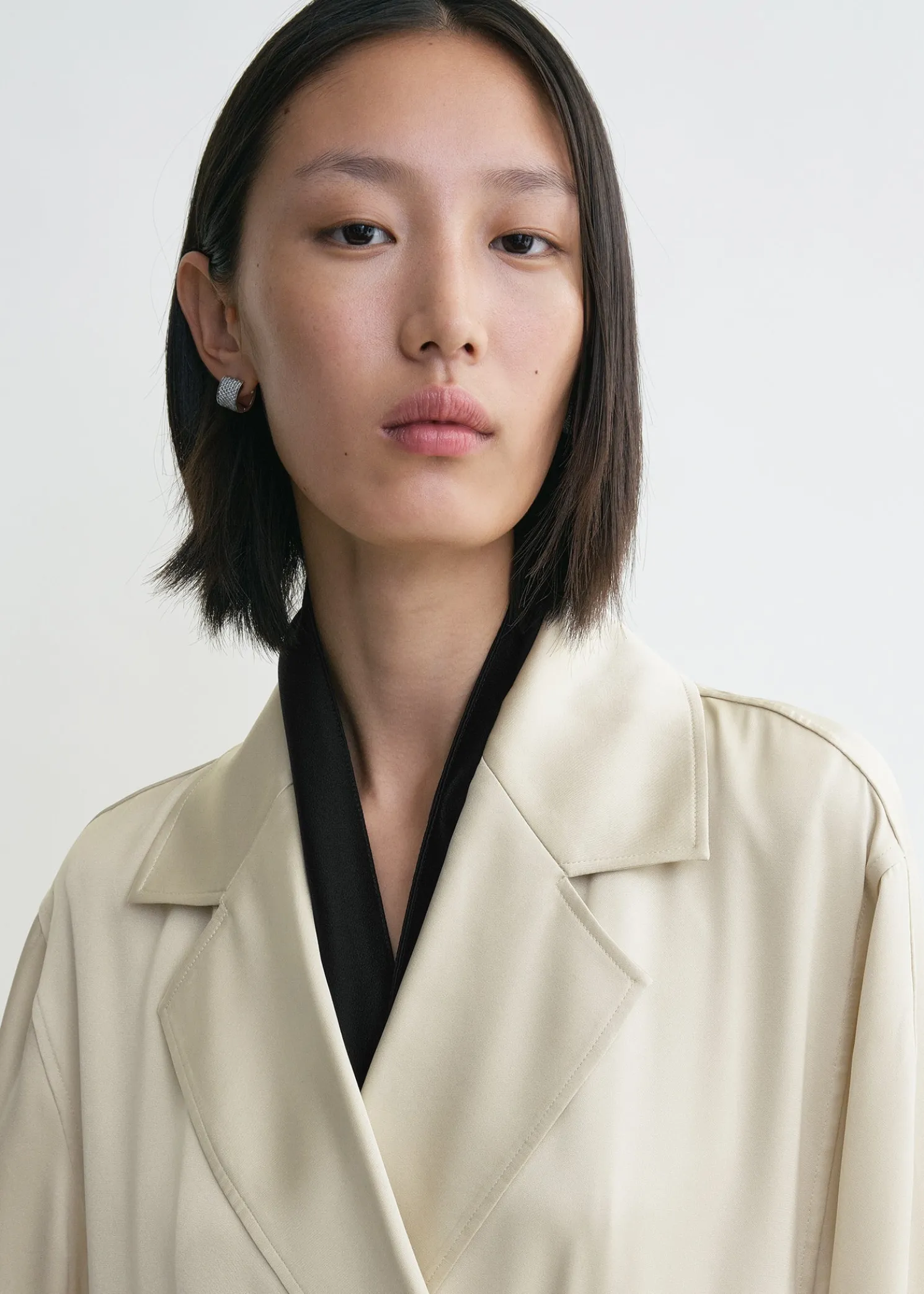 Inspired by the collection’s tuxedo theme, this TOTEME shawl scarf is made from lustrous charmeuse satin to mimic an untied bow tie draping from the neck. Complete an evening look by styling it tucked underneath a suit jacket.