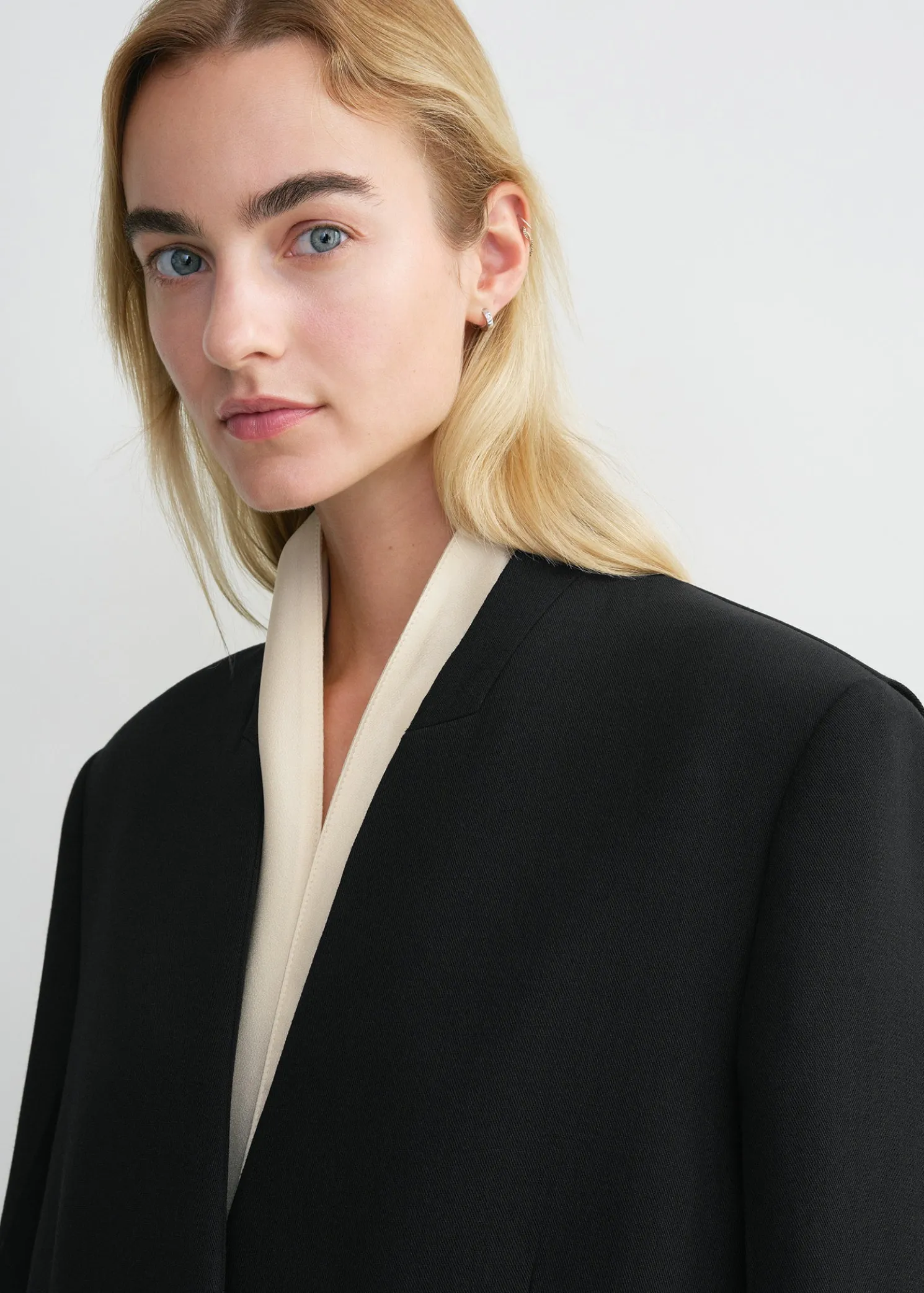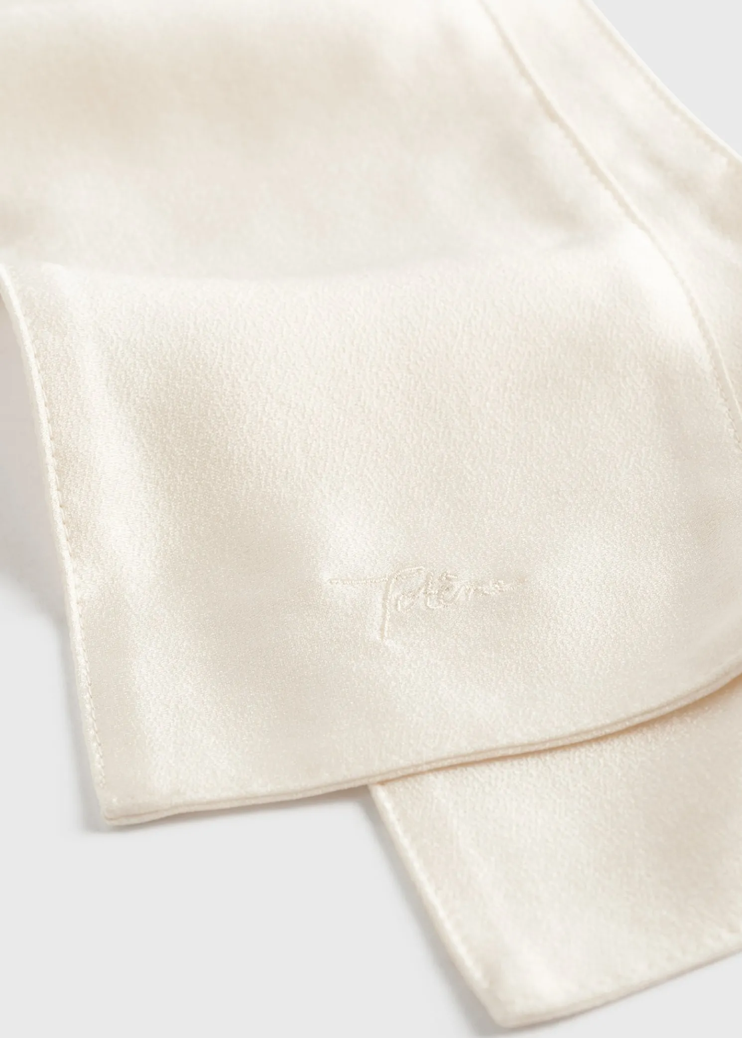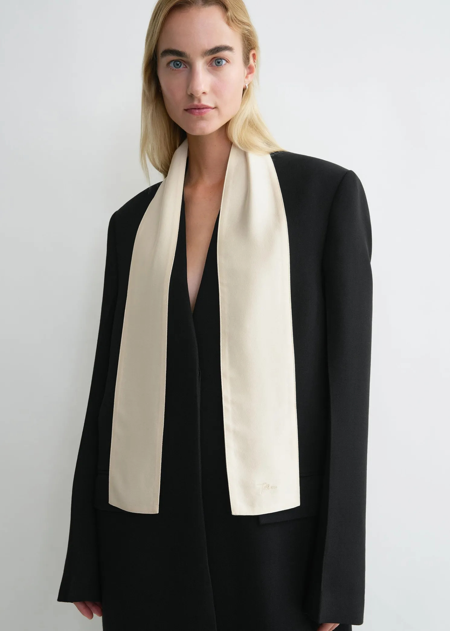 Inspired by the collection’s tuxedo theme, this TOTEME shawl scarf is made from lustrous charmeuse satin to mimic an untied bow tie draping from the neck. Complete an evening look by styling it tucked underneath a suit jacket.