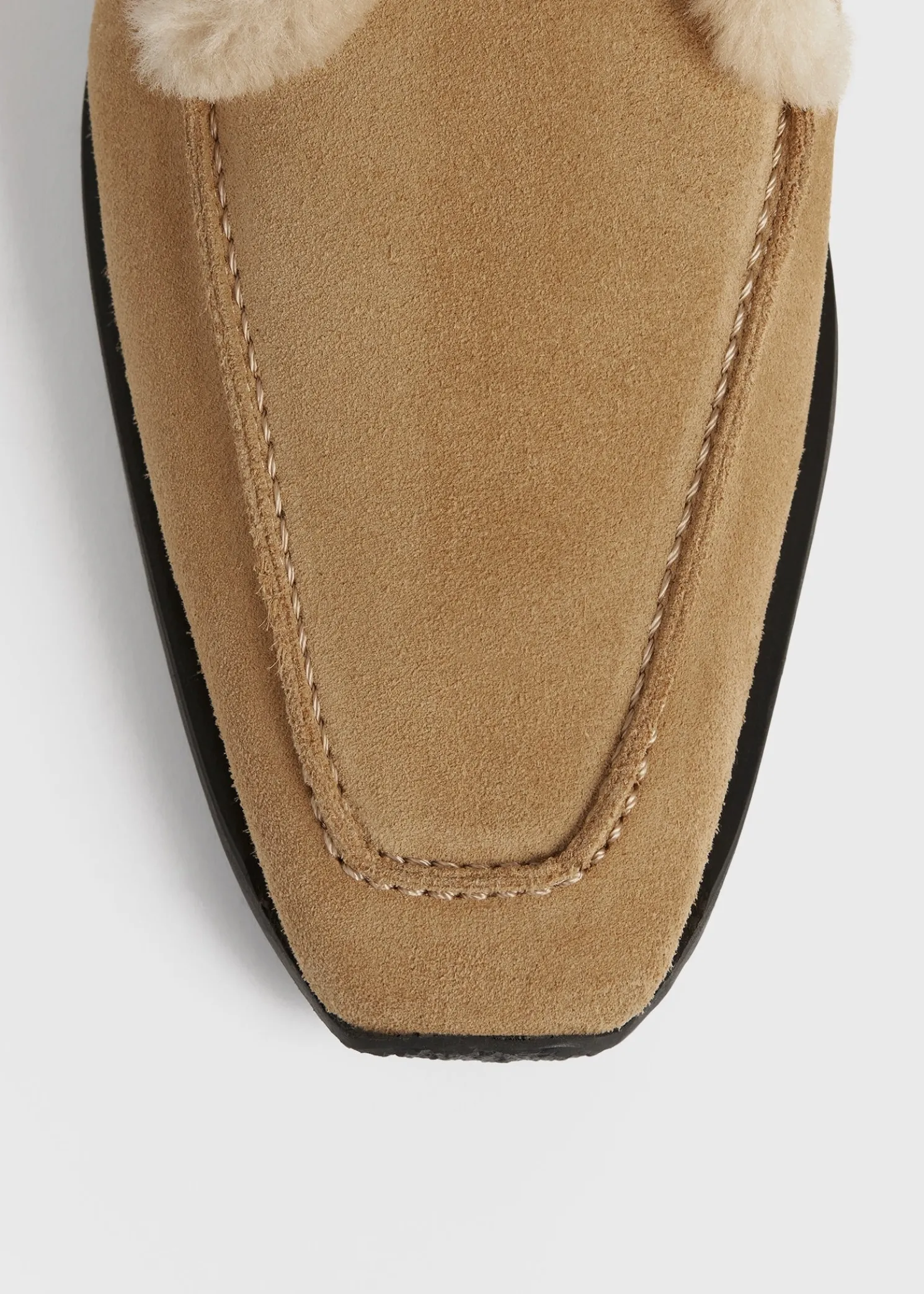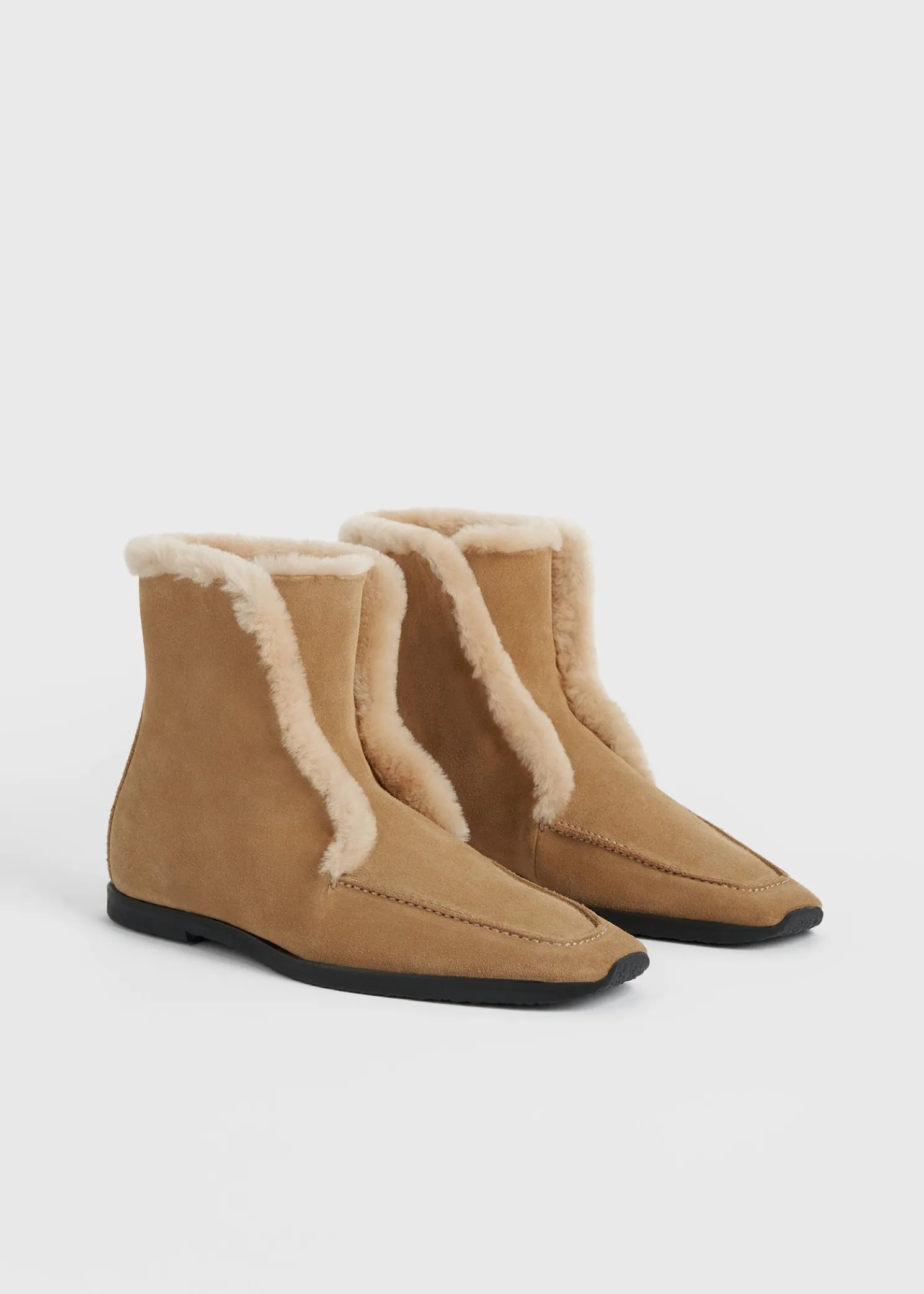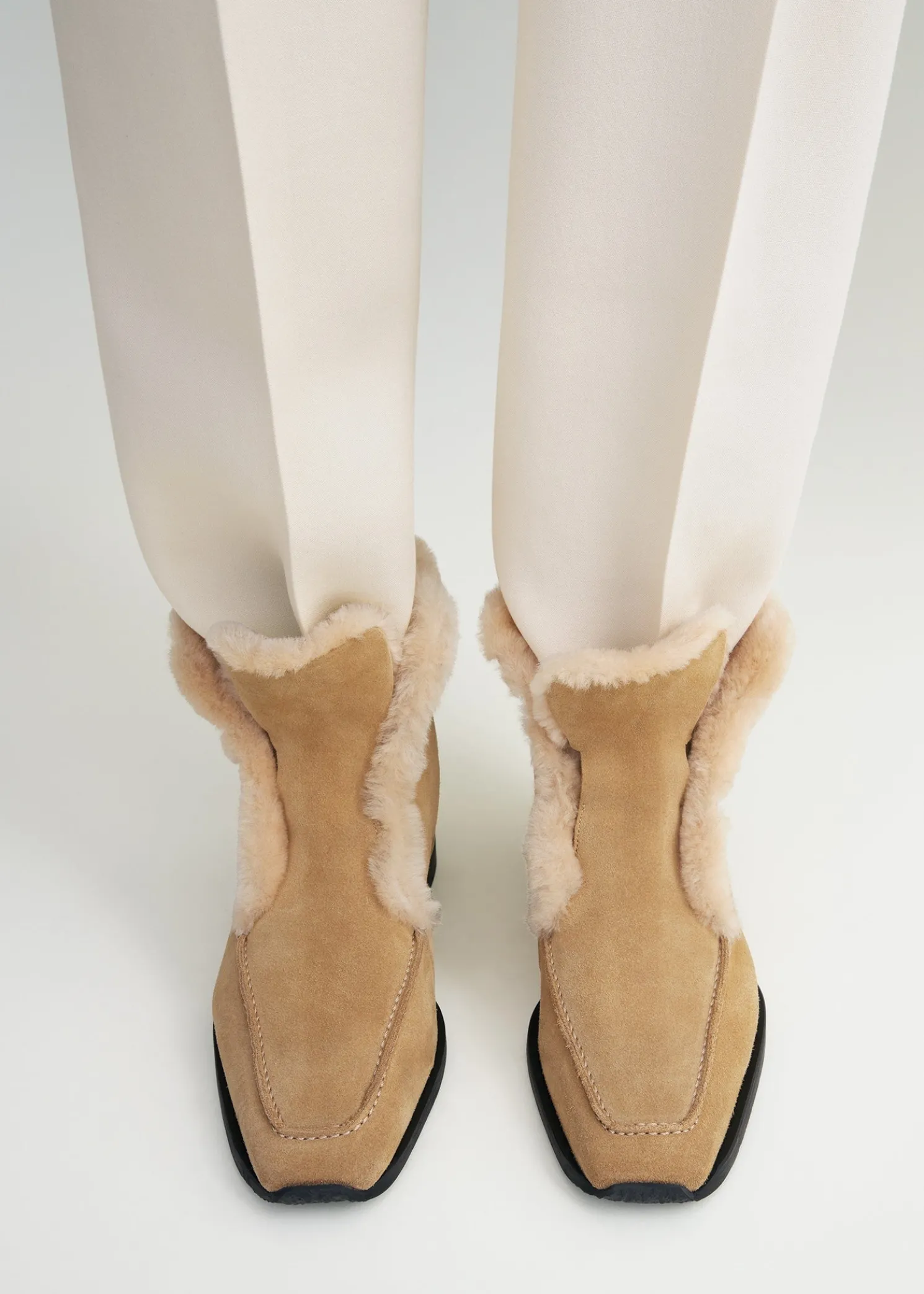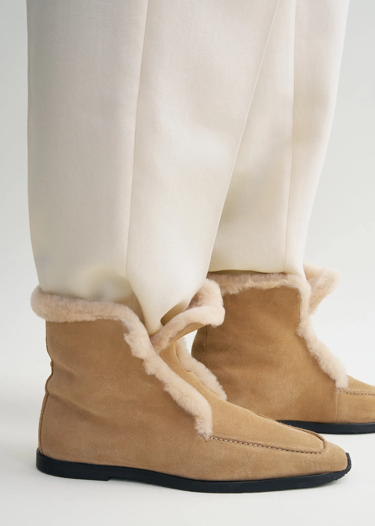 TOTEME winter boots lined in warm ecru shearling and fitted with an elasticated tongue for easy wearing. They have a relaxed shape made from suede and are set on a textured rubber sole. Tuck your trouser cuffs inside to stay warm.
