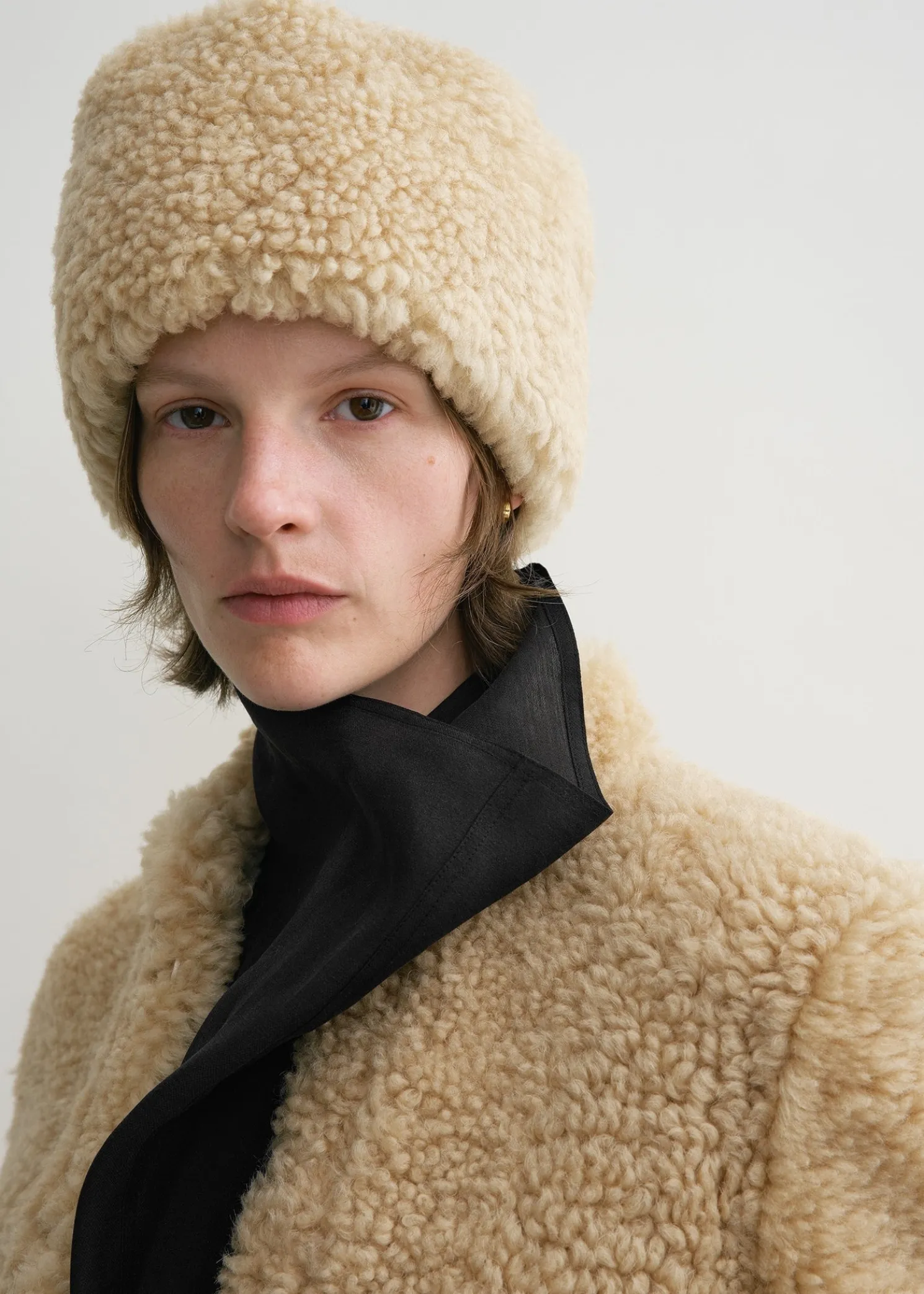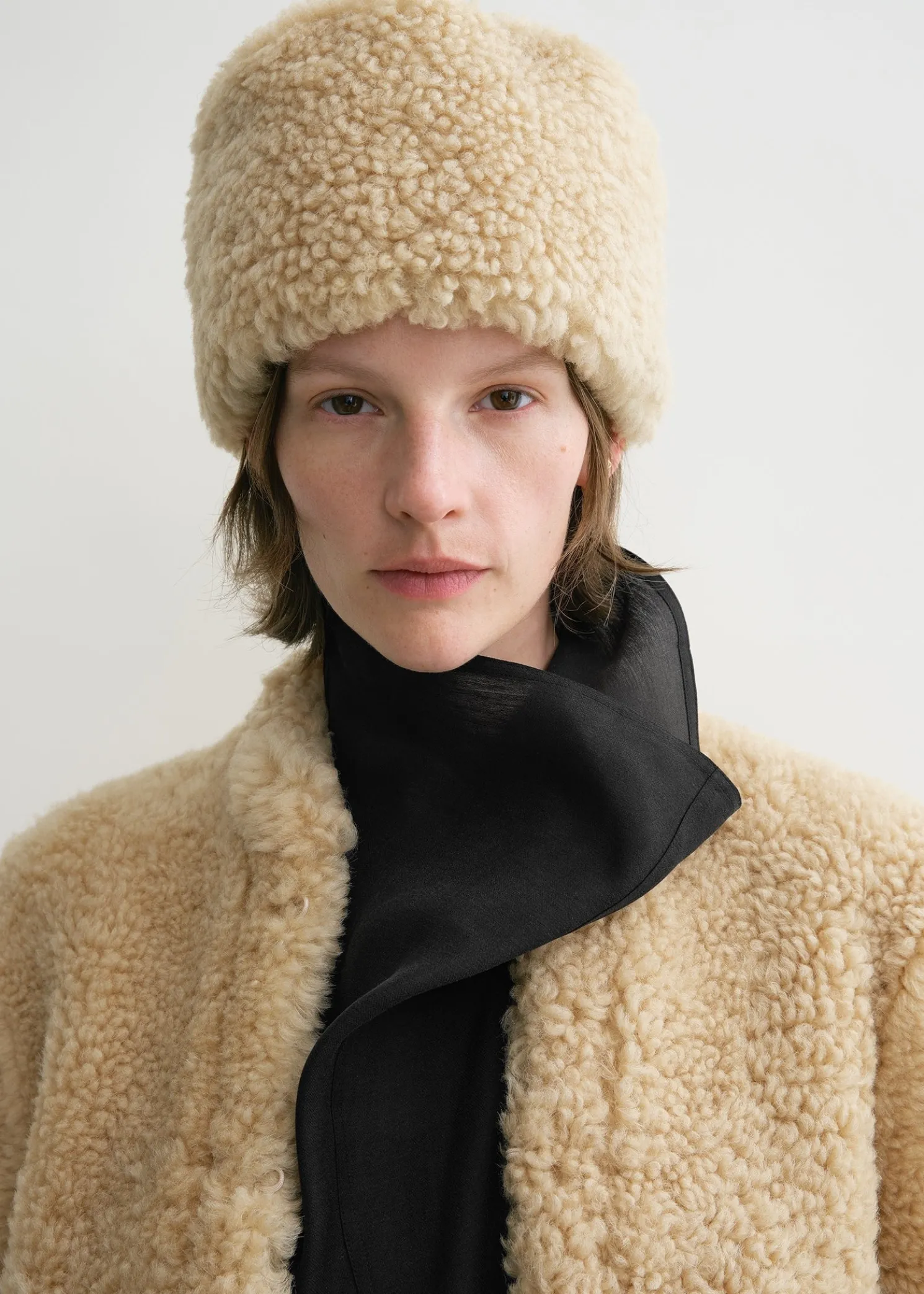 TOTEME hat shaped with a stylish pillbox silhouette. It is crafted from warm Astrakhan shearling with a bubbly texture and finished with a partial suede reverse. Complete a winter look with a coordinated coat.n