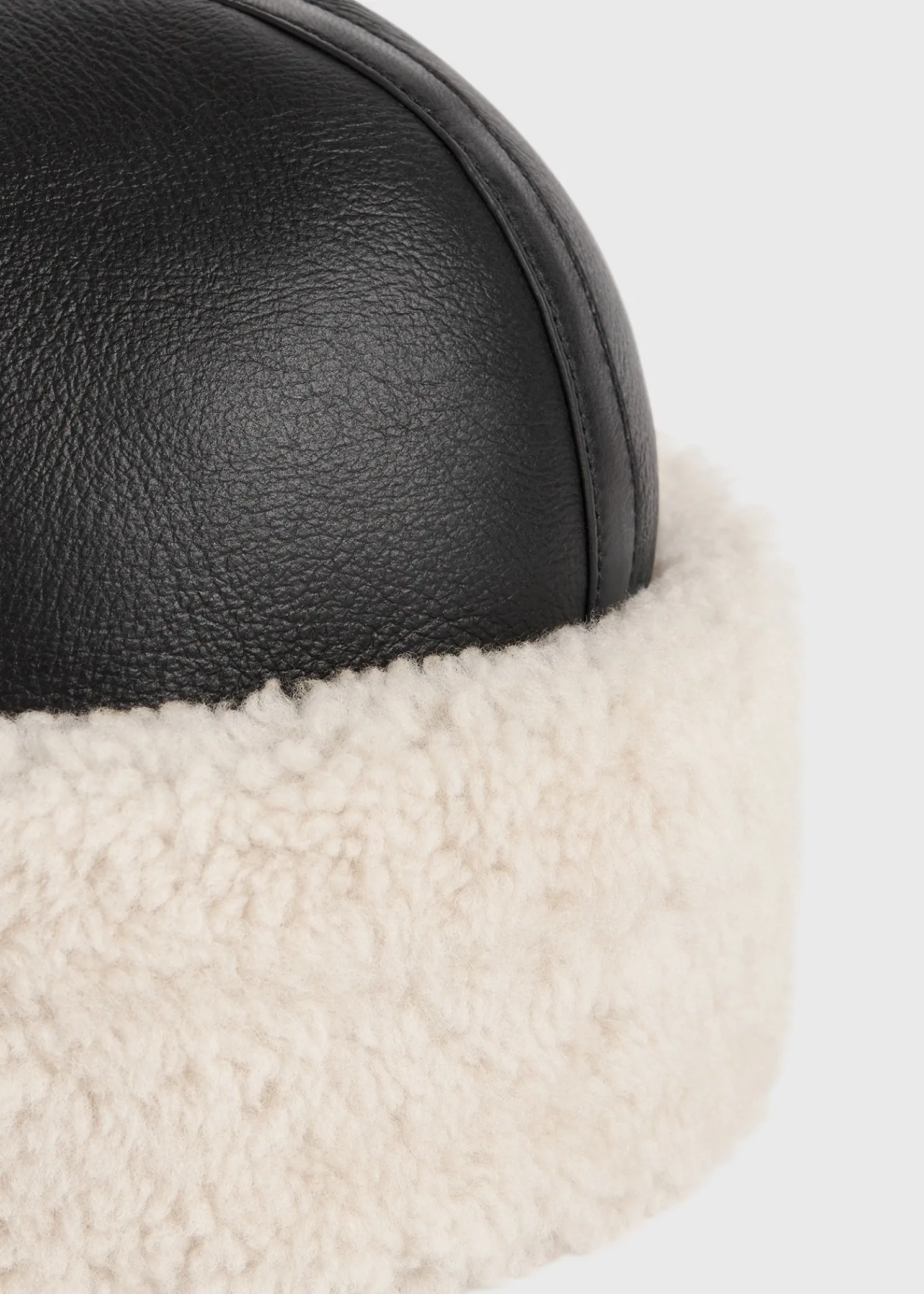TOTEME winter hat crafted from warm lamb shearling. It has a stand-up crown supported with crossover leather strips and a wide foldover edge, and comes in two sizes. Wear it with a heavy coat and denim for a city stroll.