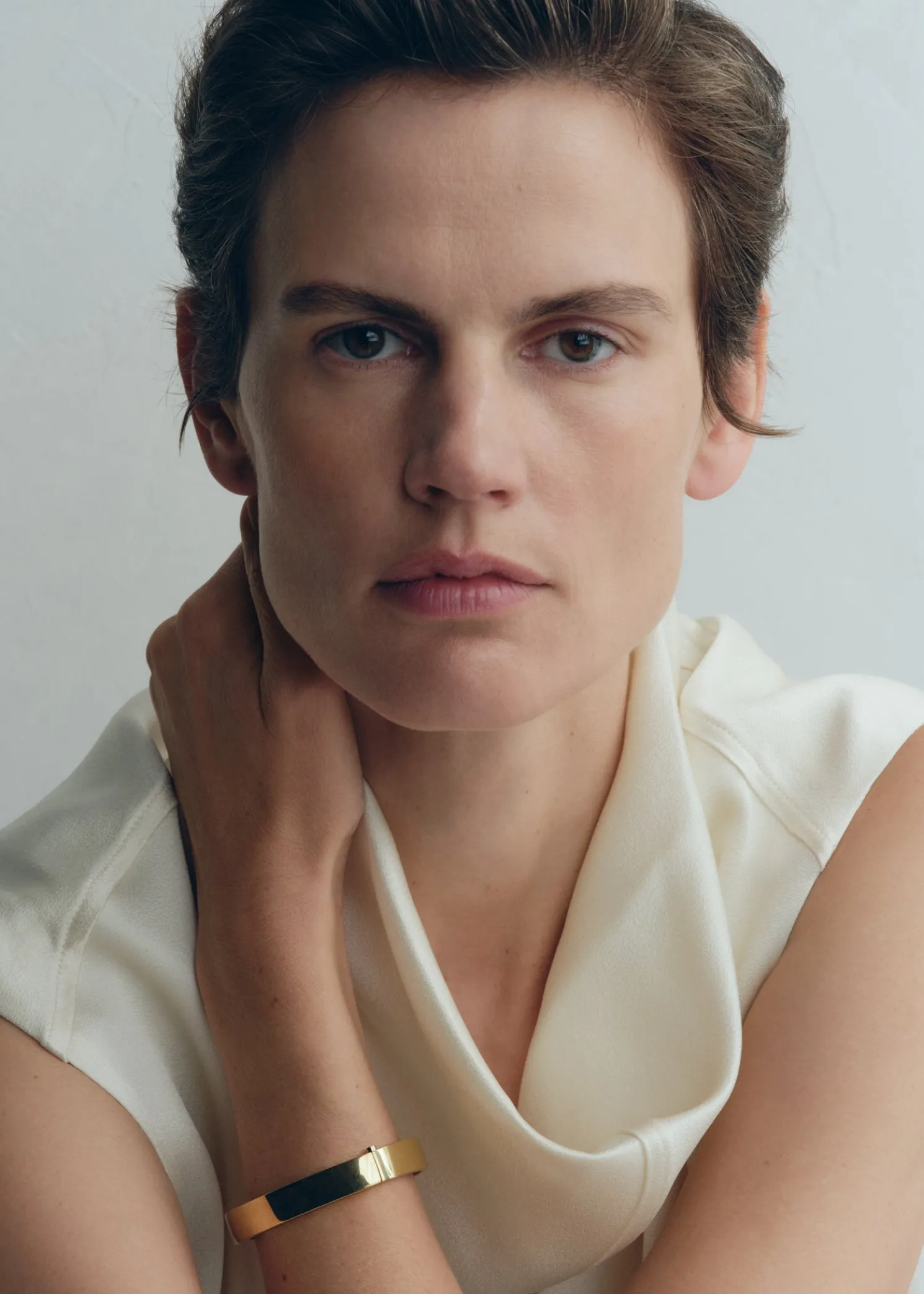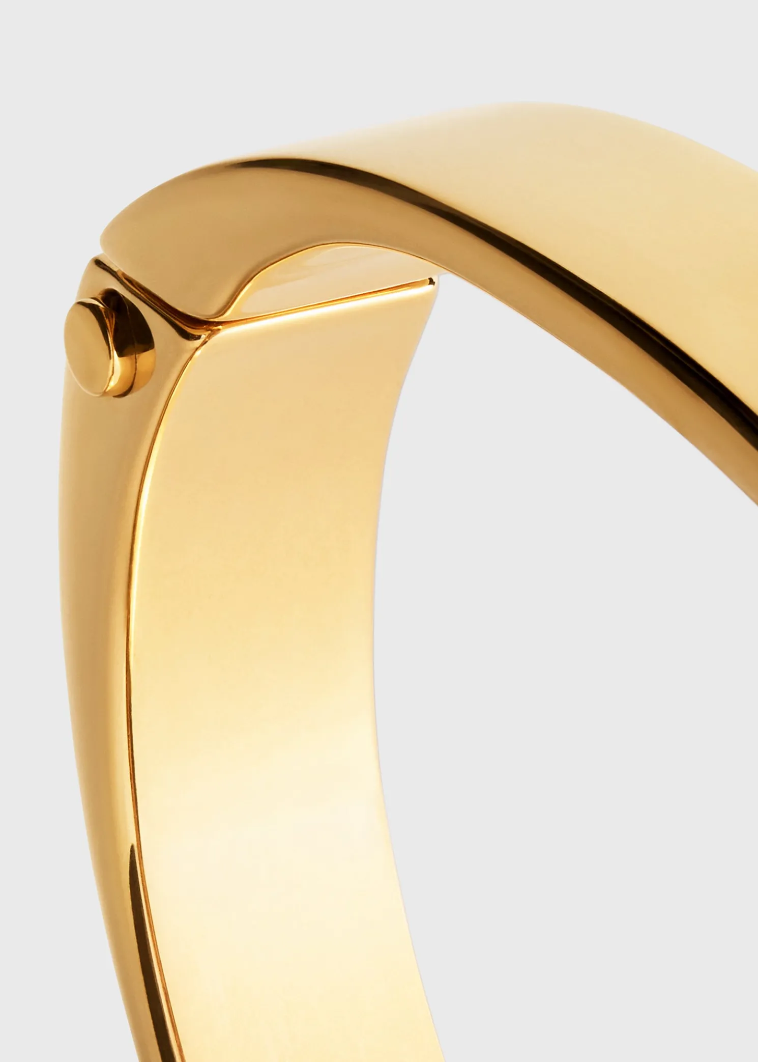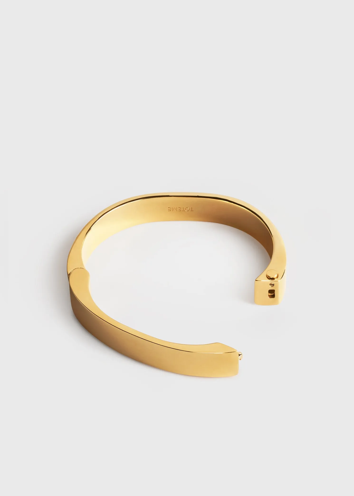 TOTEME Signature bracelet curated with a minimalist point of view to sharp proportions. It’s made by Italian goldsmiths from hard-wearing 18kt gold-plated brass to a hinged construction that fastens with an effortless push button.