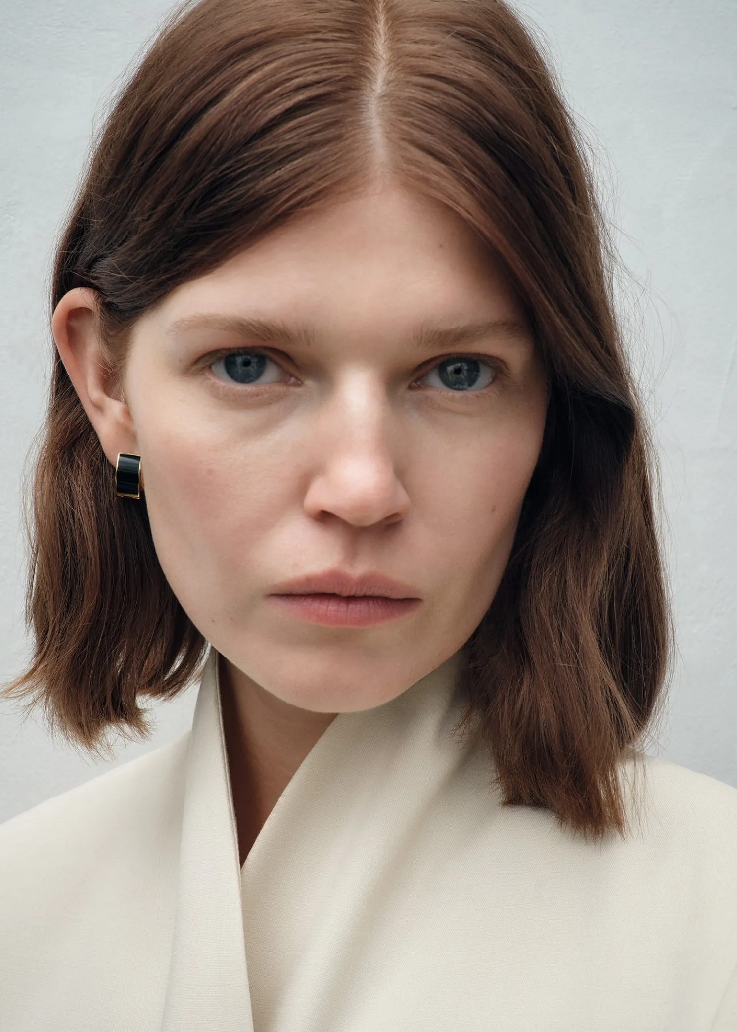 TOTEME Signature huggie hoops shaped with precise lines that transform into an asymmetric oval as you turn them. Made in Italy from hard-wearing 18kt gold-plated brass coated with black enamel as a nod to our monochrome scarves, they’re constructed with a hinged mechanism that clicks as you close them.