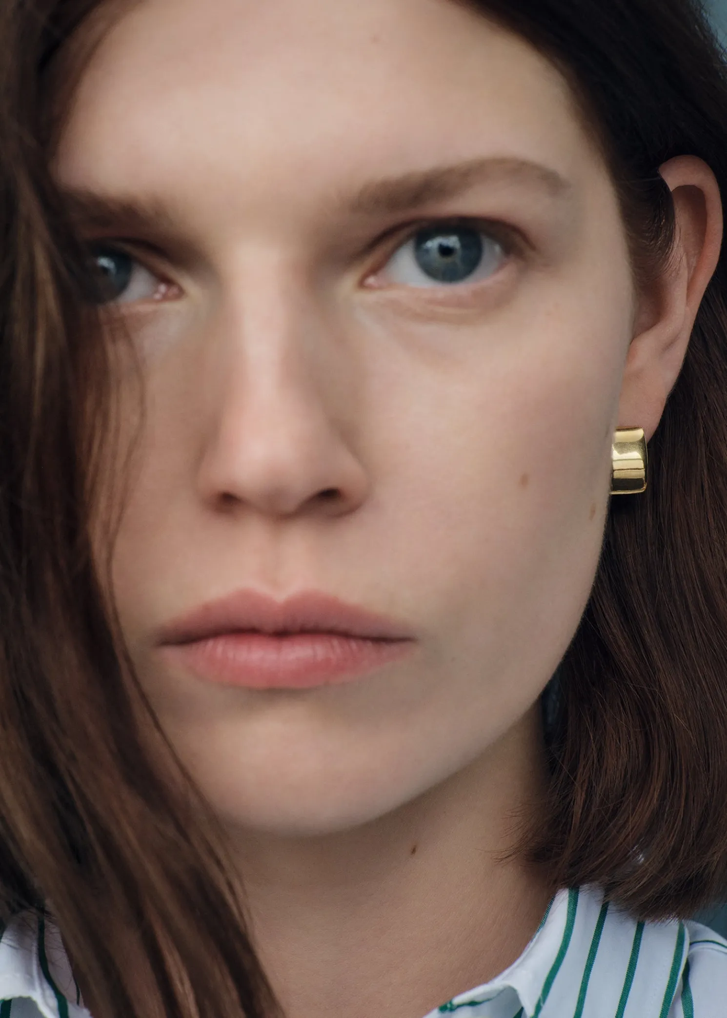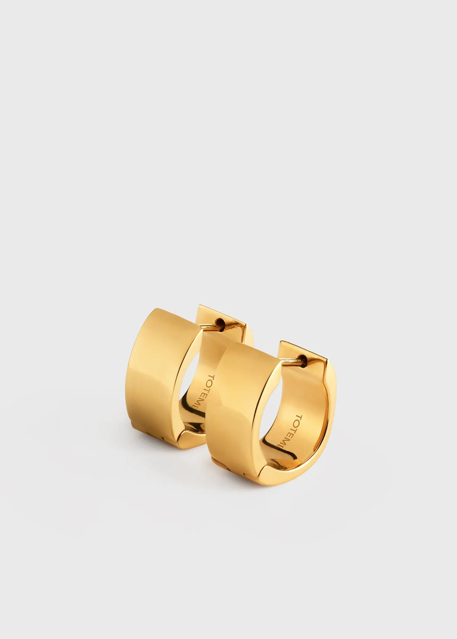 TOTEME Signature huggie hoops shaped with precise lines that transform into an asymmetric oval as you turn them. Made in Italy from hard-wearing 18kt gold-plated brass, they’re constructed with a hinged mechanism that clicks as you close them.
