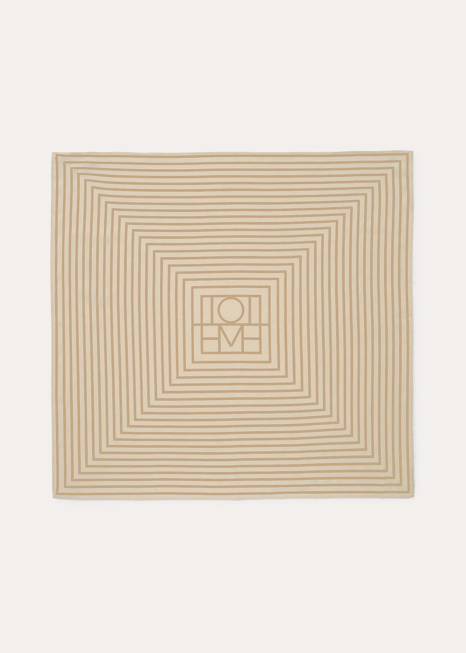 Signature TOTEME scarf woven from featherlight silk yarns. It has a square shape measuring 57x57cm that’s printed with a distinctive monogram in the middle. Wear it around your neck or over your shoulders.
