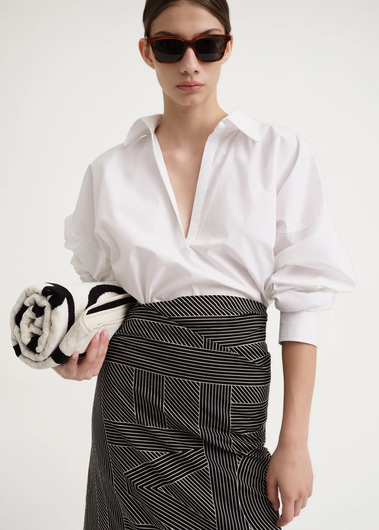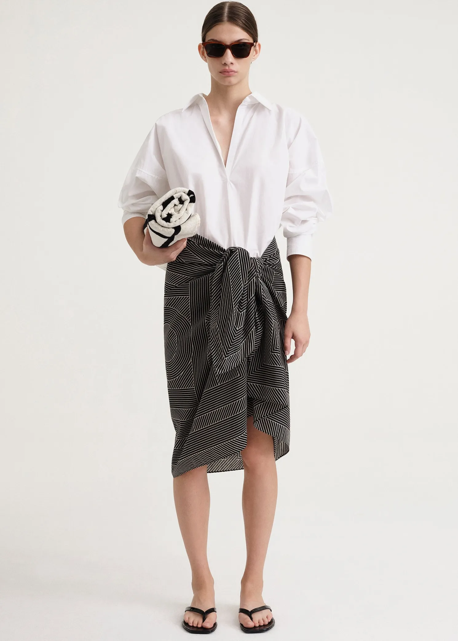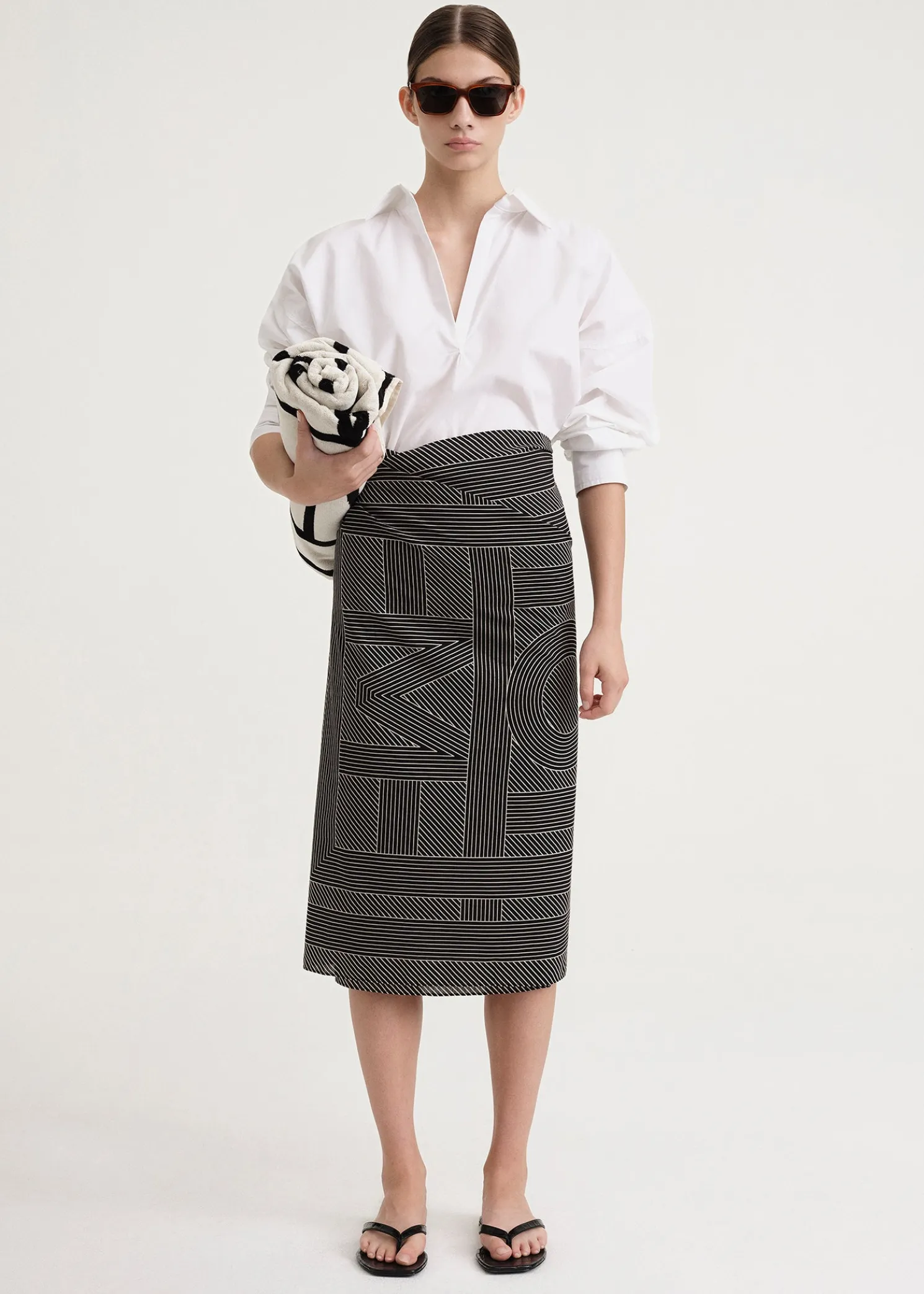 TOTEME beach sarong made from organic cotton blended with silk yarns. It has a rectangular shape printed with the striped monogram pattern, and measures 156x80cm. Wrap it around the High neck swimsuit by the pool.