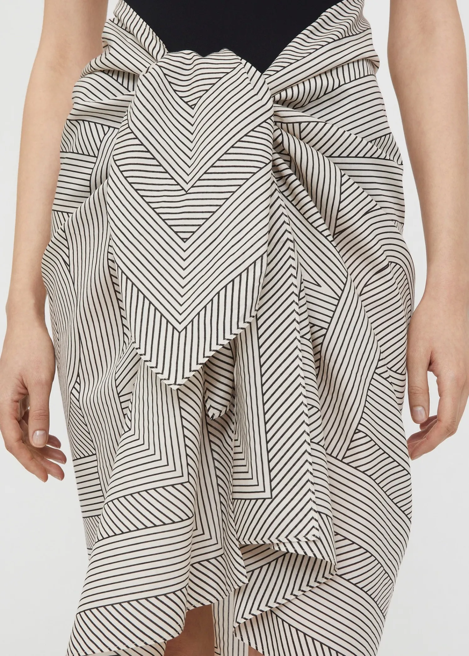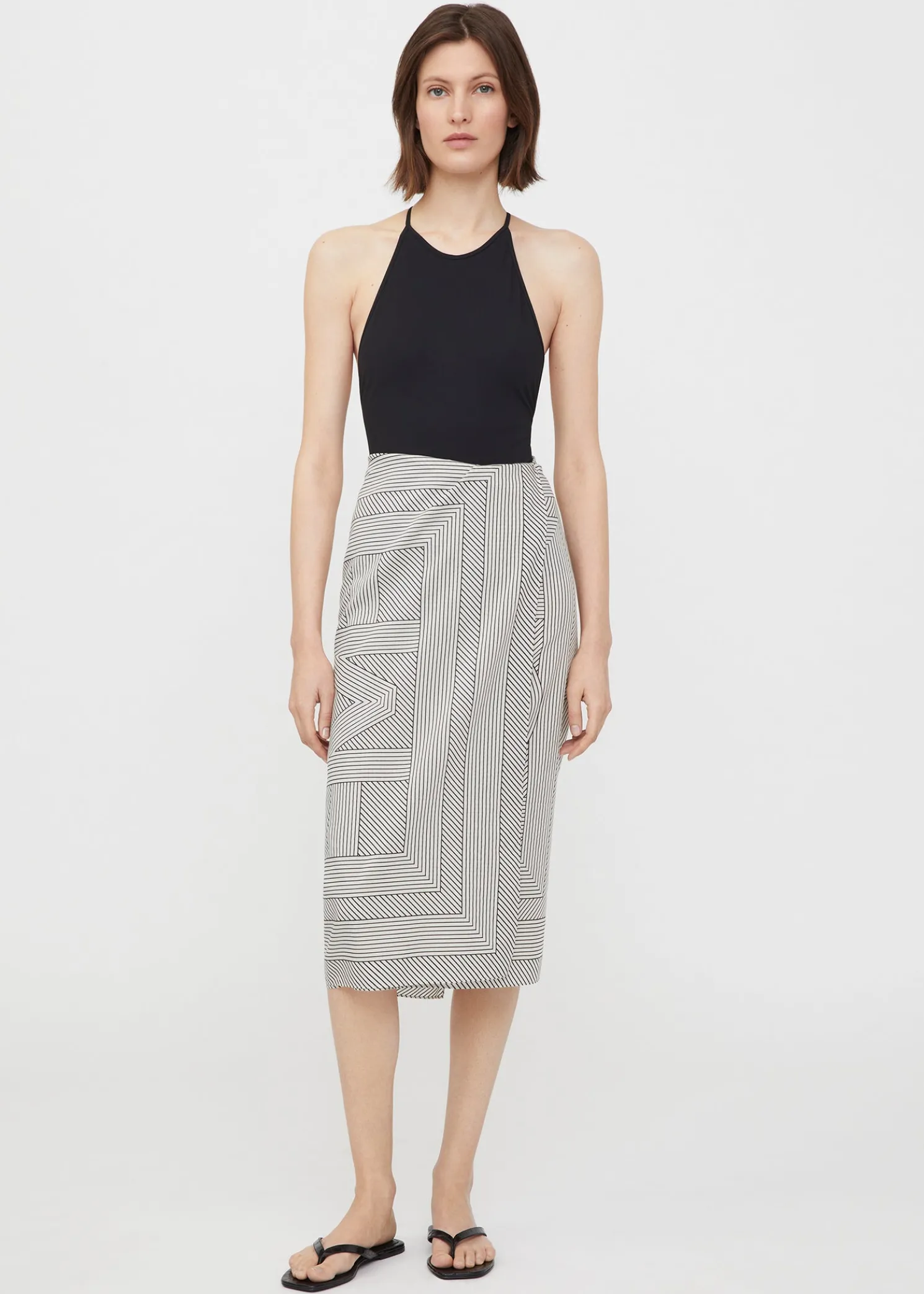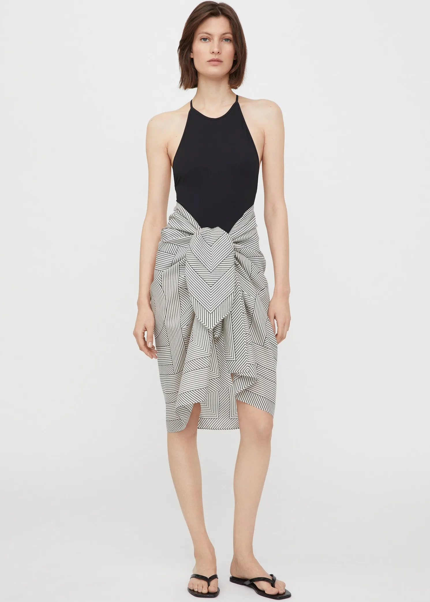 TOTEME beach sarong made from organic cotton blended with silk yarns. It has a rectangular shape printed with the striped monogram pattern, and measures 156x80cm. Wrap it around the High neck swimsuit by the pool.