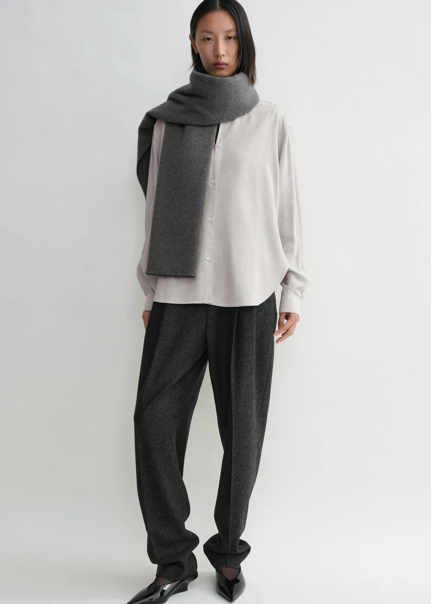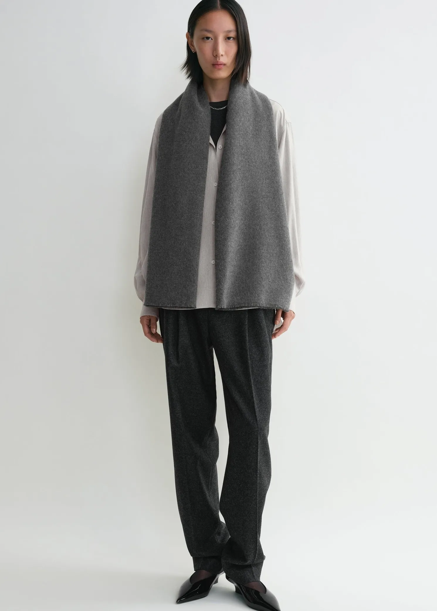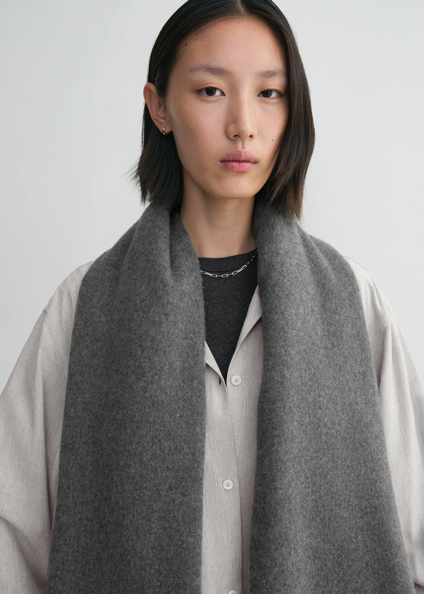 A wider, shorter iteration of TOTEME’s classic wool scarf outlined with a 170x70cm frame. It is crafted in Italy from light and soft virgin wool finished with fringed edges, adding subtle texture to classic winter edits.